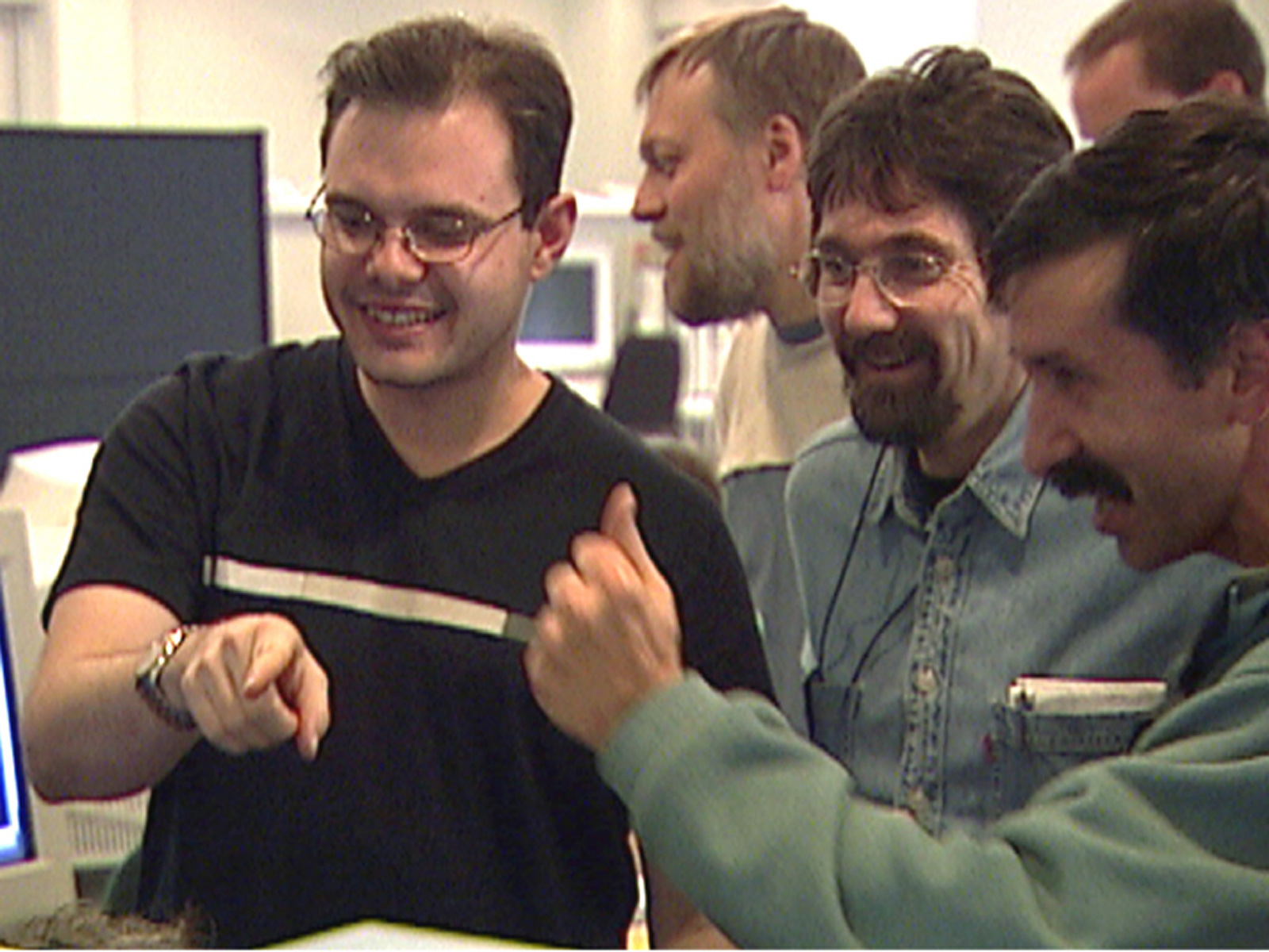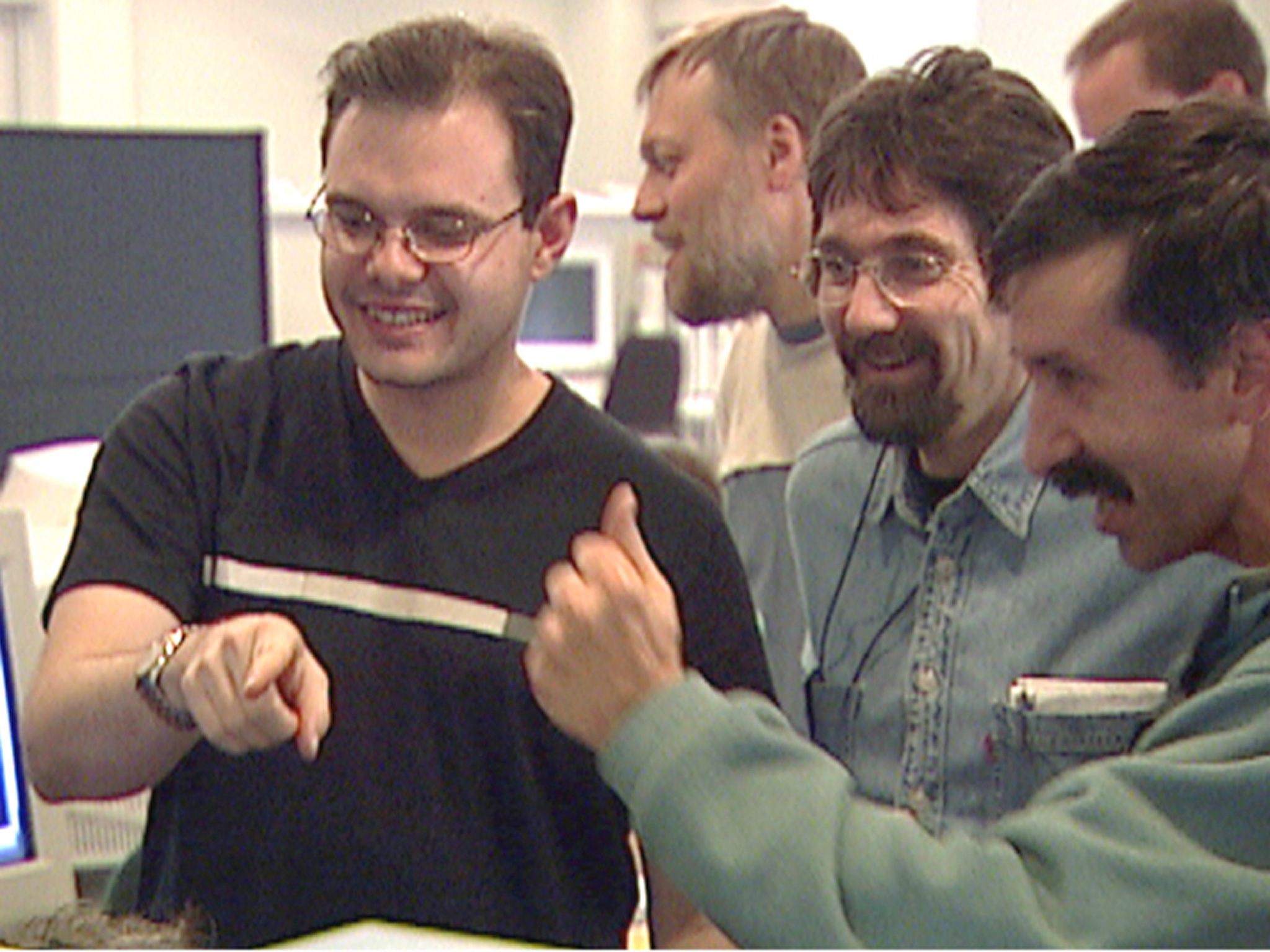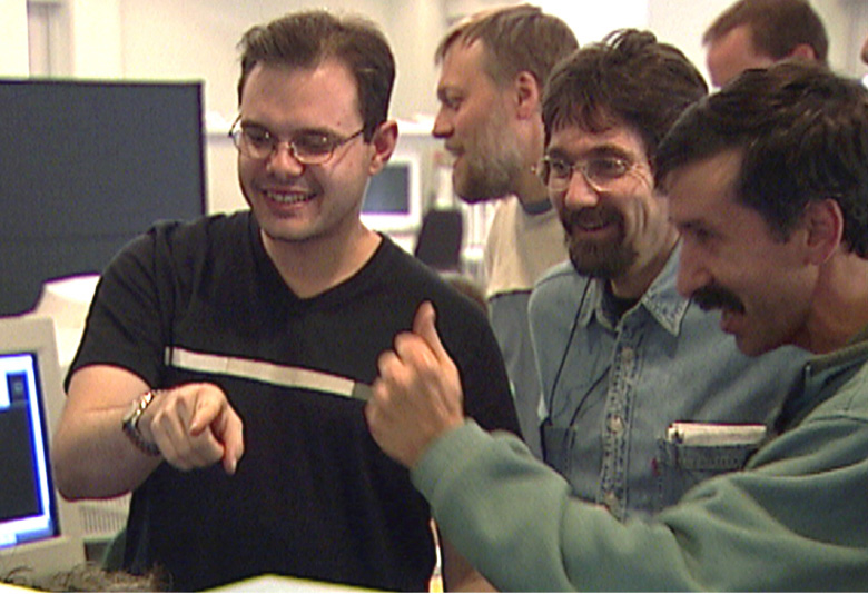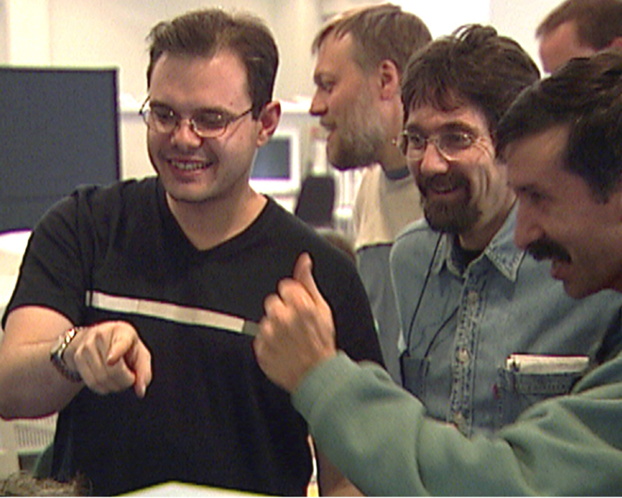 Some of the NAOS-CONICA team members in the VLT Control Room at the moment of "First Light" in the night between November 25-26, 2001. From left to right: Thierry Fusco (ONERA), Clemens Storz (MPIA), Robin Arsenault (ESO), Gerard Rousset (ONERA).