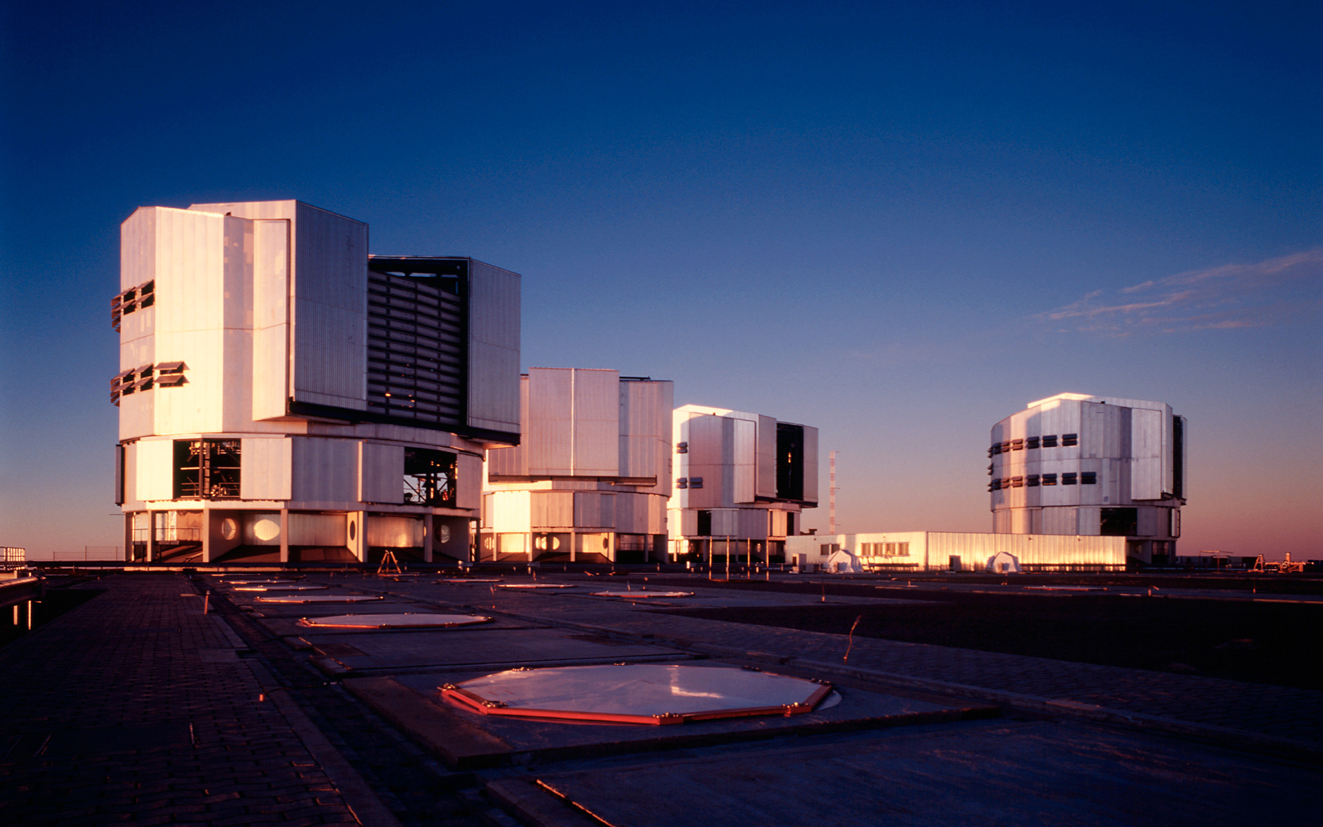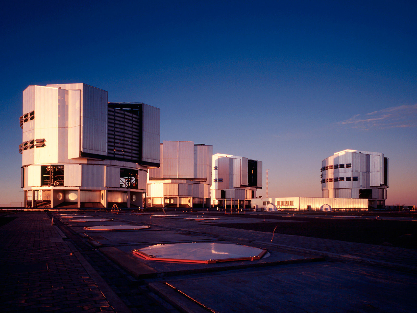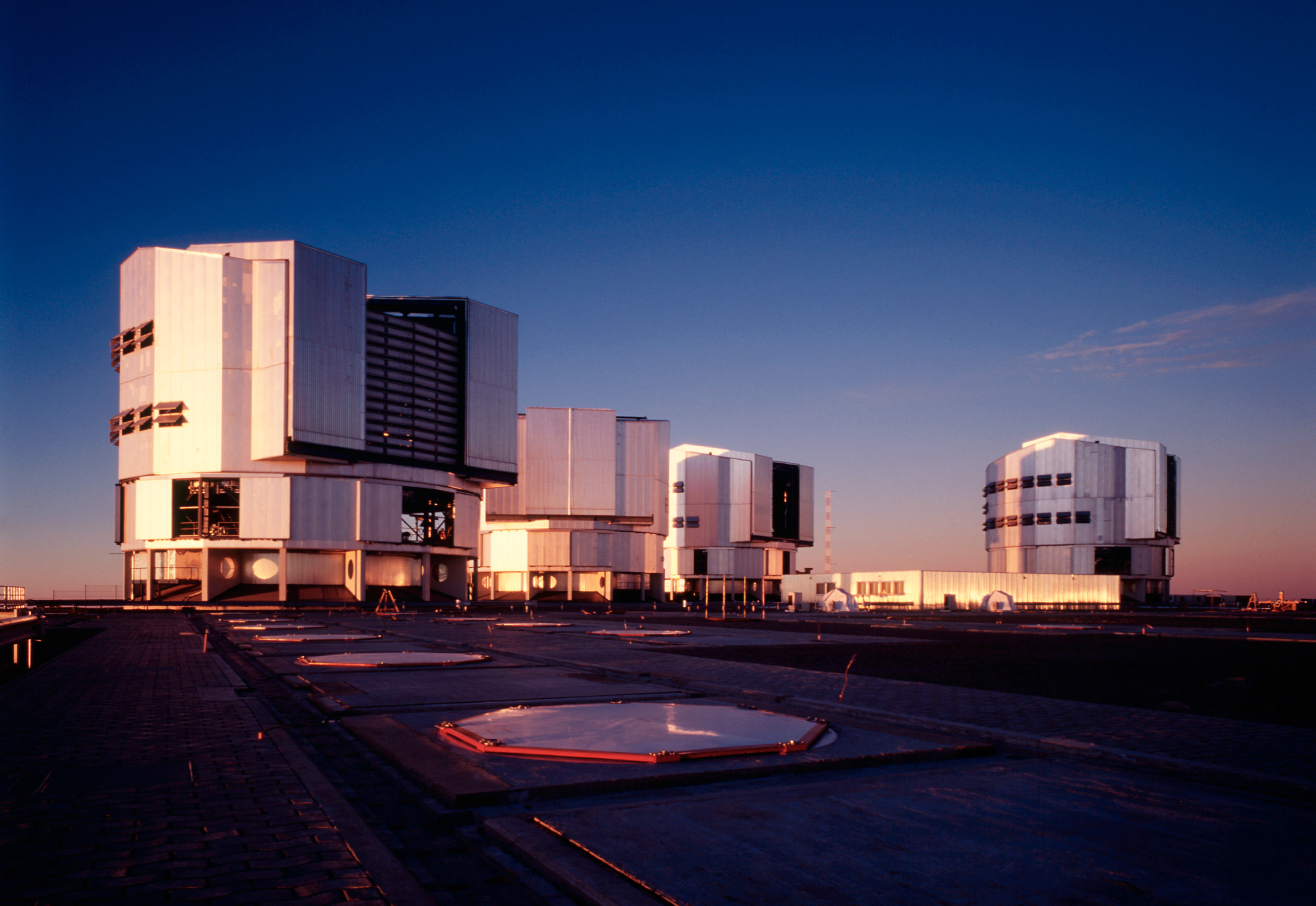 A view of the upper platform at the ESO Paranal Observatory with the four enclosures for the VLT 8.2-m Unit Telescopes and the partly subterranean Interferometric Laboratory (at centre). YEPUN (UT4) is housed in the enclosure to the right. This photo was obtained in the evening of November 25, 2001, some hours before "First Light" was achieved for the new NAOS-CONICA instrument, mounted at that telescope.