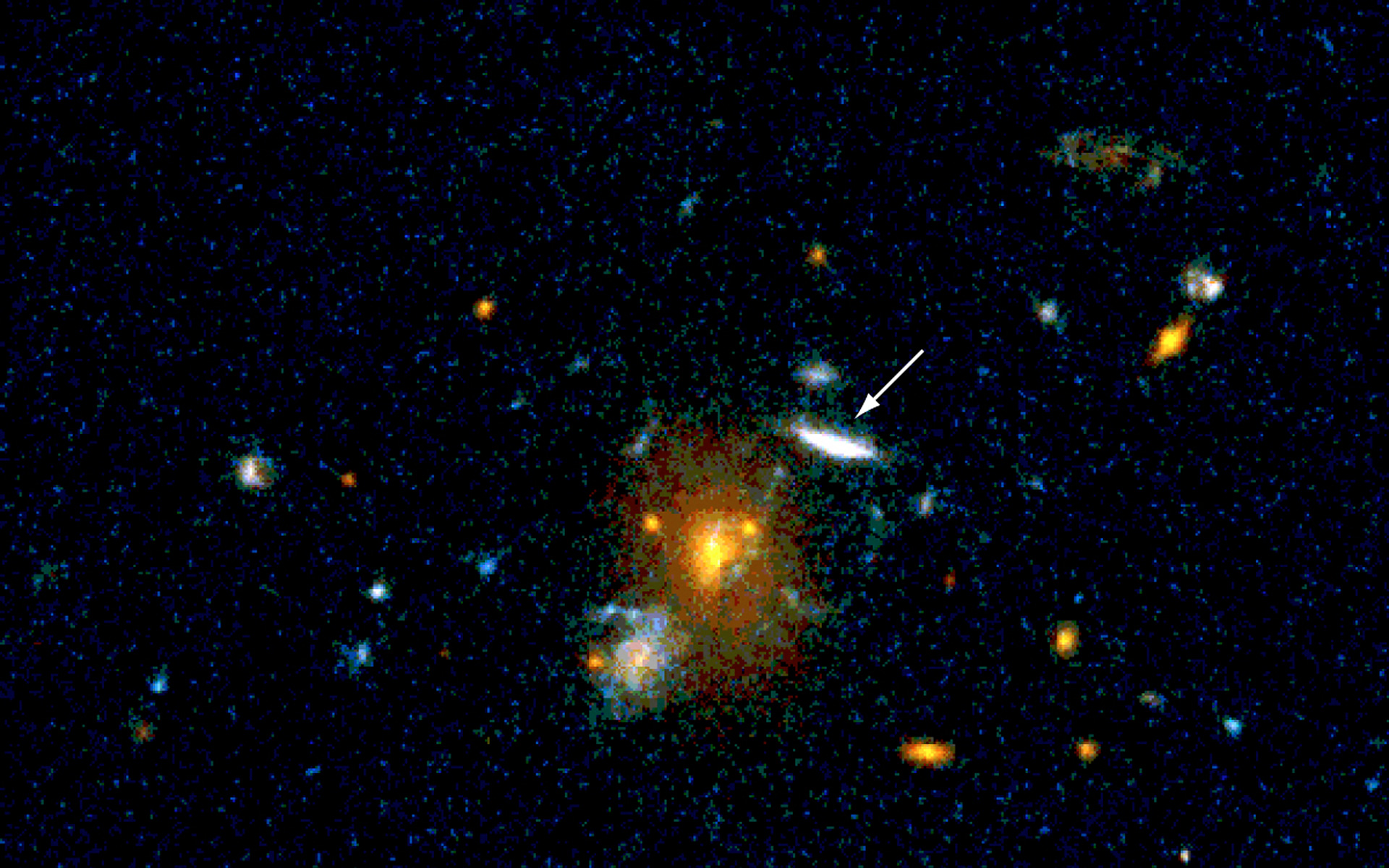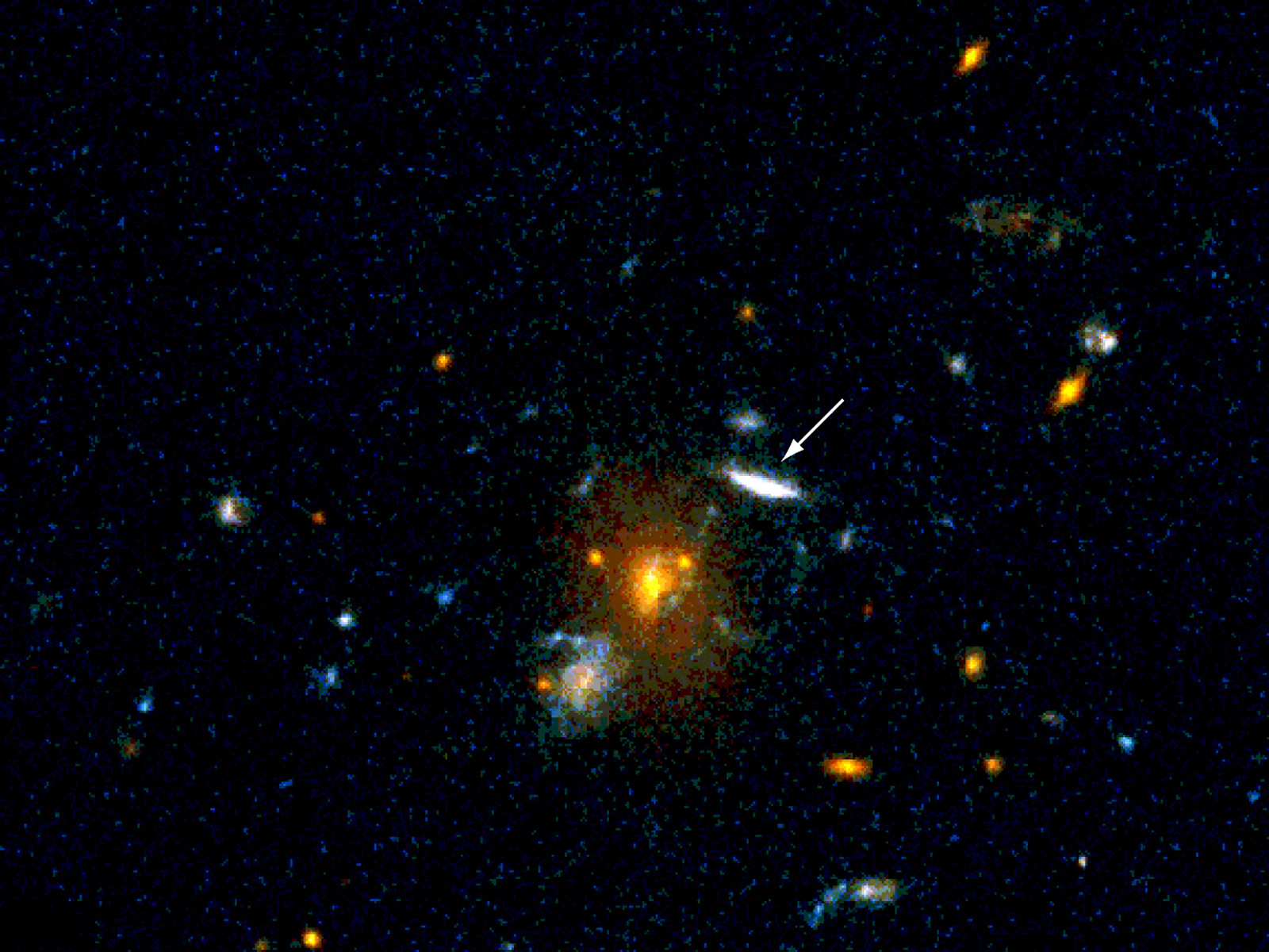 The image reveals the gravitationally amplified, elongated image of the very distant, 20.6-mag galaxy MS 1512-cB58 (indicated with an arrow). The photo is is a reproduction of a composite image of the field around the distant cluster of galaxies MS 1512+36 (redshift 0.37), obtained with the WFPC2 camera on the NASA/ESA Hubble Space Telescope.
