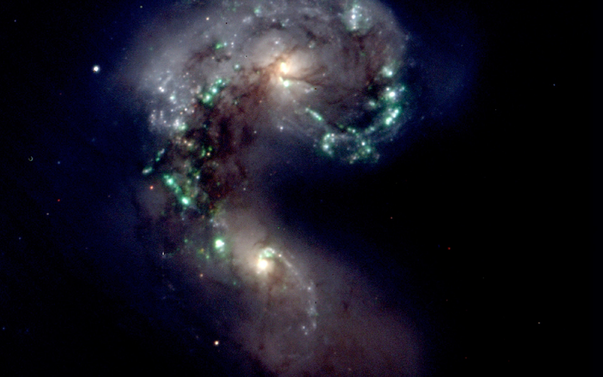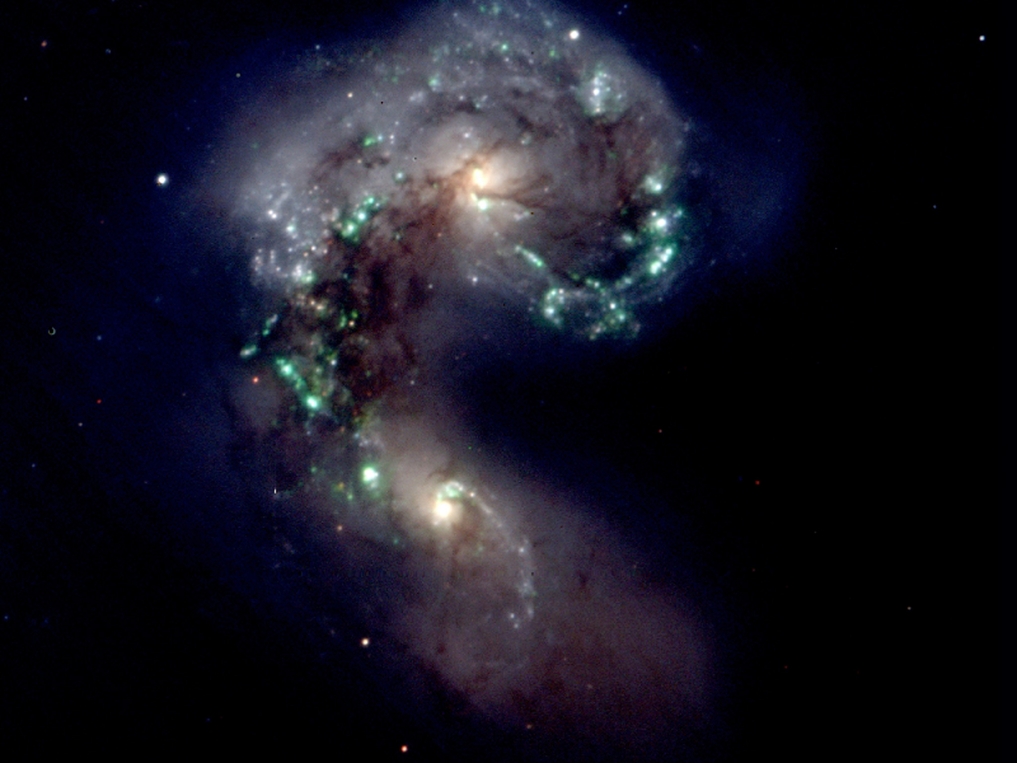 One of the first images from the new VIMOS facility, obtained right after the moment of "first light" on Ferbruary 26, 2002. It shows the famous "Antennae Galaxies" (NGC 4038/9), the result of a recent collision between two galaxies.