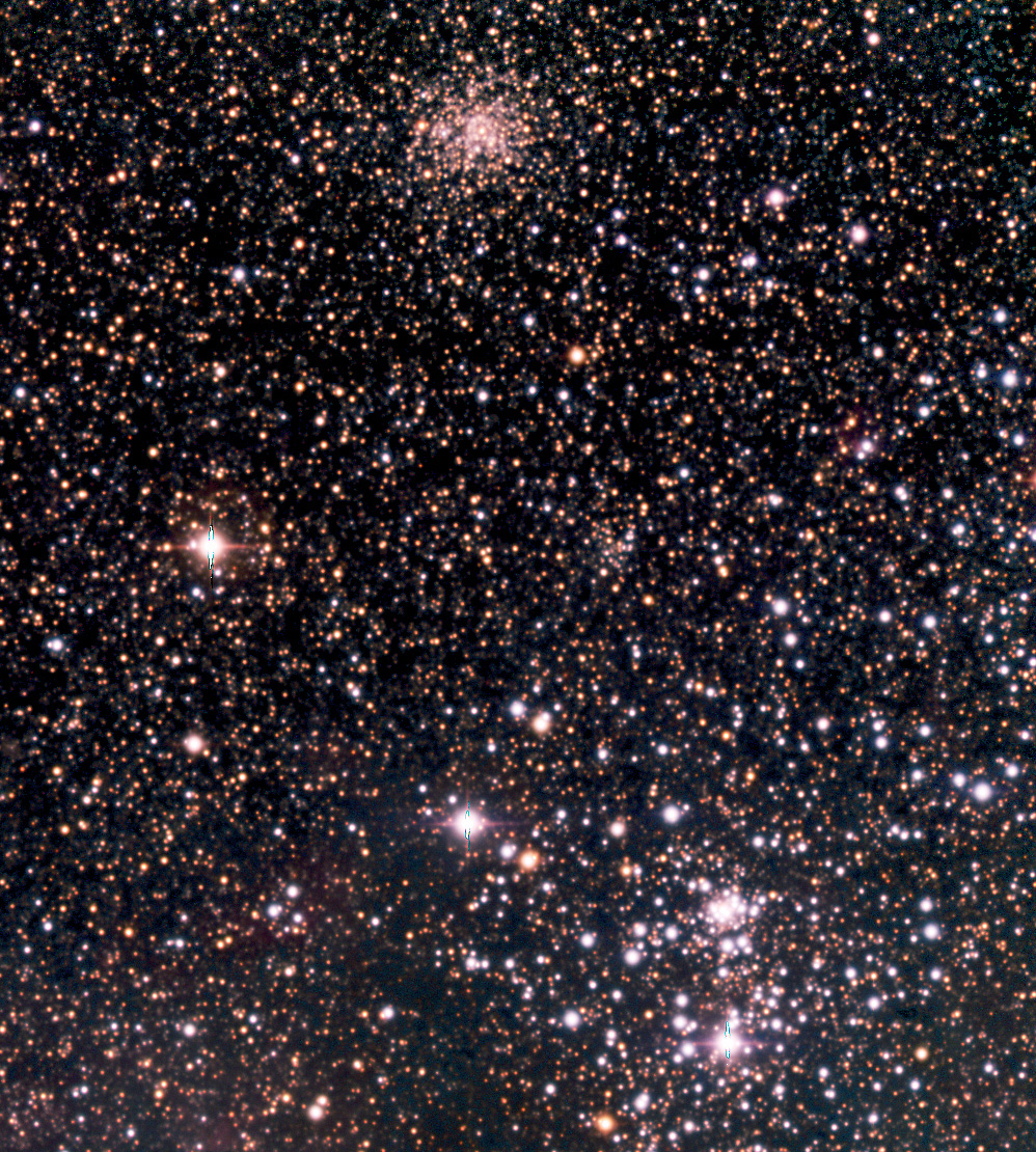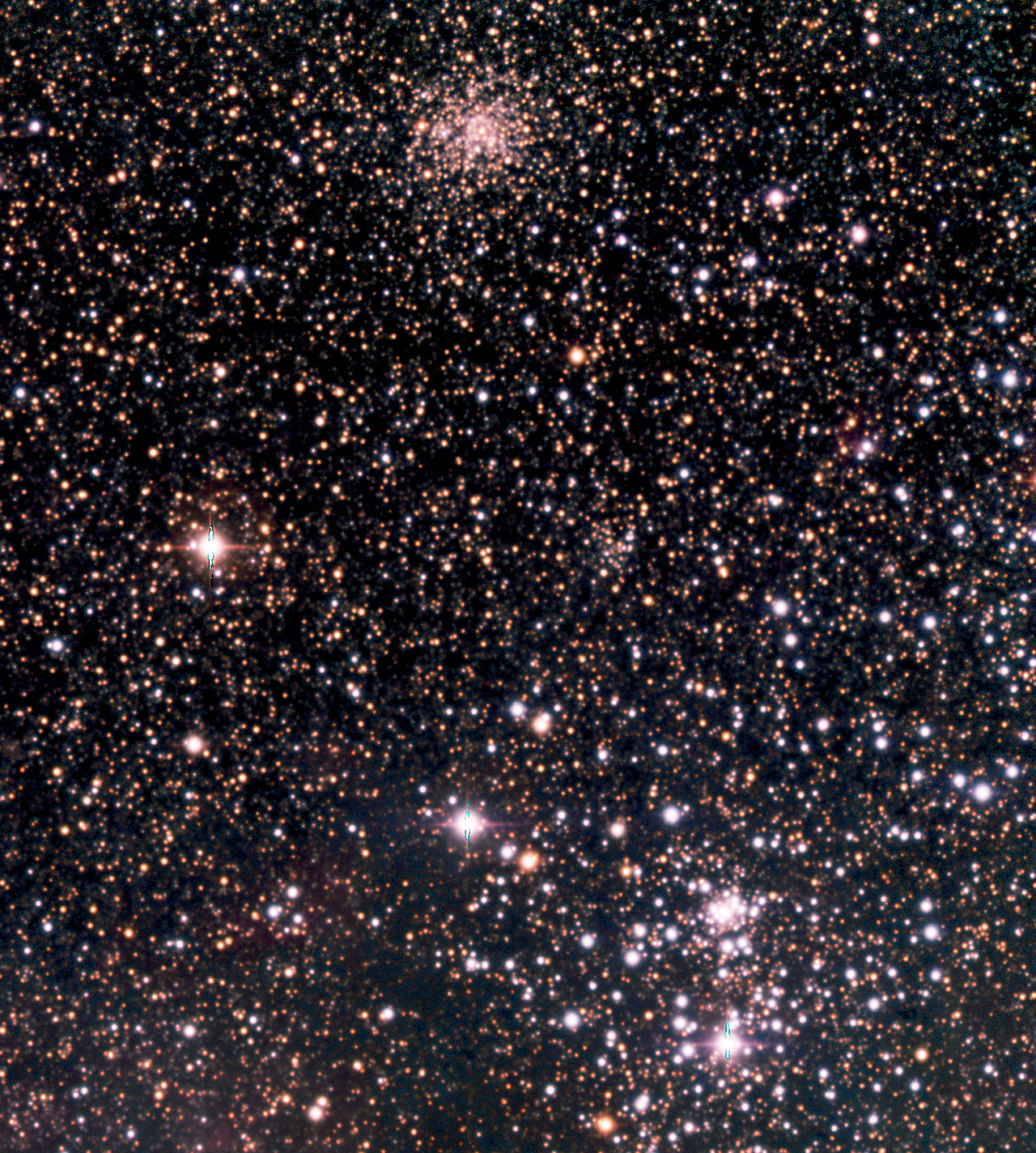 This image displays a rich field NW of the centre of the Tarantula Nebula, with the globular cluster KMHK 1137[2] near the upper edge. This image is part of a reproduction of a composite colour image of the Tarantula Nebula in the Large Magellanic Cloud (LMC) and its surroundings. The LMC is a satellite galaxy to our Milky Way system, located in the southern constellation Dorado (The Swordfish) at a distance of approximately 170,000 light-years. The image is based on 15 exposures in the visual part of the spectrum with the Wide Field Imager (WFI) camera on the 2.2-m MPG/ESO telescope at the La Silla Observatory.