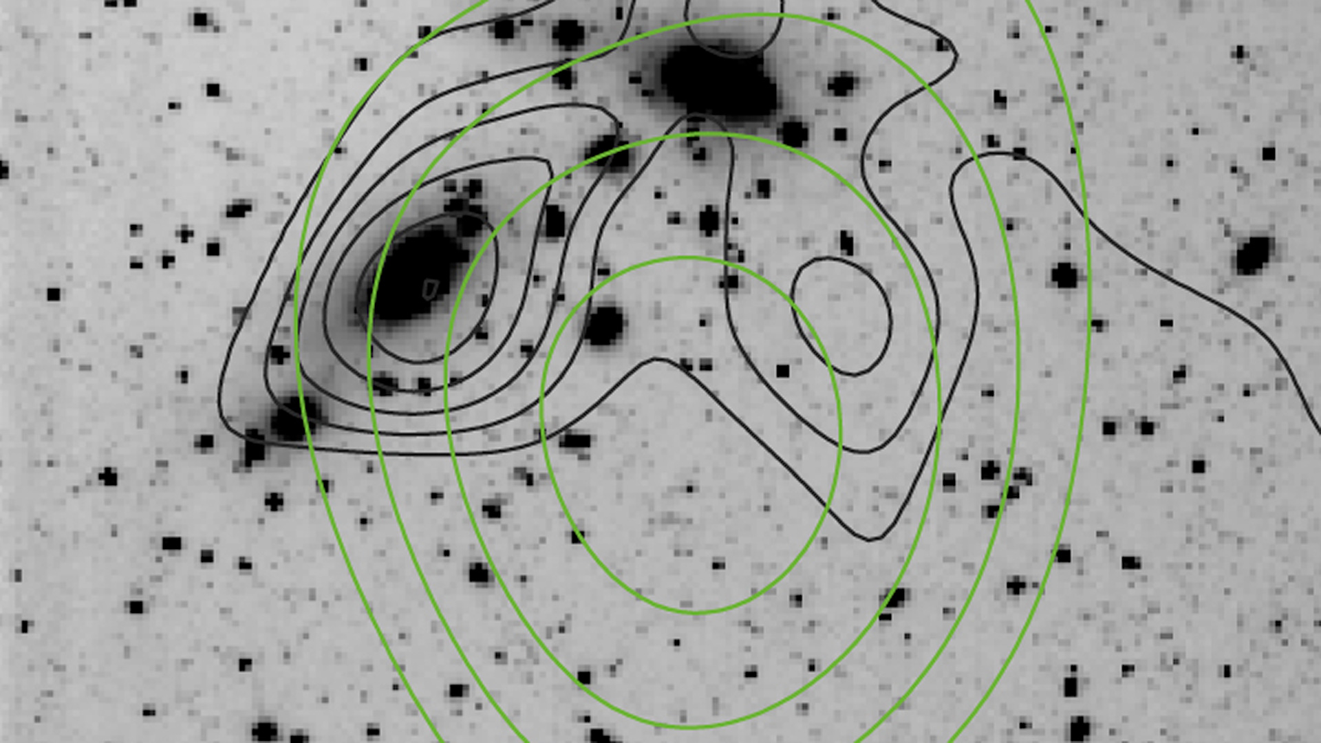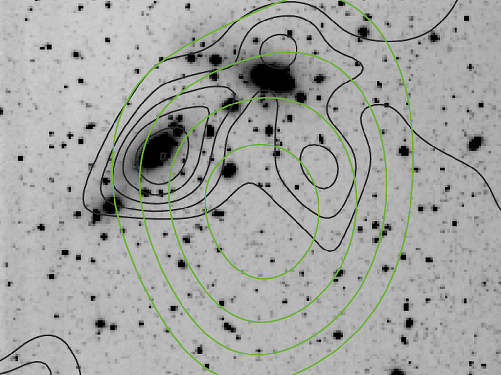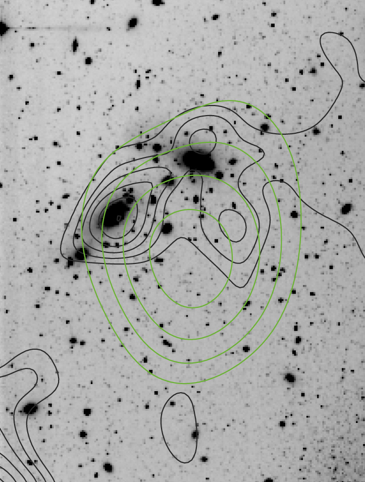 A "map" of the dark matter distribution (black contours) in the cluster of galaxies CL0053-37, as obtained from the weak lensing effects detected in the WFI images, and the X-ray flux (green contours) taken from the All-Sky Survey carried out by the ROSAT satellite observatory. The distribution of galaxies resembles the elongated, dark-matter profile. Because of ROSAT's limited image sharpness (low "angular resolution"), it cannot be entirely ruled out that the observed X-ray emission is due to an active nucleus of a galaxy in CL0053-37, or even a foreground stellar binary system in NGC 300.