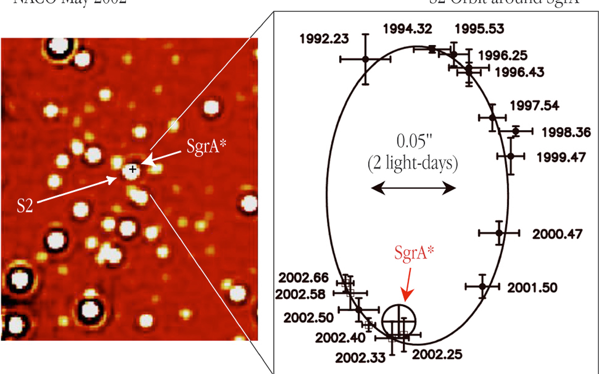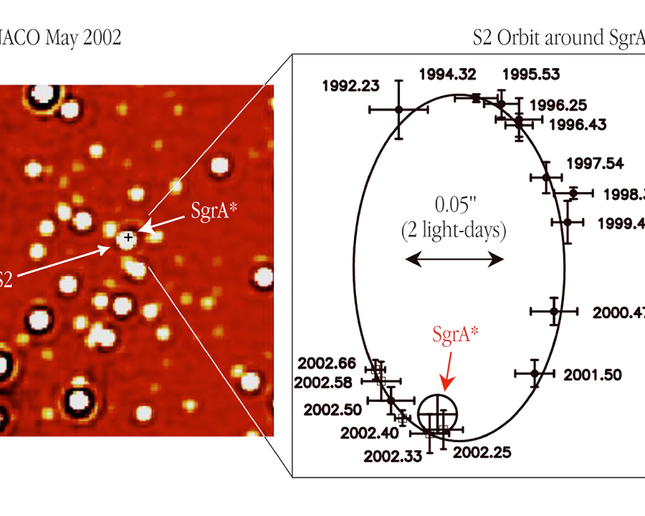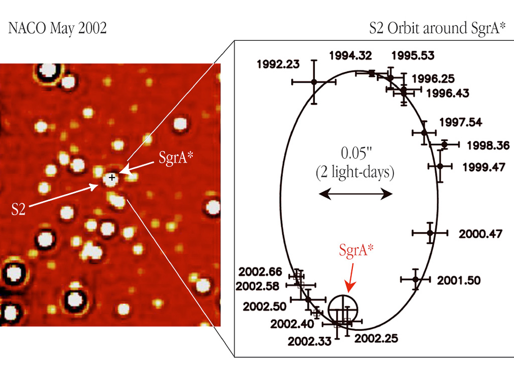 The left panel shows an infrared NACO image of a ~ 2 x 2 arcsec 2 area, centred on the position of the compact radio source "SgrA*" at the centre of the Milky Way Galaxy; it is marked by a small cross. The image was obtained in the K s -band at wavelength 2.1 µm in May 2002 and the angular resolution (image sharpness) is about 0.060 arcsec. At about the same time, the star designated "S2" came within 0.015 arcsec of the radio source. At the distance of the Milky Way Center, 1 arcsec on the sky corresponds to 46 light-days; the bar is 20 light-days long (0.44 arcsec). The right panel displays the orbit of S2 as observed between 1992 and 2002, relative to SgrA* (marked with a circle). The positions of S2 at the different epochs are indicated by crosses with the dates (expressed in fractions of the year) shown at each point. The size of the crosses indicates the measurement errors. The solid curve is the best-fitting elliptical orbit - one of the foci is at the position of SgrA* . The 2002 data points come from NACO observations done during the early commissioning, fine adjustement, and Science Verification phases for this instrument