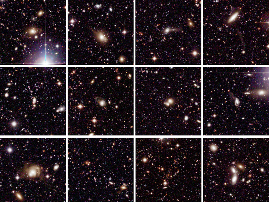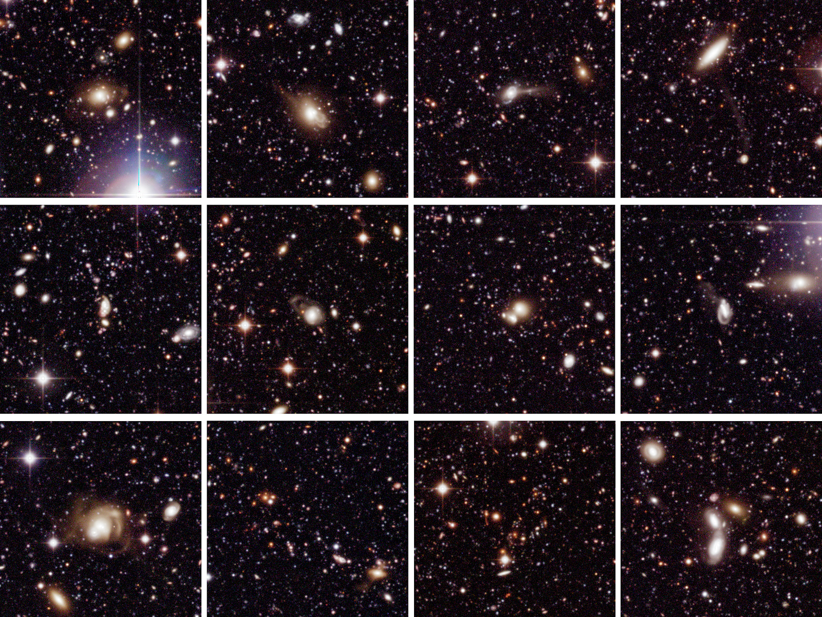 Collection of twelve subfields from the full wide field imager Chandra Deep Field South (WFI CDF-S), centred on (pairs or groups of) galaxies. Each of the subfields measures 2.5 x 2.5 square arcminutes (635 x 658 pix 2 ; 1 pixel = 0.238 arcsec). North is up and East is left.