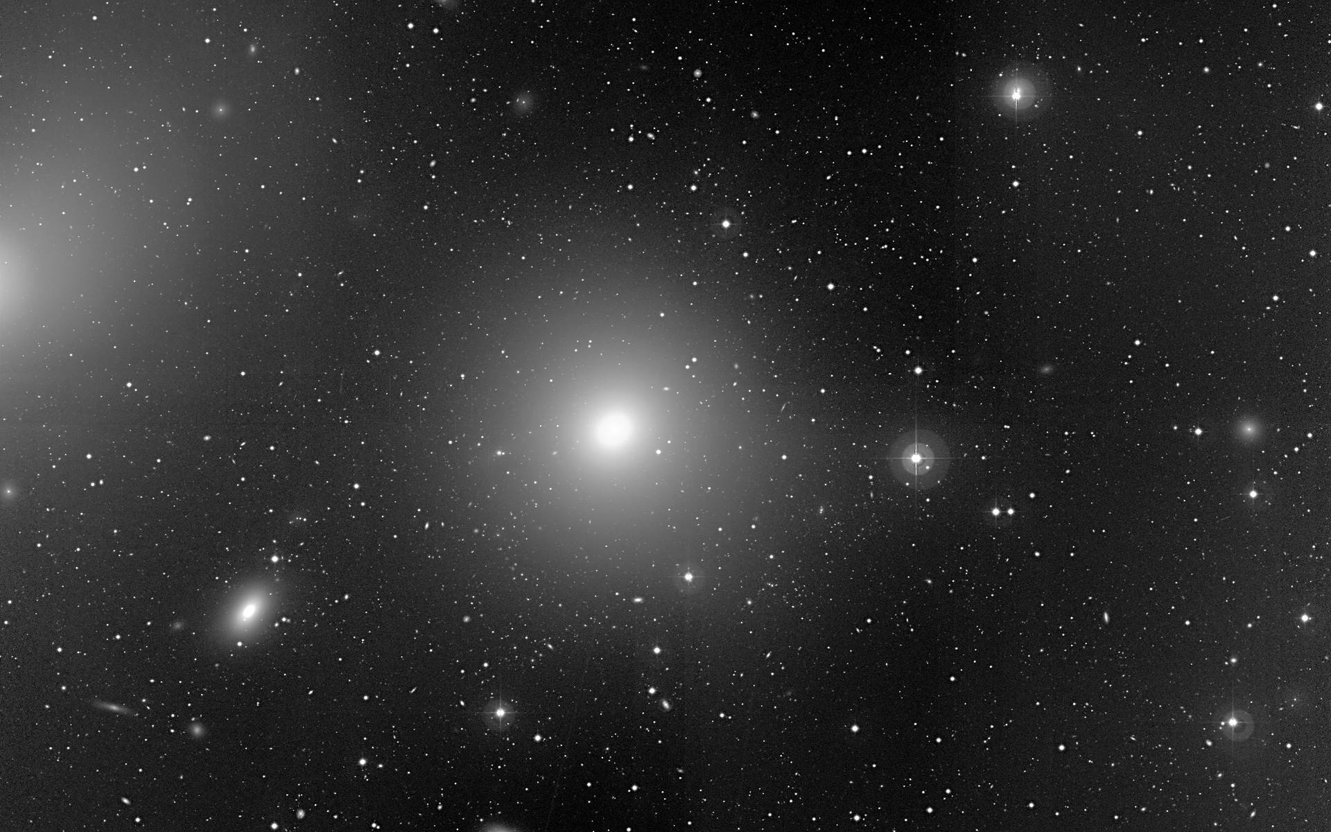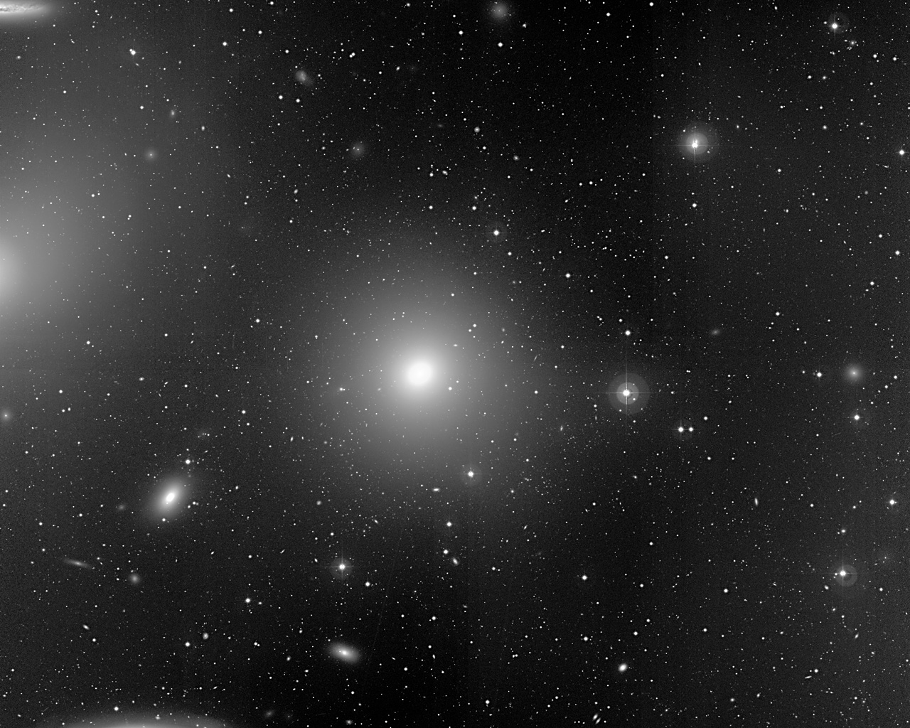 Sky field near some of the brighter galaxies in the Virgo Cluster. This image was obtained in April 2000 with the Wide Field Imager (WFI) at the La Silla Observatory. The large elliptical galaxy at the centre is Messier 84; the elongated image of NGC 4388 (an active spiral galaxy, seen from the side) is in the lower left corner. The field measures 16.9 x 15.7 square arcmin.