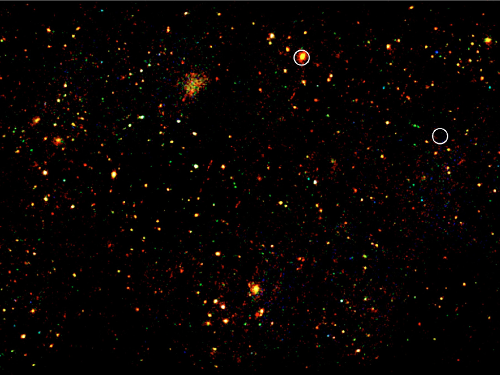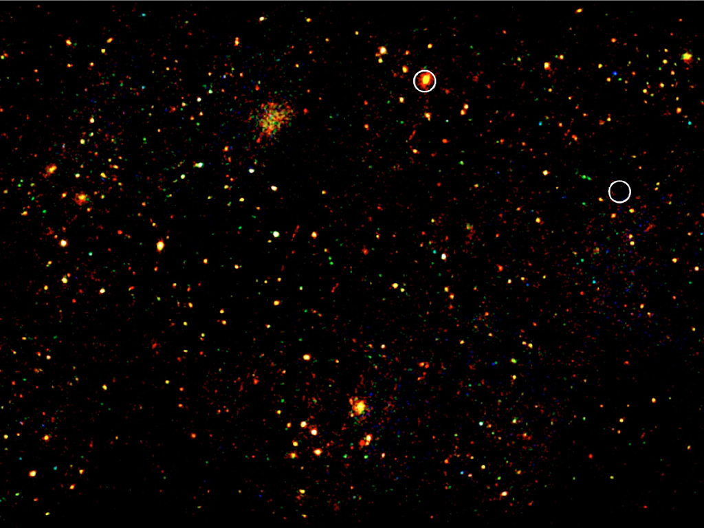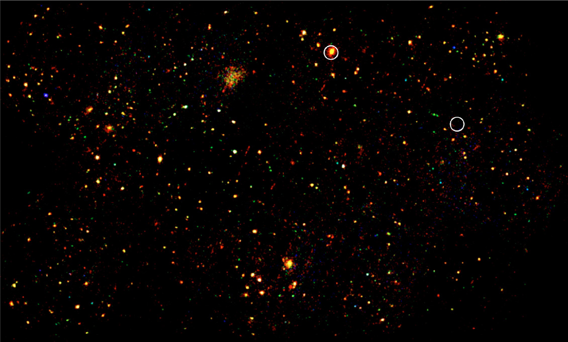 First image from the XMM-LSS X-Ray survey. It is actually a combination of fourteen separate "pointings" of this space observatory. It represents a region of the sky eight times larger than the full Moon and contains around 25 clusters. The circles represent the X-Ray sources previously known from the 1991 ROSAT All-Sky Survey.