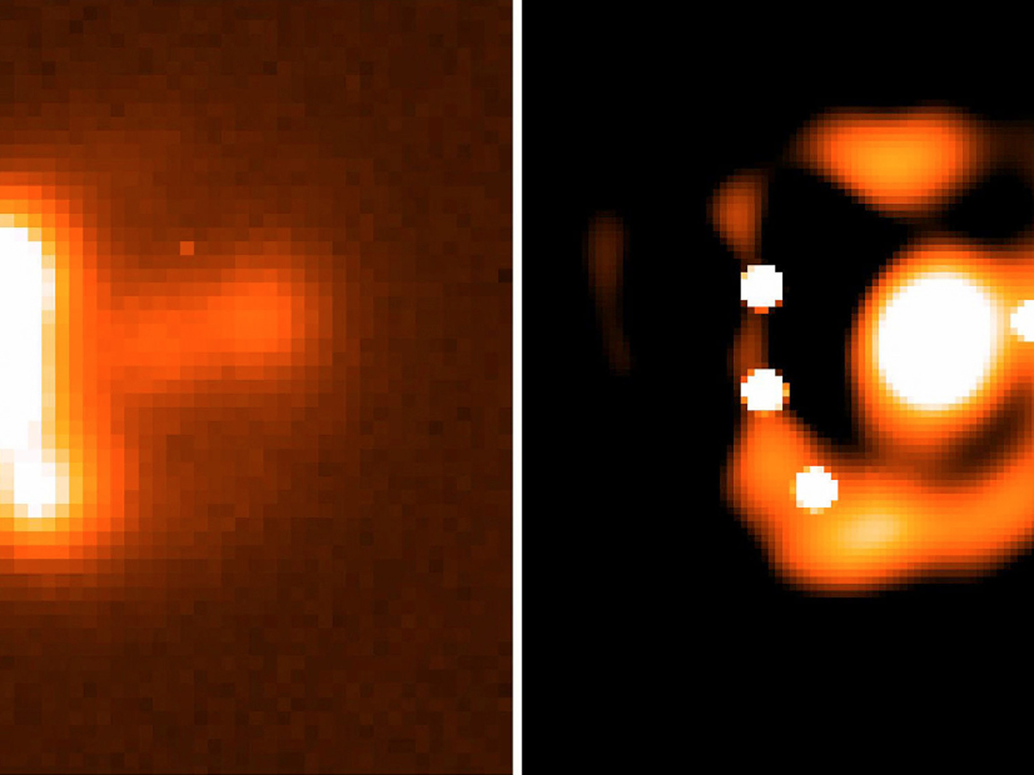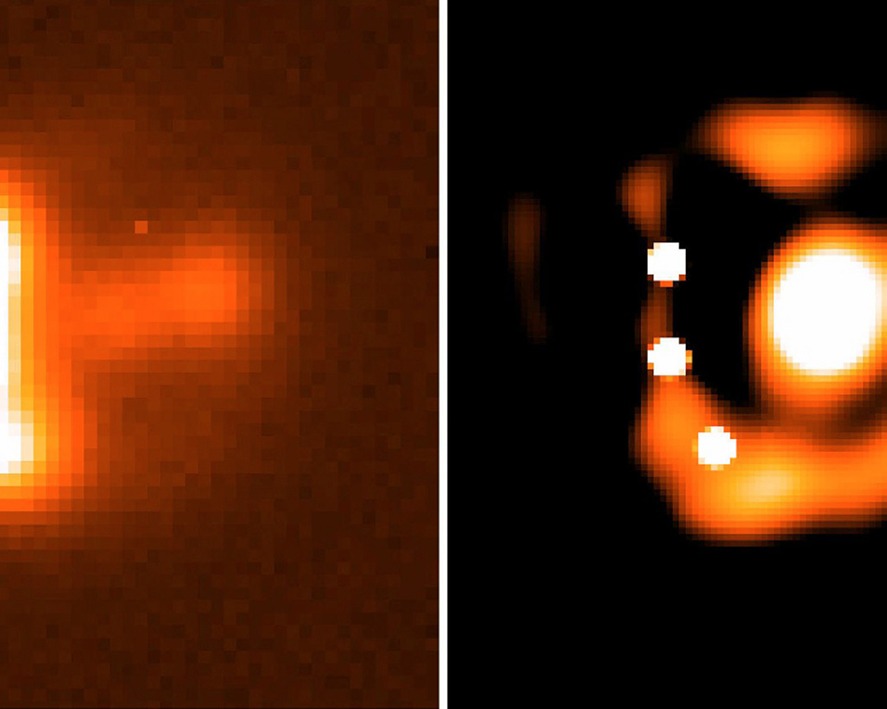 Image of the newly discovered gravitational lens system RXS J1131-1231 recorded by the EFOSC2 instrument on the ESO 3.6-m telescope (left panel). Deconvolution ("image sharpening", right panel) allows a better view of the four star-like components (the four images of the same distant quasar), the Einstein ring (the elongated image of the quasar's host galaxy) and the lensing galaxy (the central bright diffuse image).