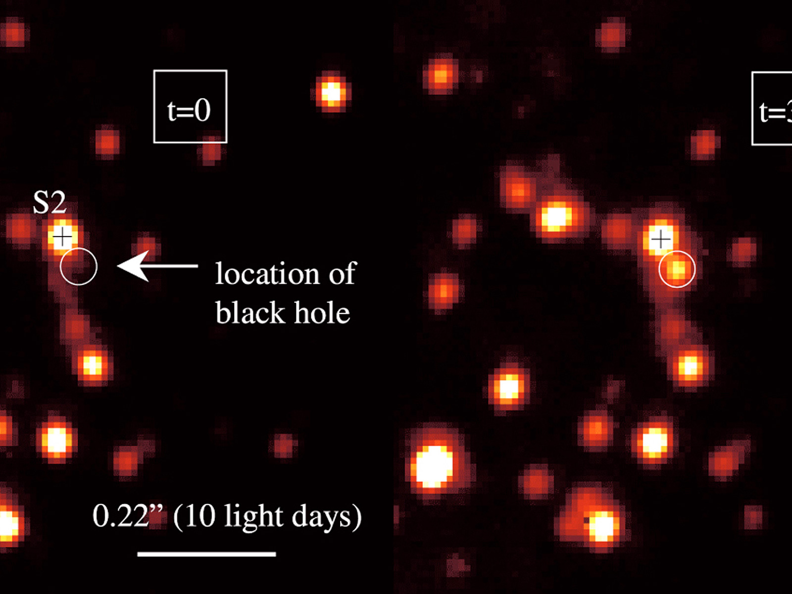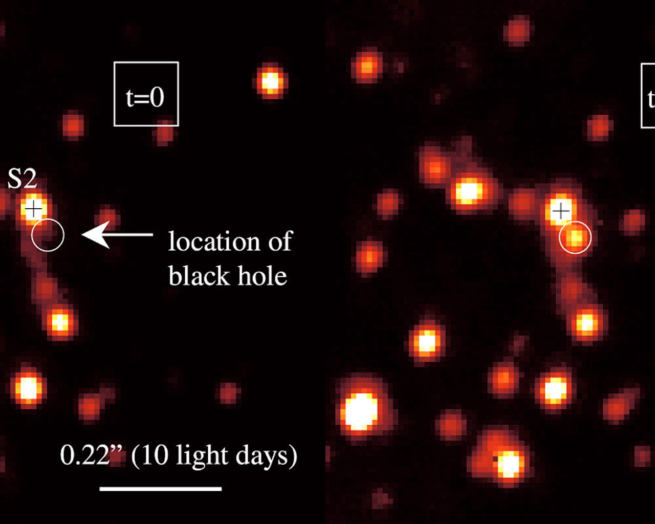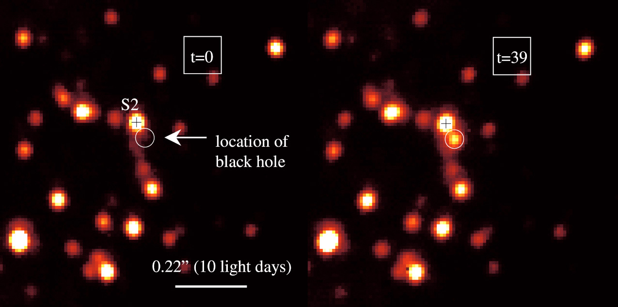 Detection of a powerful flare from the centre of the Milky Way galaxy. These and other adaptive optics (AO) images (with resolution 0.040 arcsec in the near-infrared H-band at wavelength 1.65 µm) of the central region of the Milky Way were obtained with the NACO imager on the 8.2-m VLT YEPUN telescope at the ESO Paranal Observatory on May 9, 2003. The image covers a sky area of about 1 x 1 arcsec, corresponding to about 45 light-days at the distance of the Galactic Centre. The time (in minutes from the beginning of the data set at 6h59m24s (UT) on May 9, 2003) is shown at the upper right of each image. North is up and East to the left. The position of the 15-year orbiting star S2 is marked by a cross and the astrometric location of the black hole is indicated by a circle.