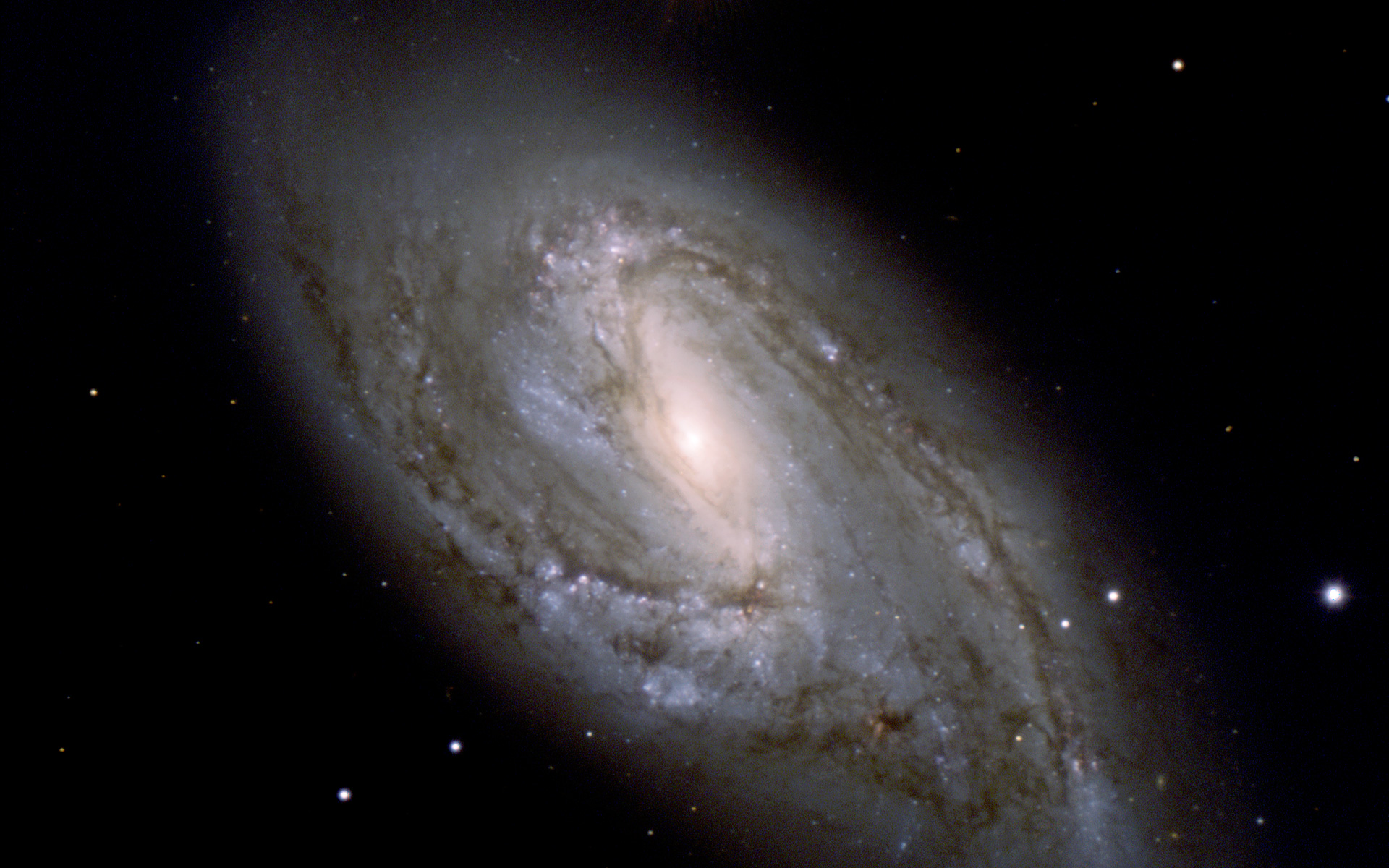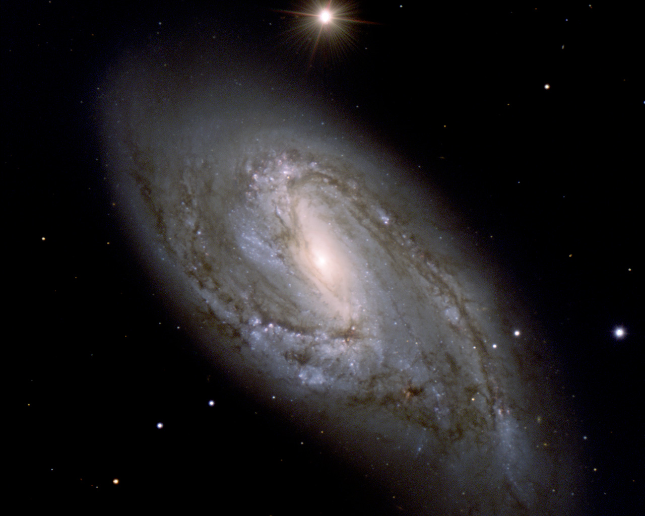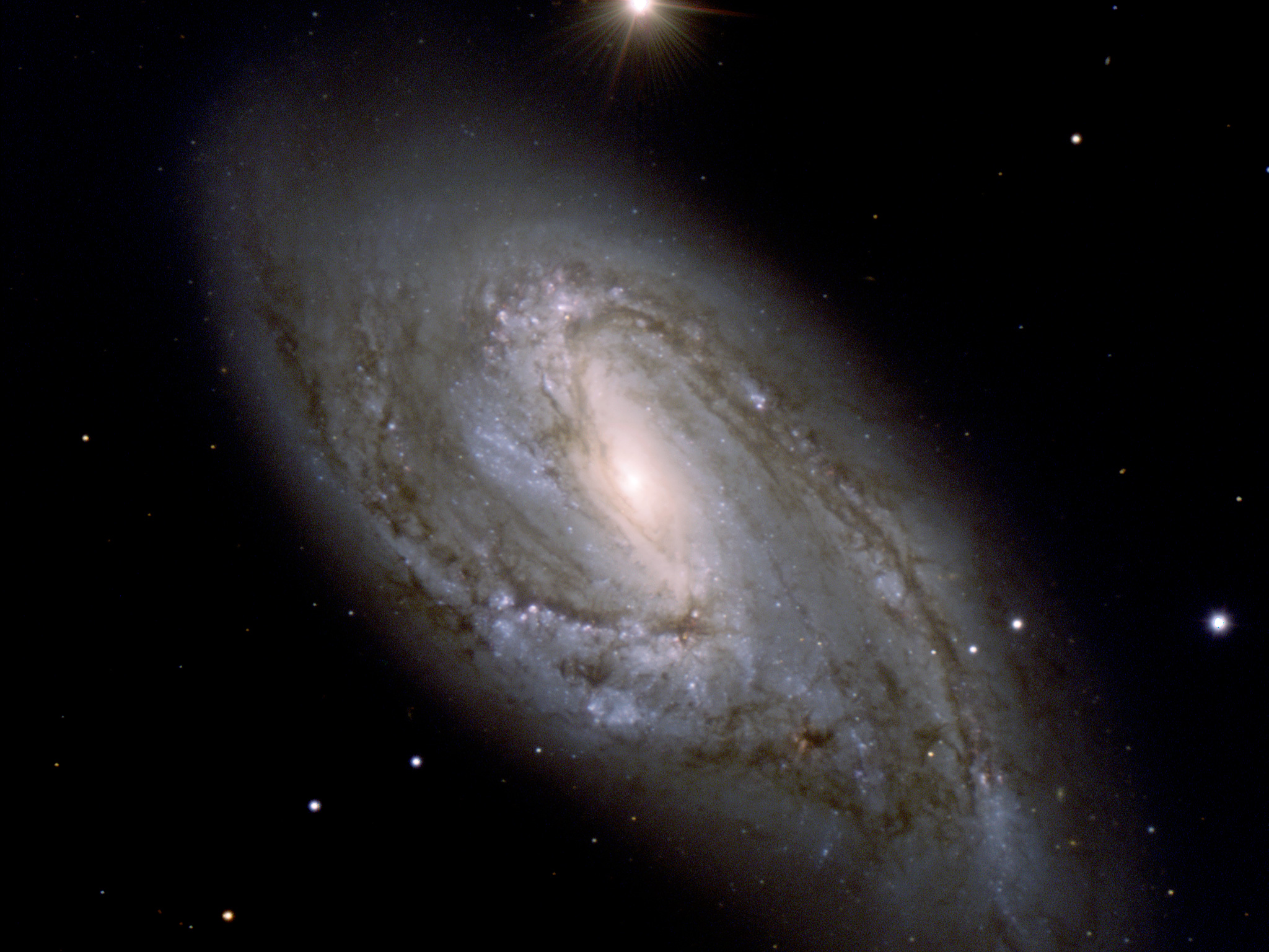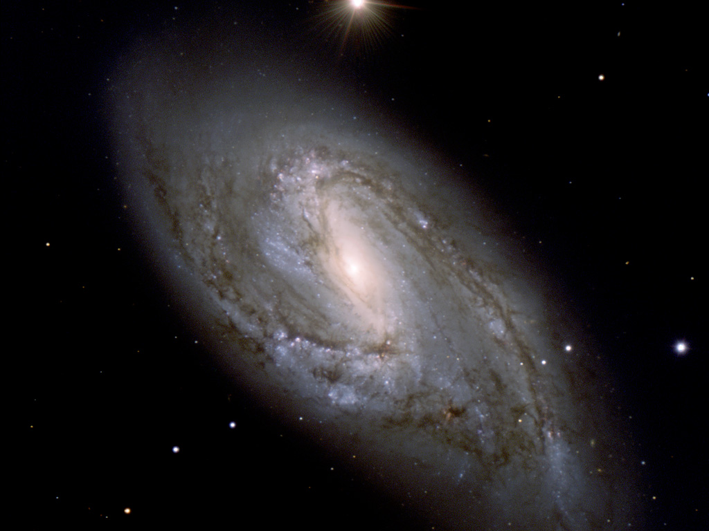 This photo of the spiral galaxy M 66 (or NGC 3627) was obtained with the FORS1 and FORS2 multi-mode instruments (at VLT MELIPAL and YEPUN, respectively) on December 16-18, 2001. It is a composite of three exposures in different wavebands. North is towards upper left, West towards upper right.