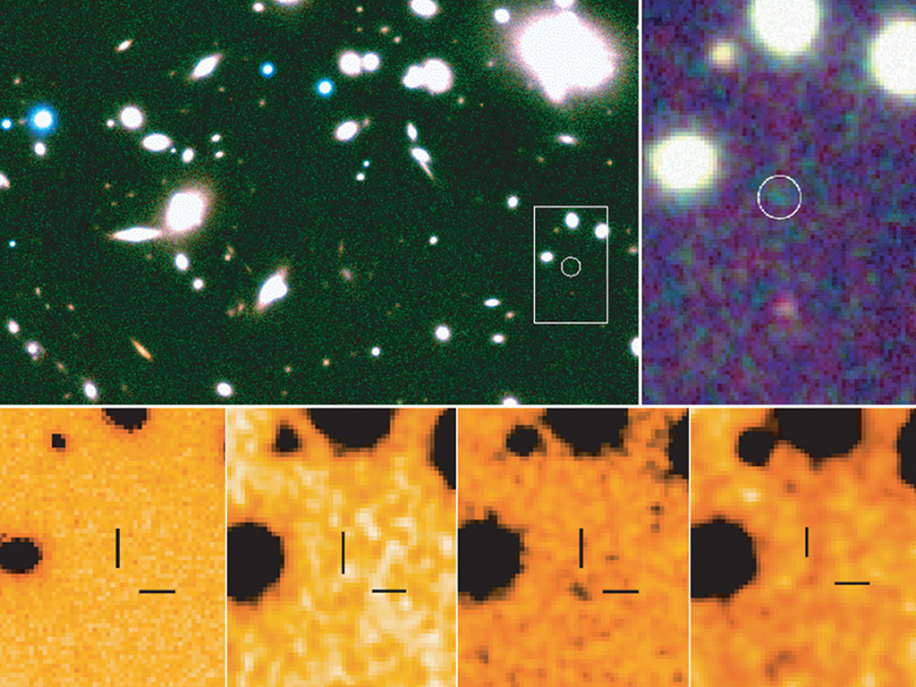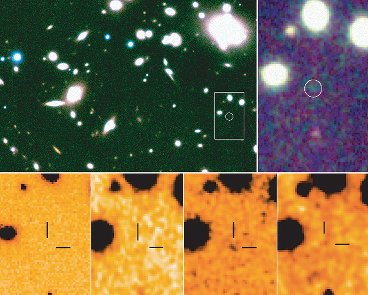 SAAC image in the near-infrared of the core of the lensing cluster Abell 1835 (upper) with the location of the galaxy Abell 1835 IR1916 (white circle). The thumbnail images at the bottom show the images of the remote galaxy in the visible R-band (HST-WFPC image) and in the J-, H-, and K-bands. The fact that the galaxy is not detected in the visible image but present in the others - and more so in the H-band - is an indication that this galaxy has a redshift around 10. Note: Since these results have been published several further investigations by several independent teams have been undertaken. A deep observation with the Gemini-North Near-Infrared Imager (NIRI) has not detected the source to fainter magnitude limits than in the ISAAC data. Also, a deep V-band image taken with FORS does not show the object to be present. The status of this object is hence currently unresolved.