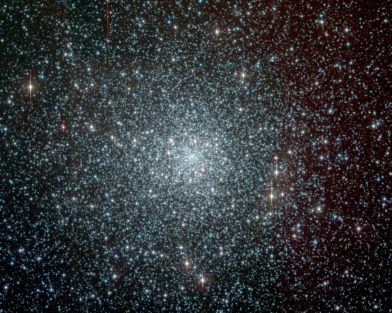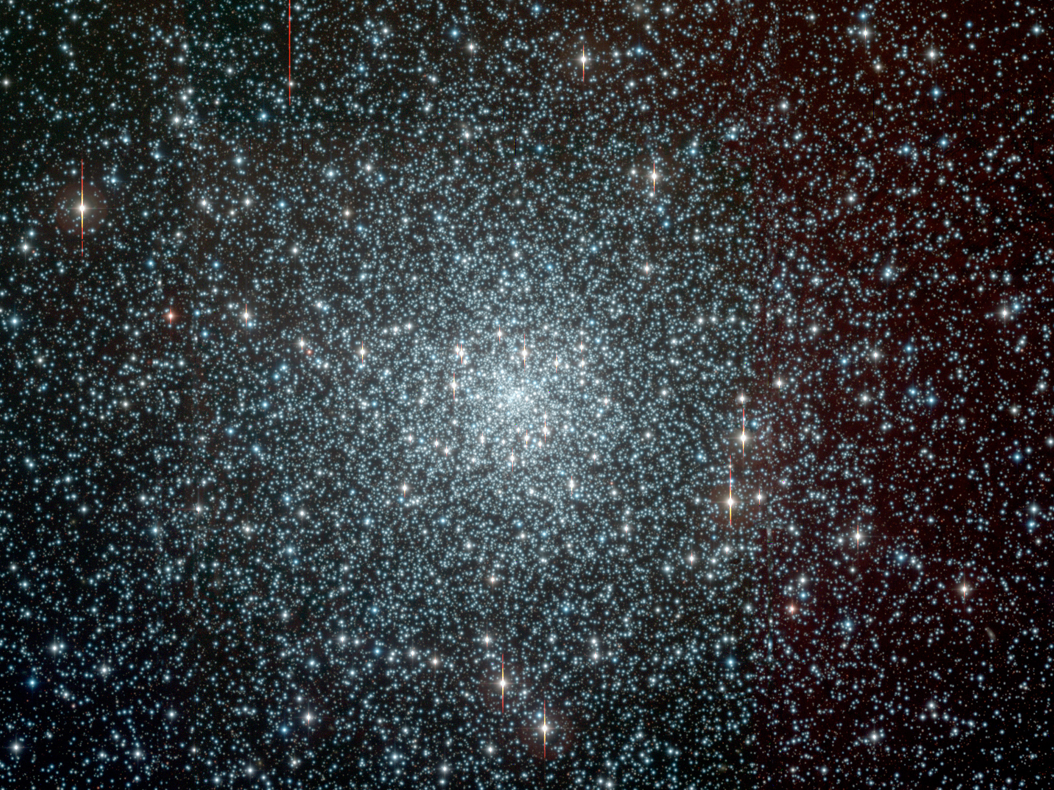 The globular cluster NGC 6397, located at a distance of approx. 7,200 light-years in the southern constellation Ara. It has undergone a "core collapse" and the central area is very dense. It contains about 400,000 stars and its age (based on evolutionary models) is 13,400 ± 800 million years. The photo is a composite of exposures in the B-, V- and I-bands obtained in the frame of the Pilot Stellar Survey with the Wide-Field-Imager (WFI) camera at the 2.2-m ESO/MPI telescope at the ESO La Silla Observatory. It was prepared and provided by the ESO Imaging Survey team. The spikes seen at some of the brighter stars are caused by the effect of overexposure (CCD "bleeding").