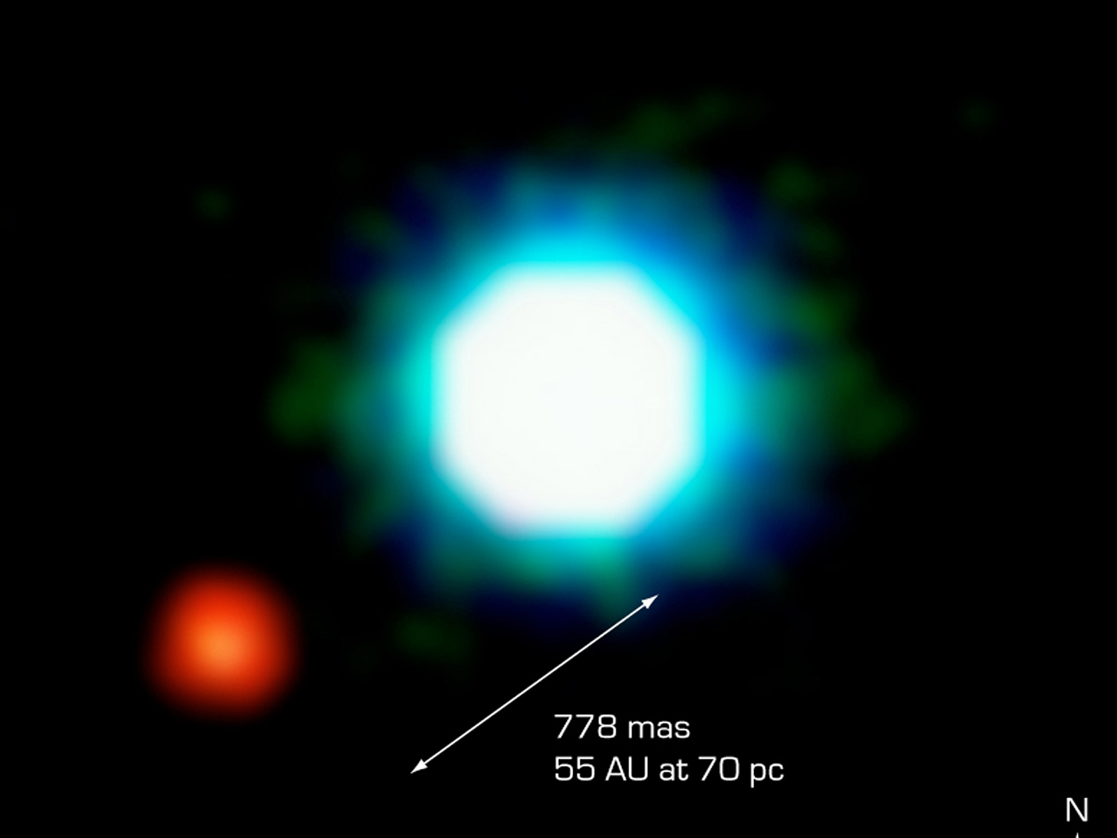 This is a composite image of the brown dwarf object 2M1207 (centre) and the fainter object seen near it, at an angular distance of 778 milliarcsec. Designated "Giant Planet Candidate Companion" by the discoverers, it may represent the first image of an exoplanet. Further observations, in particular of its motion in the sky relative to 2M1207 are needed to ascertain its true nature. The photo is based on three near-infrared exposures (in the H, K and L' wavebands) with the NACO adaptive-optics facility at the 8.2-m VLT Yepun telescope at the ESO Paranal Observatory.