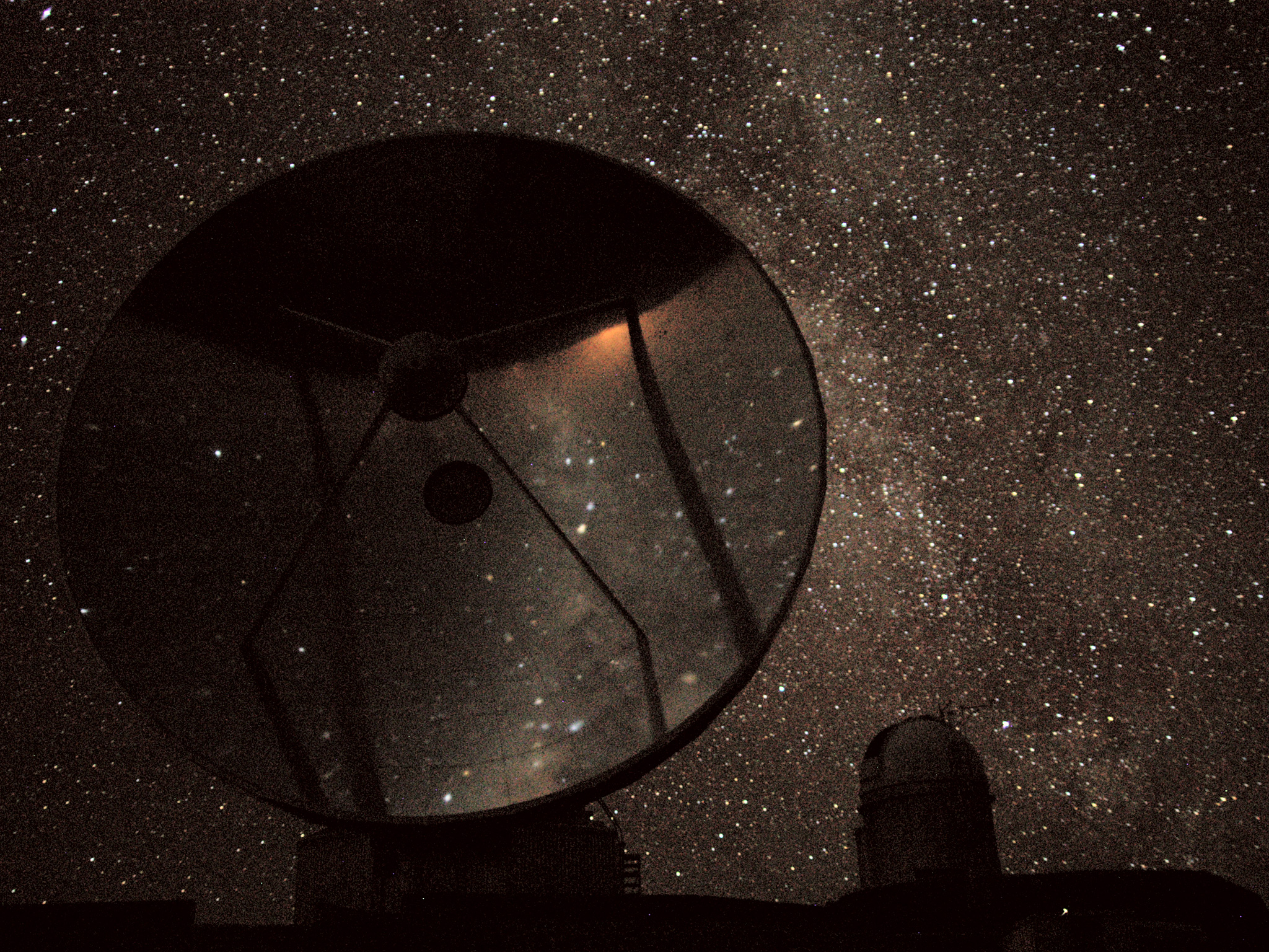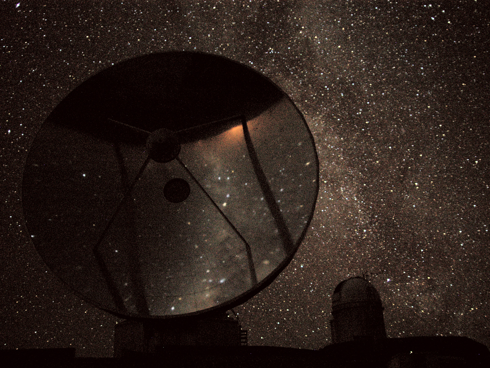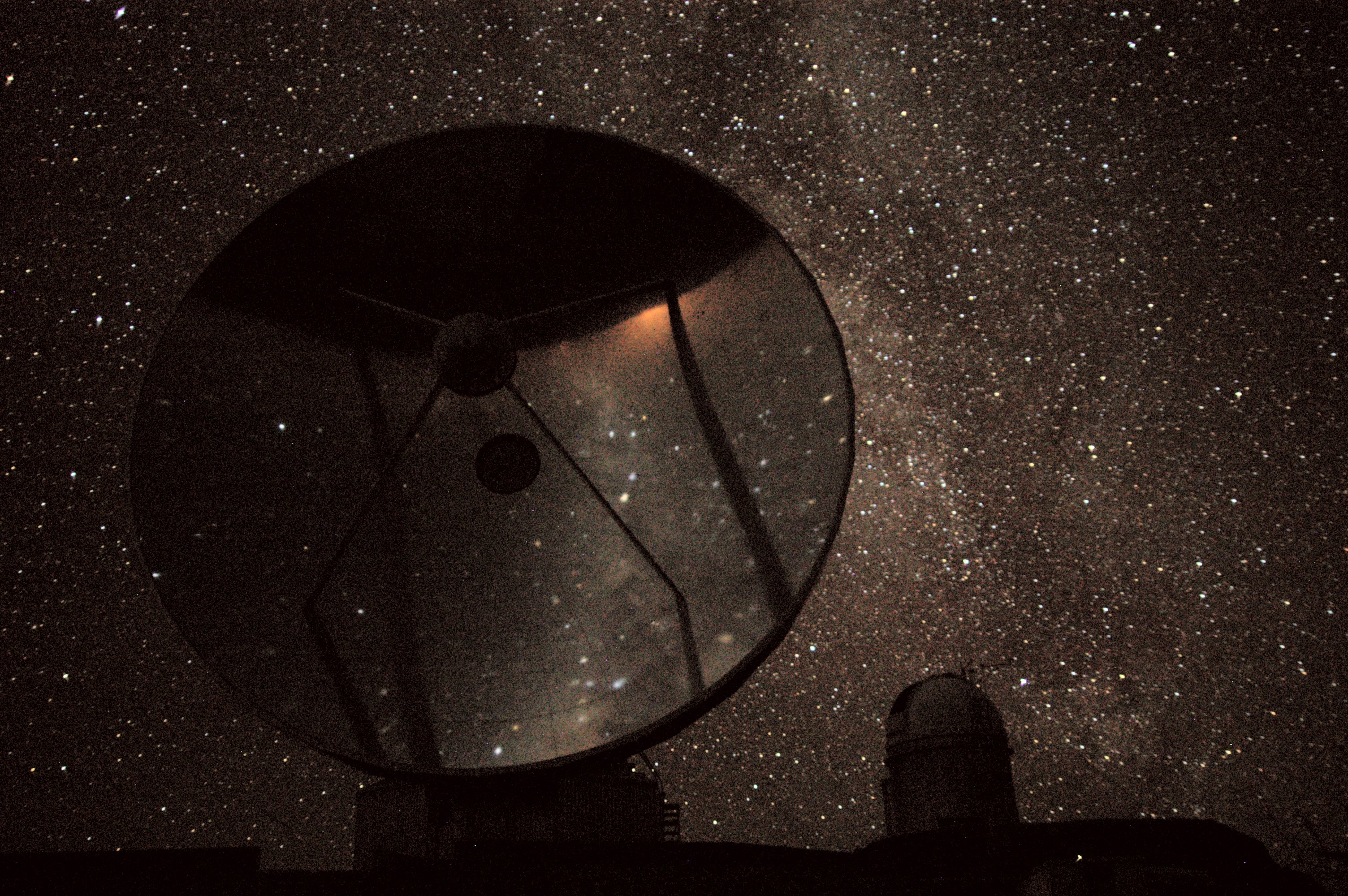 Early evening scenery at the ESO La Silla observatory. To the left is the decommisioned 15-metre dish of the Swedish-ESO Submillimetre Telescope (SEST), and on the right in the background is the dome of the ESO 3.6-metre telescope, at the highest point of the mountain. The southern Milky Way is seen along the right border of the SEST and above the 3.6 metre telescope. There is an upside-down reflection of the sky and the horizon behind the photographer in the highly polished antenna dish of the SEST.