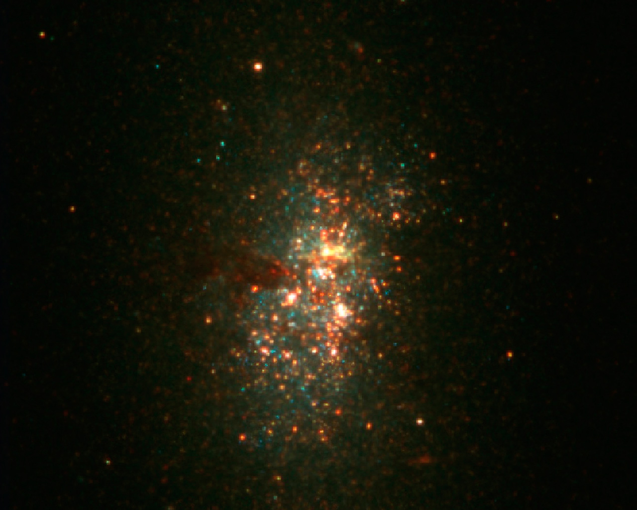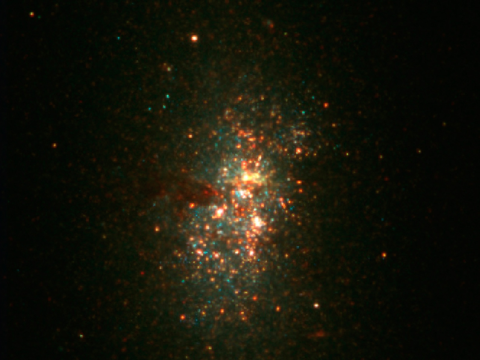 Composite colour-coded image of the small starburst galaxy NGC 5253, at a distance of 11 million light-years. It is based on one near-infrared image (in the K-band at wavelength 2.16 μm; here coded red) obtained with the ESO Very Large Telescope (VLT) and two images in the visual spectral region (V- (0.55 μm) and I-bands (0.79 μm), here blue and green, respectively) with the NASA/ESA Hubble Space Telescope (HST). The image covers 80 x 80 square arcseconds on the sky. North is up and East is to the left.