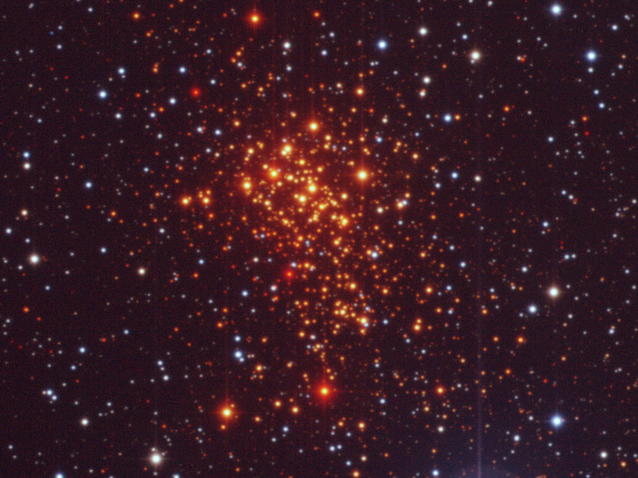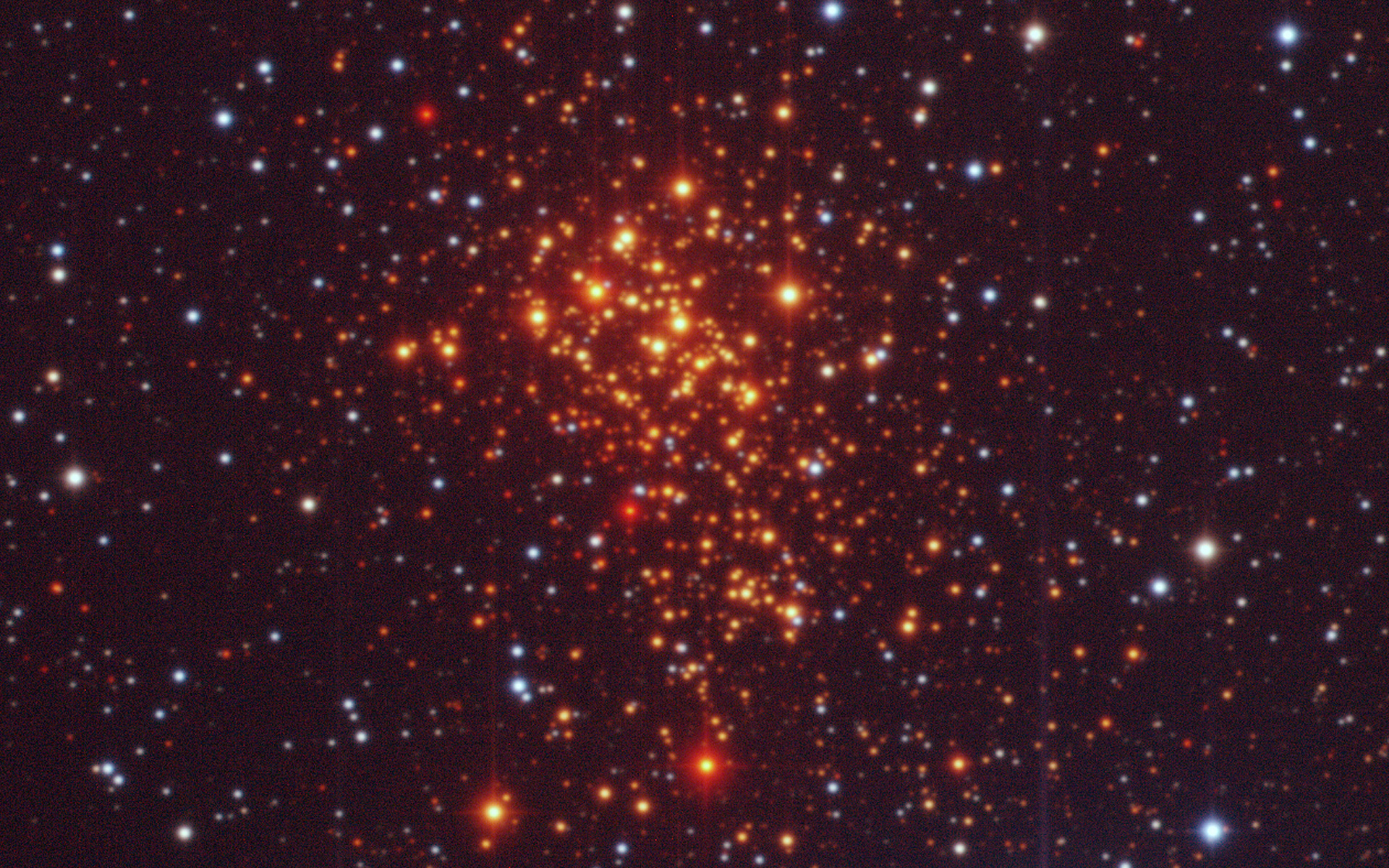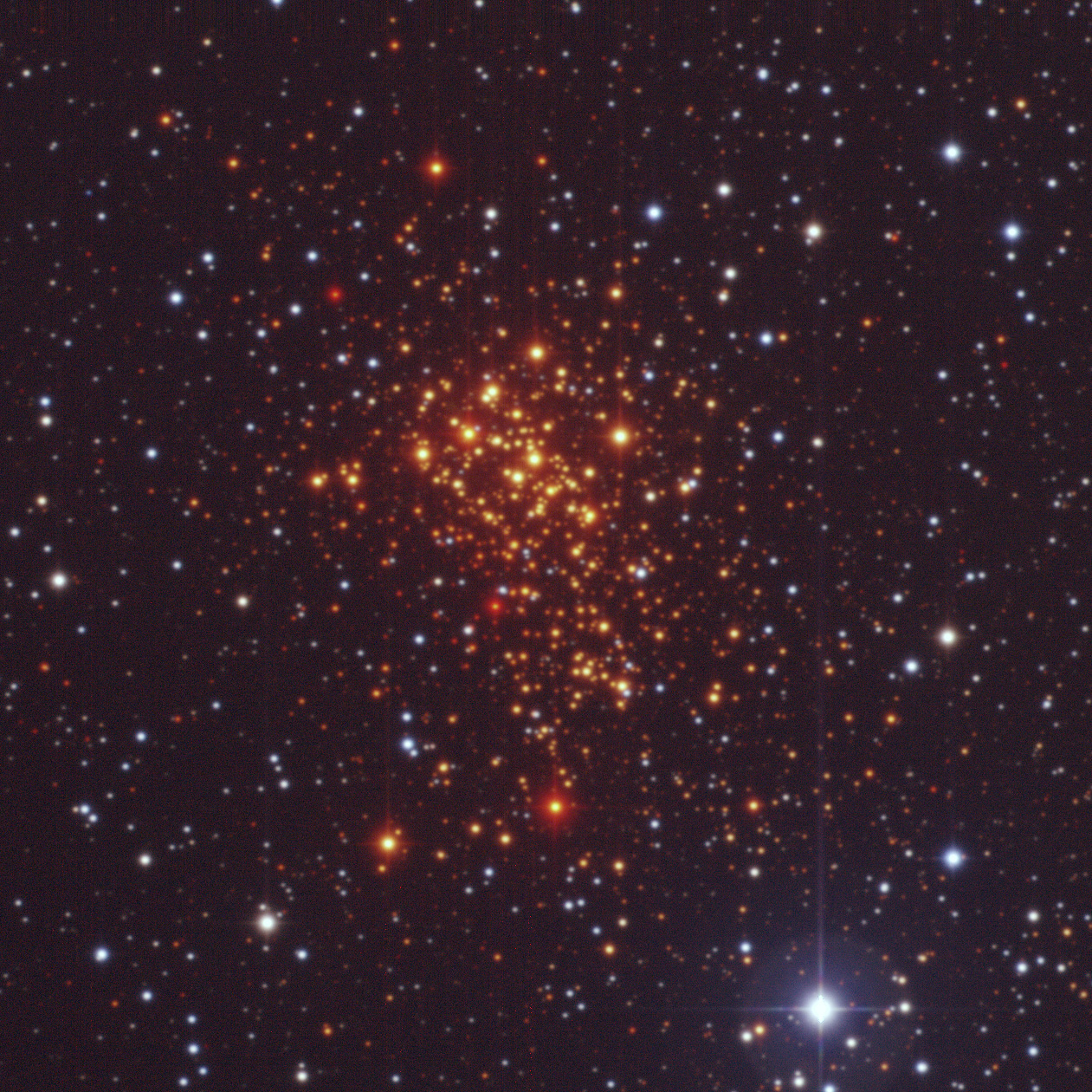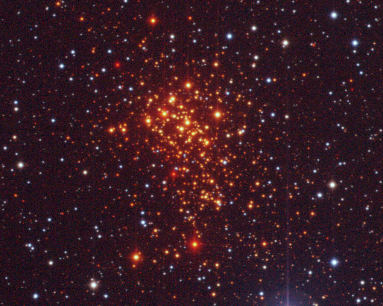 Composite image of the super star cluster "Westerlund 1" from 2.2-m MPG/ESO Wide-Field Imager (WFI) observations. The image covers a 5 x 5 arcmin sky region and is based on observations made in the V-band (550 nm, 2 min exposure time, associated to the blue channel), R-band (650nm, 1 min, green channel) and I-band (784nm, 18 sec, red channel). Only the central CCD of WFI was used, as the entire cluster fits comfortably inside it. The foreground stars appear blue, while the hot massive members of the cluster look orange, and the cool massive ones come out red.