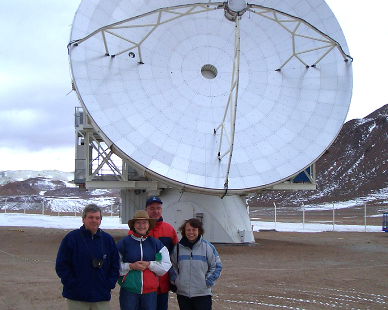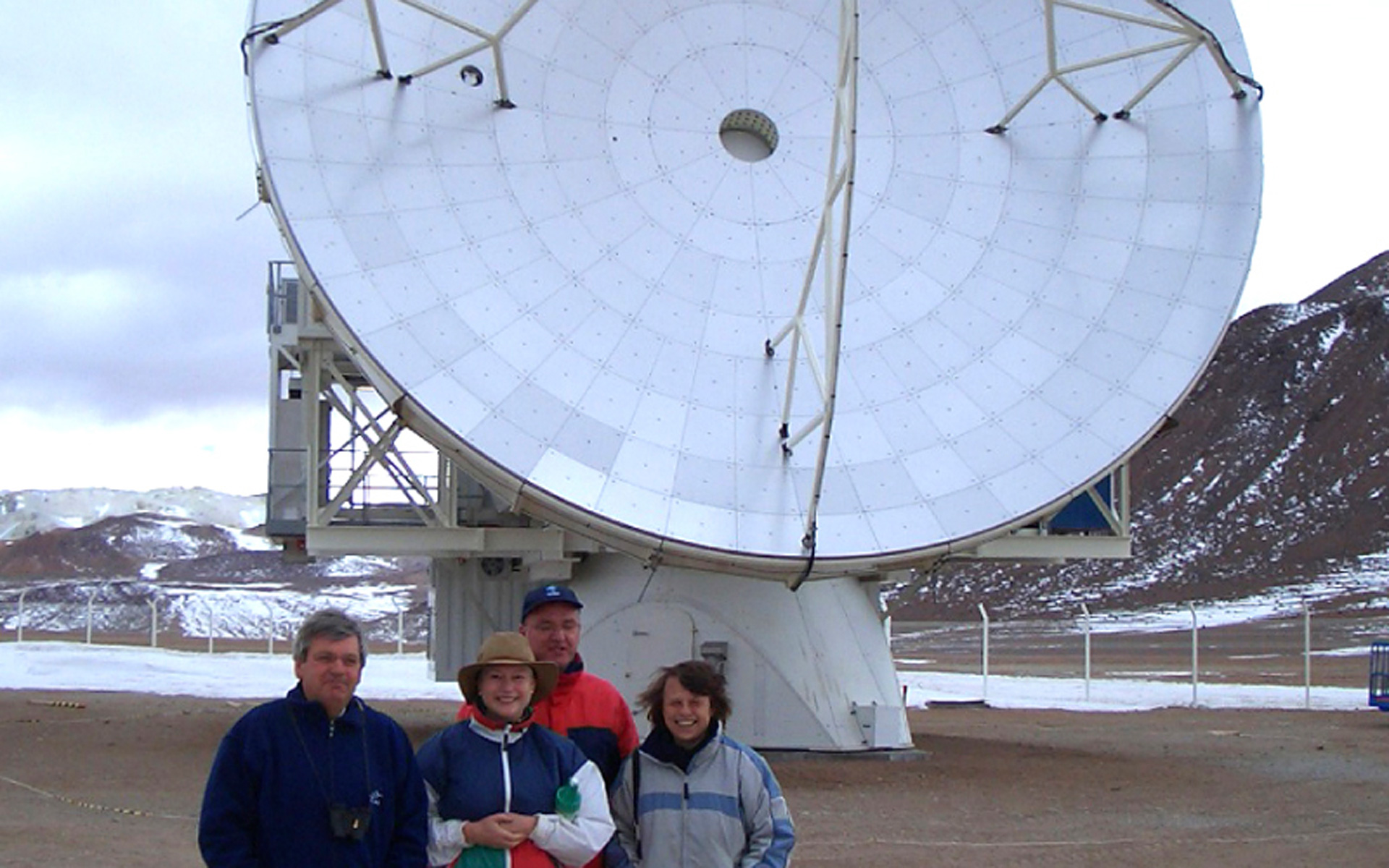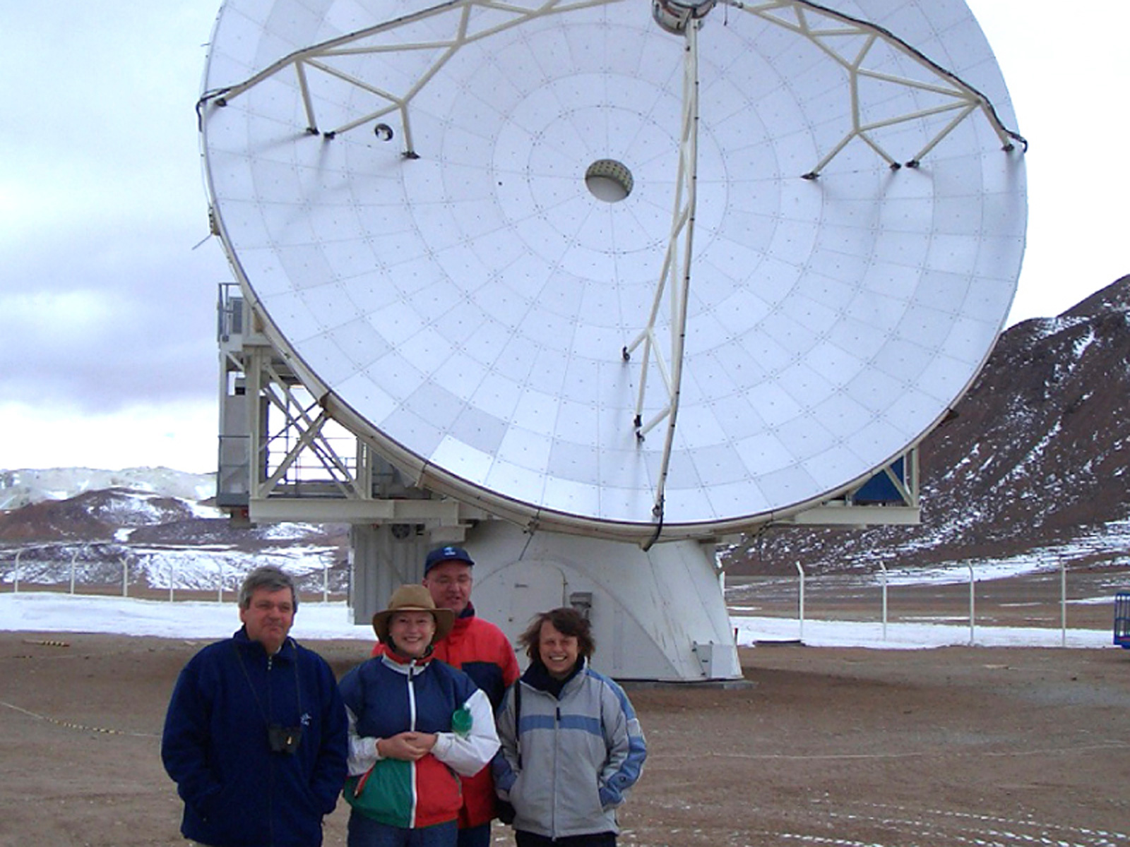 In front of the APEX antenna at Chajnantor. From left to right: Prof. Piet van der Kruit, Mrs. Maria van der Hoeven, Prof. Tim de Zeeuw, and Prof. Ewine van Dishoeck.