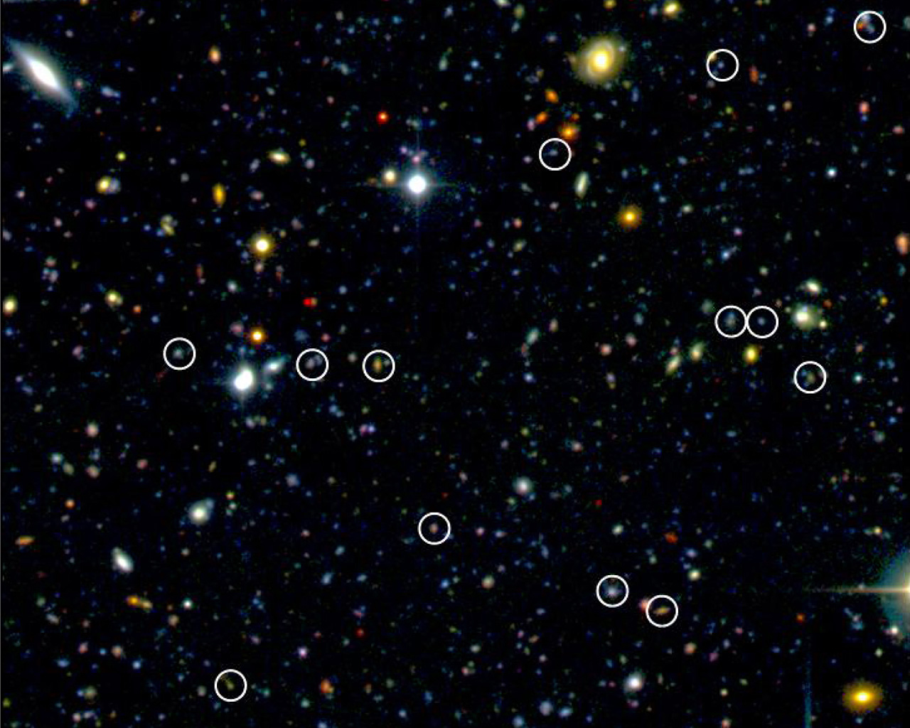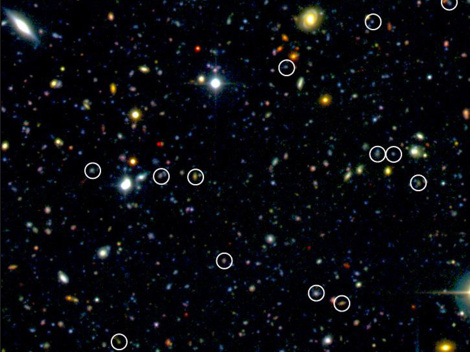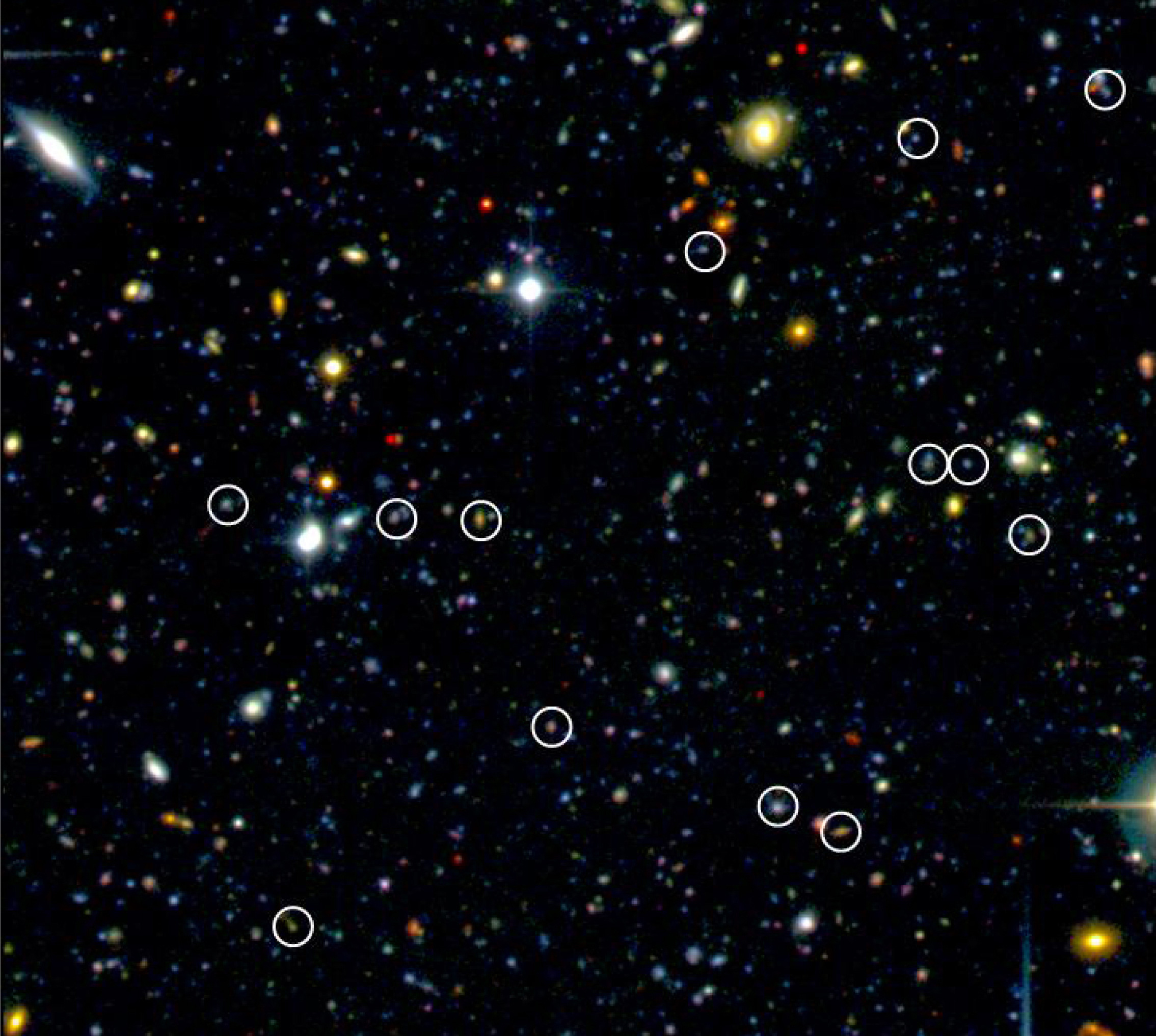 Small patch of the sky surveyed by the VVDS team in the Cetus (The Whale) constellation. This colour-composite image based on observations made with Megacam at the CFHT indicates a few of the newly found distant galaxies (encircled ones) based on VIMOS/VLT data. In this field of view of about 3 x 3 arcmin, 13 distant galaxies were discovered. The VVDS team discovered in total about 1,000 of such galaxies.