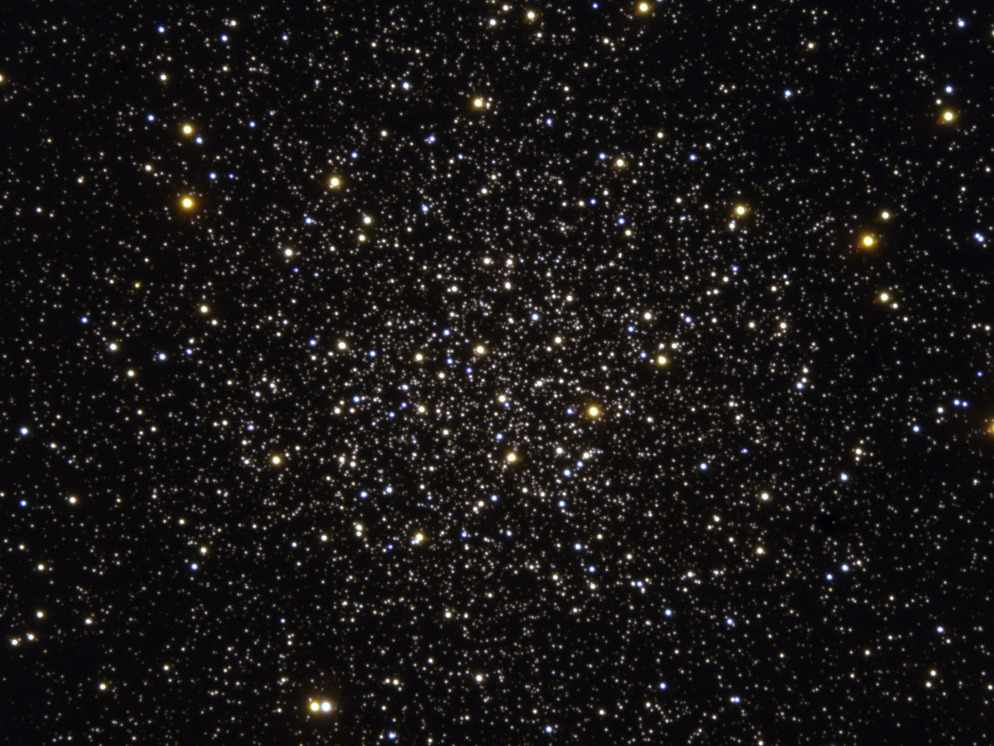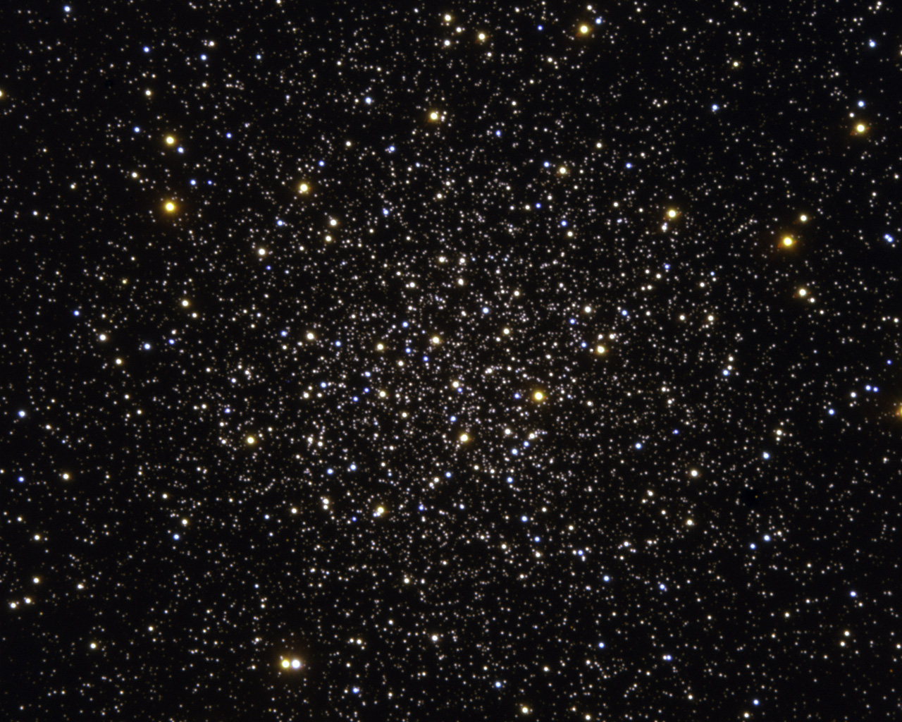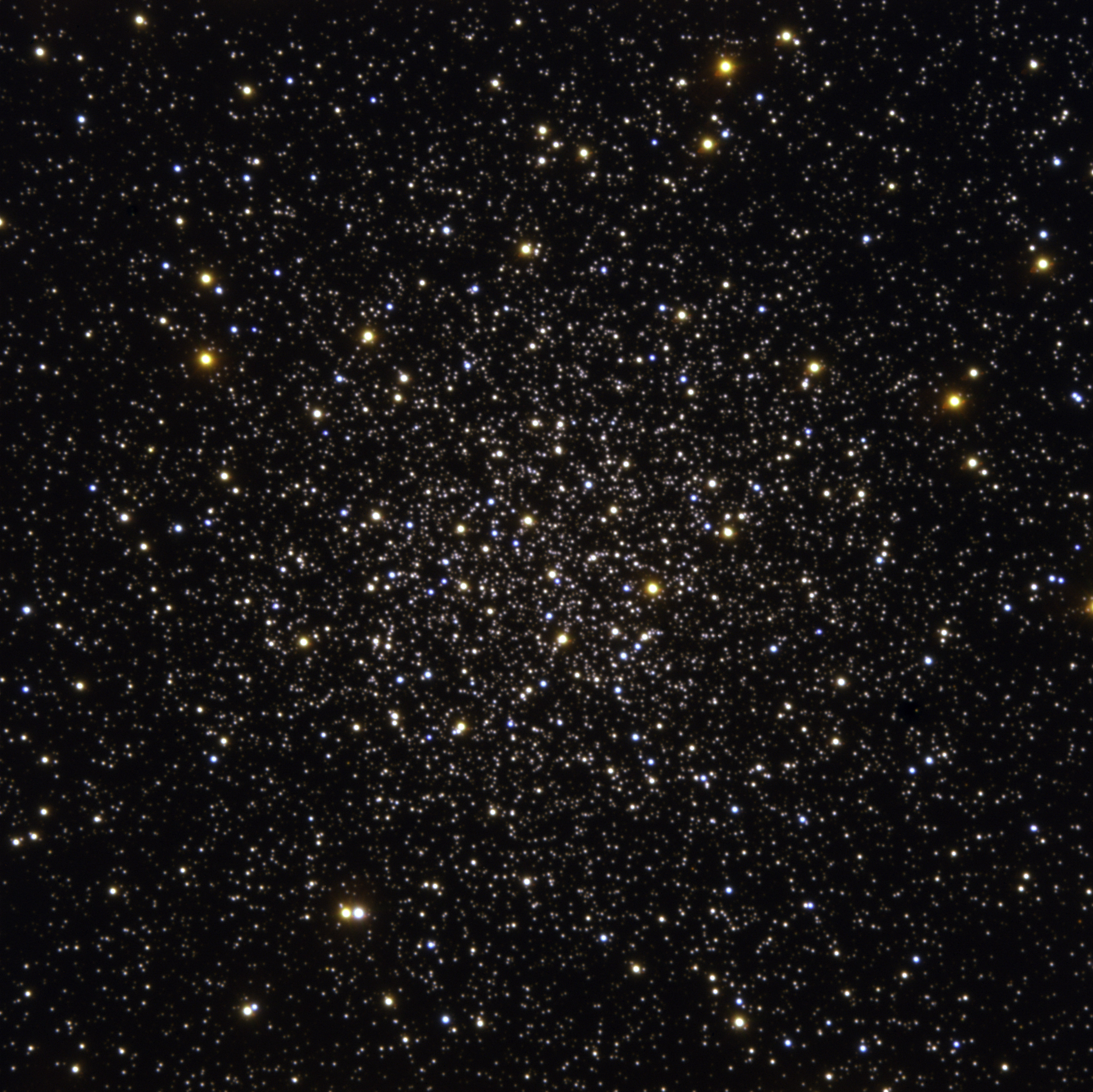 Centre of the globular cluster Messier 12 as observed with the FORS-1 multi-mode instrument on ESO's Very Large Telescope (Cerro Paranal, Chile). The picture covers a region of about 3.5 arcmin on a side, corresponding to about 23 light-years at the distance of Messier 12. It is based on data in five different filters : U, B, V, R and H-alpha. Here only the short exposures were used while for their scientific analysis, the authors used much longer exposures. Guido De Marchi (ESA) reduced the data and Kristina Boneva and Haennes Heyer (ESO) did the final image processing. The observations were obtained with very good conditions, the image quality ('seeing') being around 0.6 arcsec.