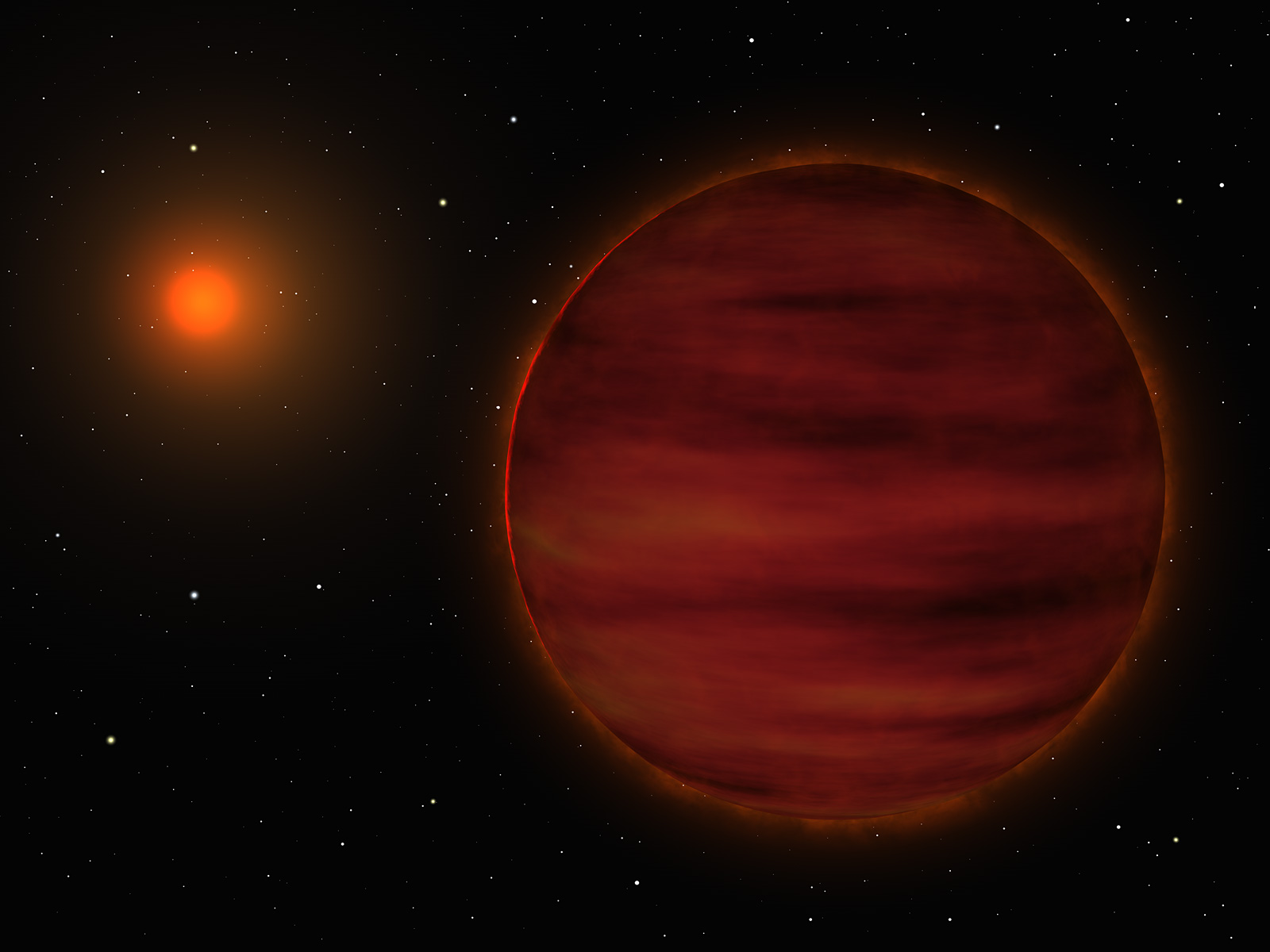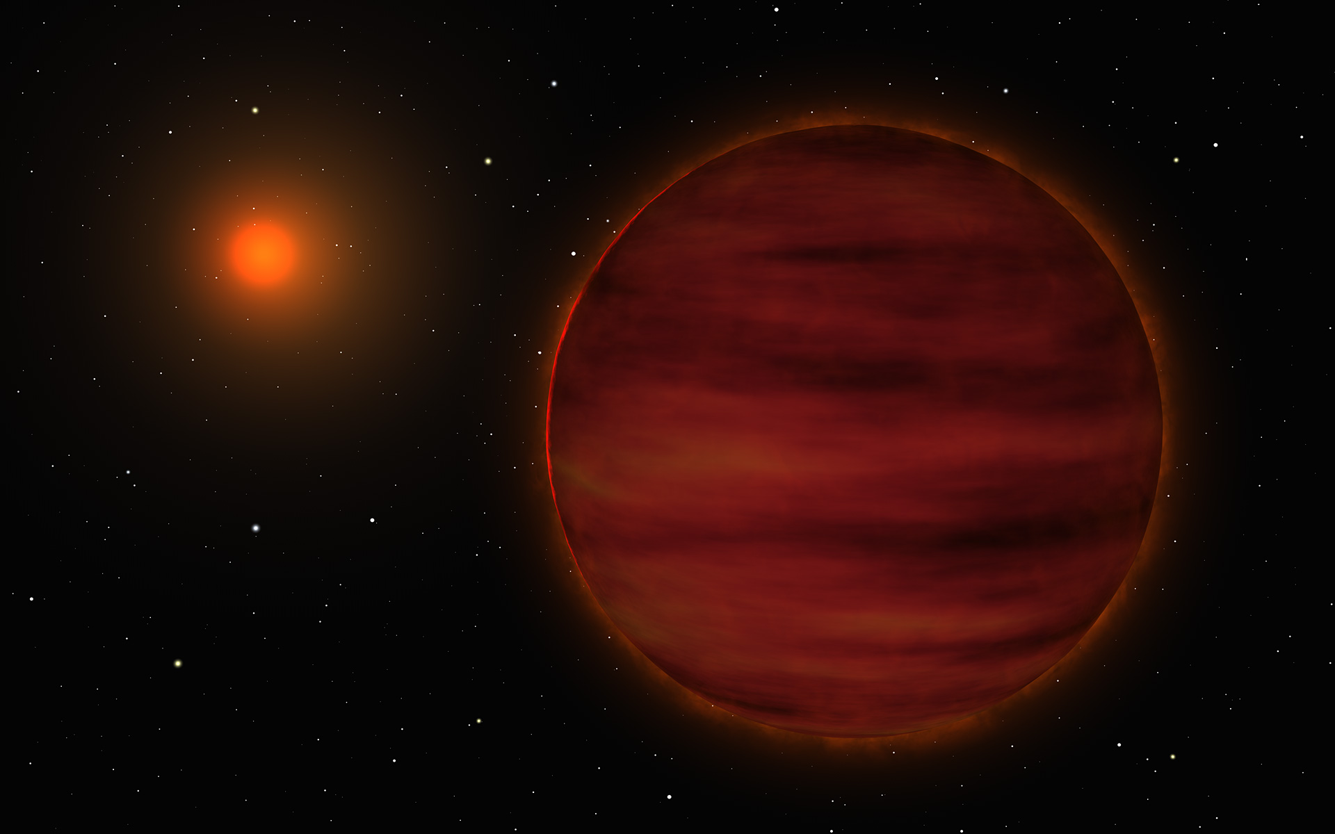 Artist's impression of the SCR 1845-6357 stellar system. The small red star is shown in the background while the newly discovered brown dwarf is at front.