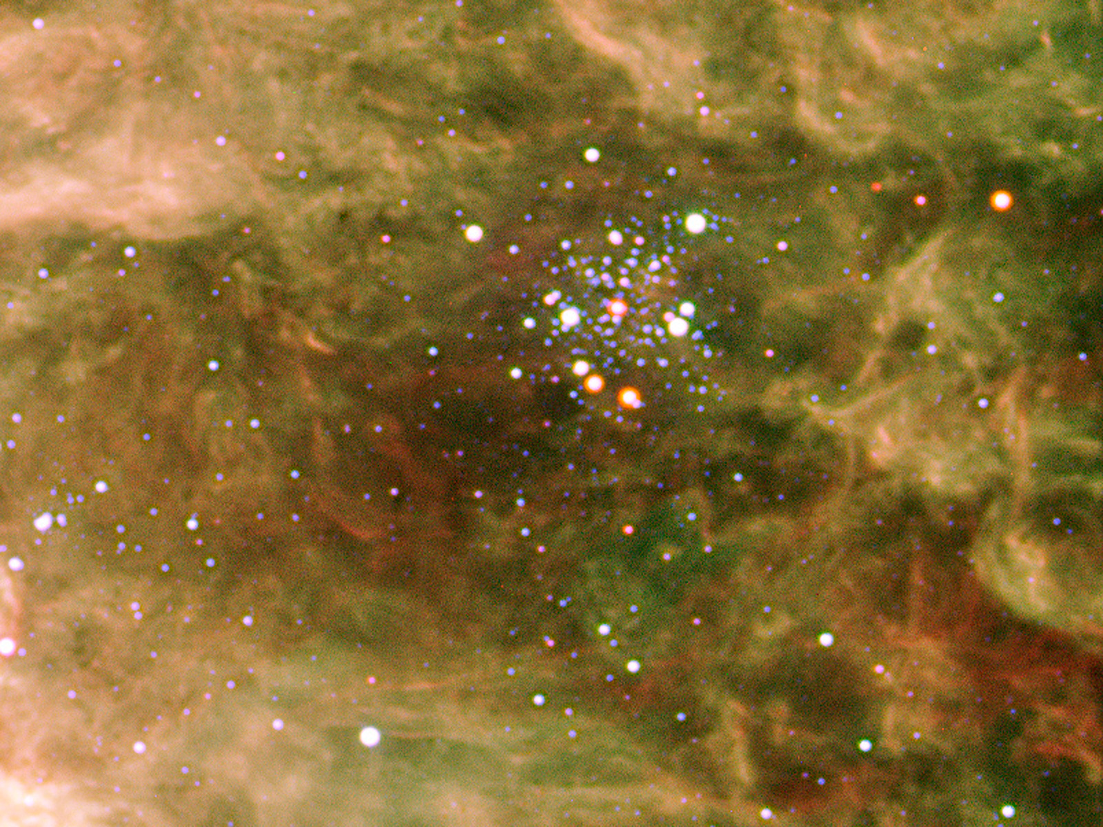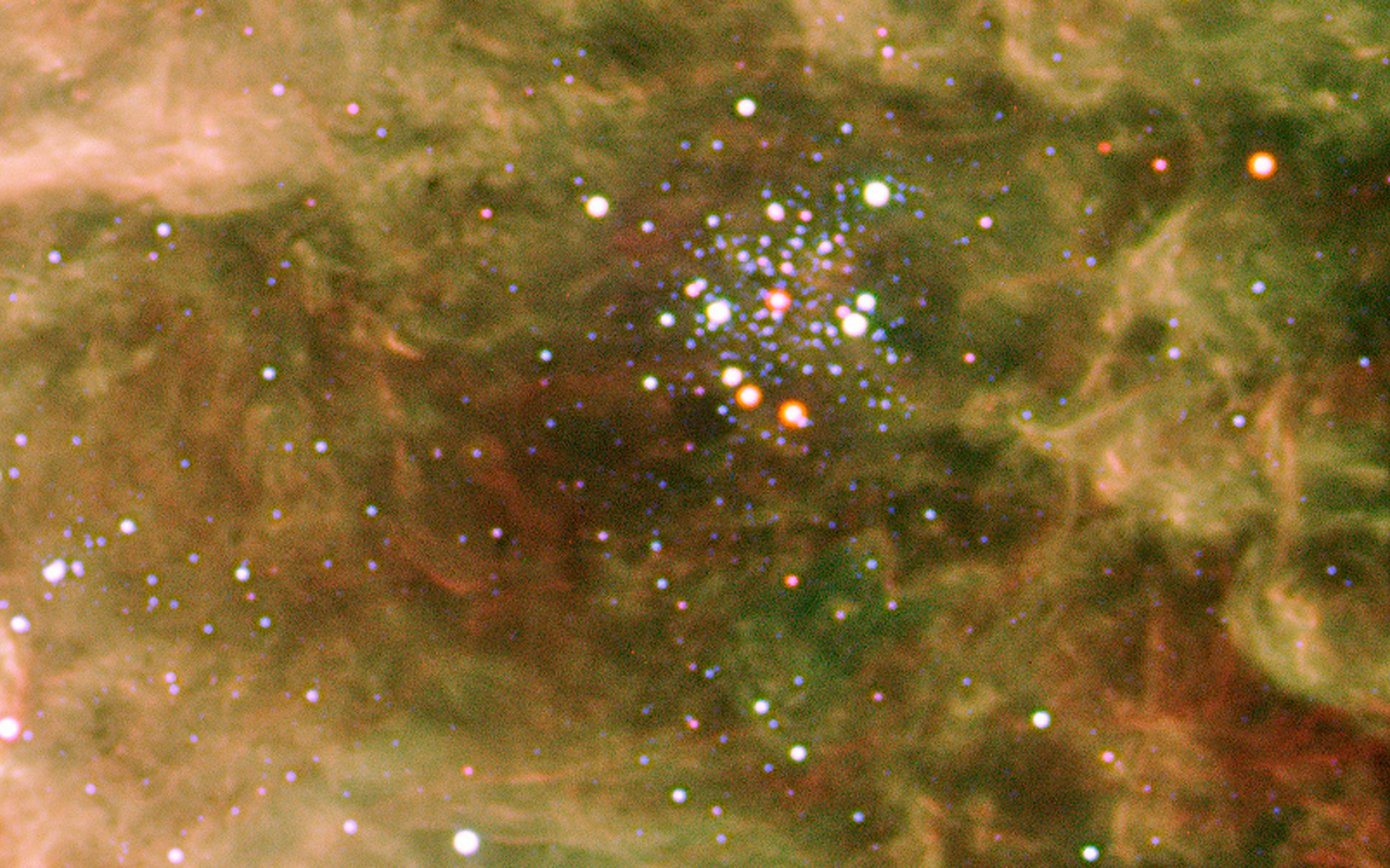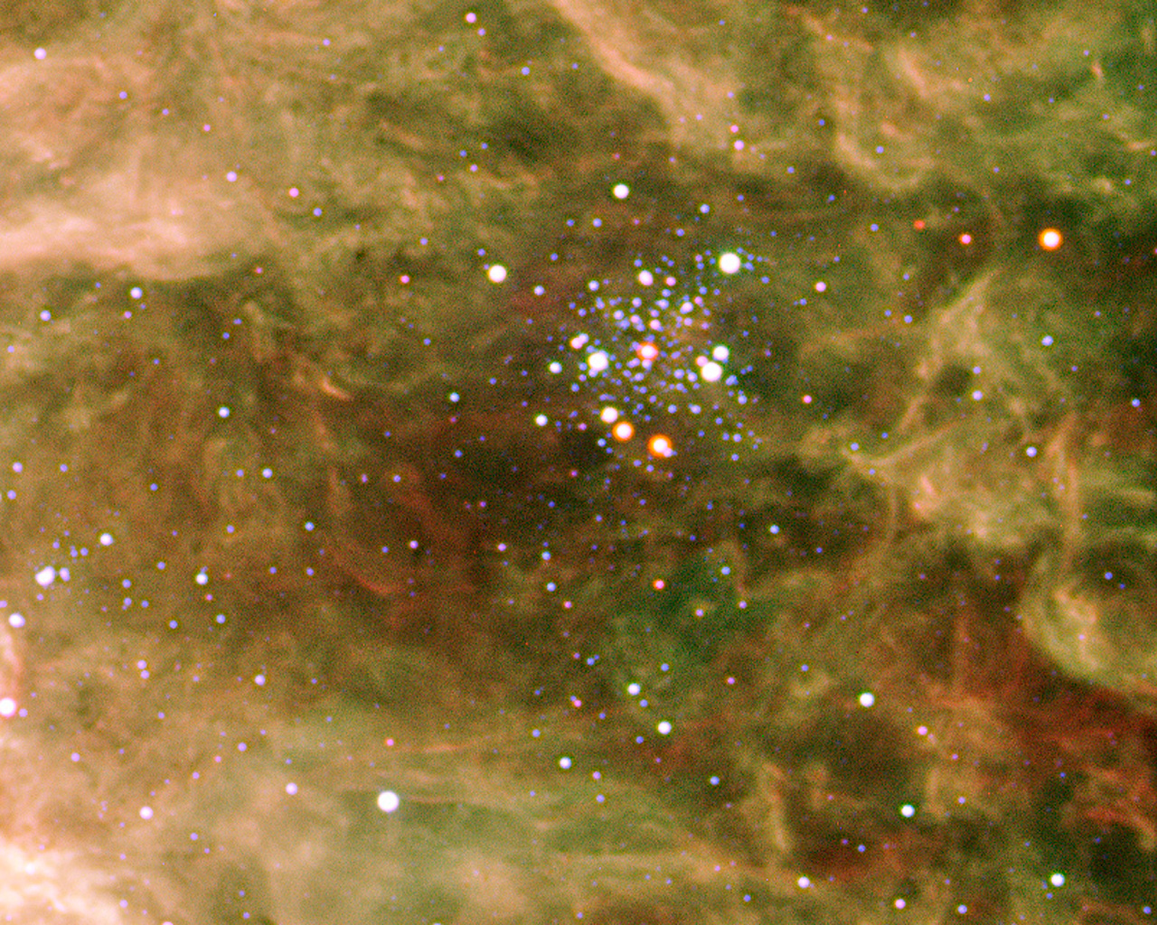 Above and to the right of the central cluster in the Tarantula Nebula, another cluster of bright, massive stars is seen. Known to astronomers as Hodge 301, it is about 20 million years old, or about 10 times older than R136. The more massive stars of Hodge 301 have therefore already exploded as supernovae, blasting material away at tremendous speed and creating a web of entangled filaments. More explosions will come soon — in astronomical terms — as three red supergiants are indeed present in Hodge 301 that will end their life in the gigantic firework of a supernova within the next million years.