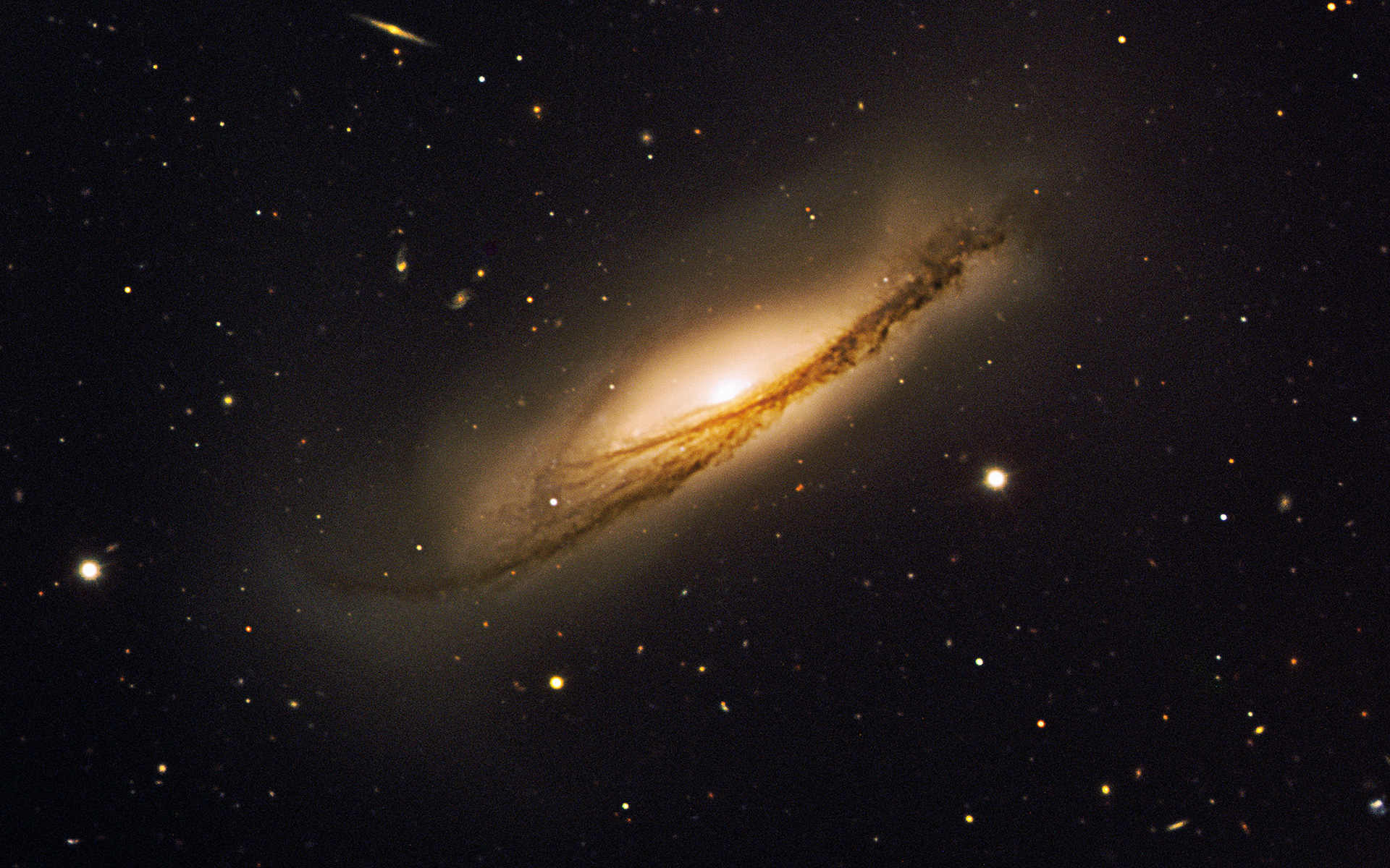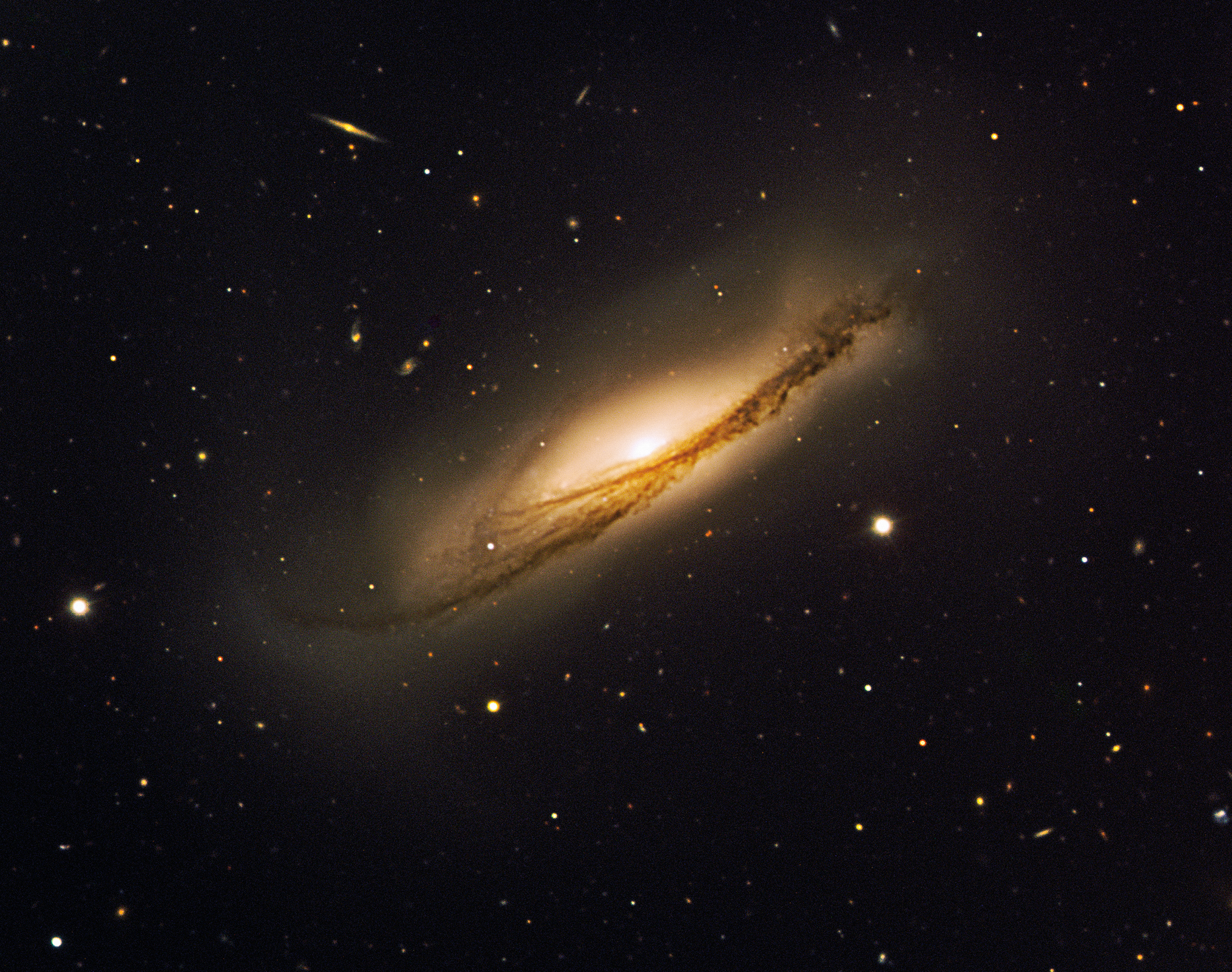 The beautiful edge-on spiral galaxy NGC 3190 with tightly wound arms and a warped shape that makes it resemble a gigantic potato crisp, as seen by ESO's Very Large Telescope. Supernova SN 2002bo is found in between the 'V' of the dust lanes in the south-western part of NGC 3190. SN 2002cv is obscured by a large amount of dust and is therefore not visible. Its position is however indicated on the above image. This colour composite is based on images obtained on 26 March 2003 with FORS1 on UT2 (Kueyen) in four filters (B, V, R and I) for a total exposure time of 14 minutes. The observations were done in the framework of a programme aiming at studying the physics of Type Ia supernovae. The field of view is 6.15 x 5 arcminutes. North is up and East is to the left. The data extraction from the archive, data reduction and final colour processing of the image was done by Henri Boffin (ESO).