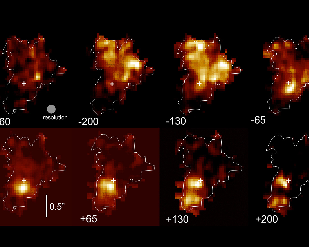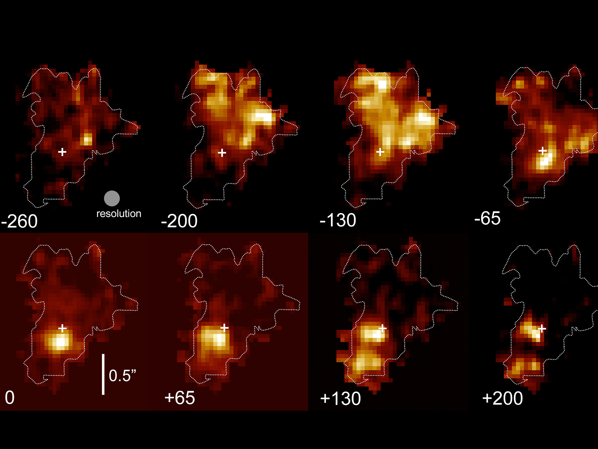 SINFONI maps of H-alphaline emission in BzK-15504, separated in 65 km/s bins of Doppler velocity (marked at the bottom left of each image) and centred on the systemic cosmological redshift of the galaxy (z=2.38). North is up and East is to the left, and a bar marks the angular scale of 0.5". The high resolution, spectrally resolved images show with exquisite clarity that star formation in this distant galaxy occurs in spectacular luminous complexes (bright spots) and that gas is funnelled at large rates into the nuclear region, forming a dense stellar bulge there. Over time, this system may transform into a compact, dense elliptical galaxy.