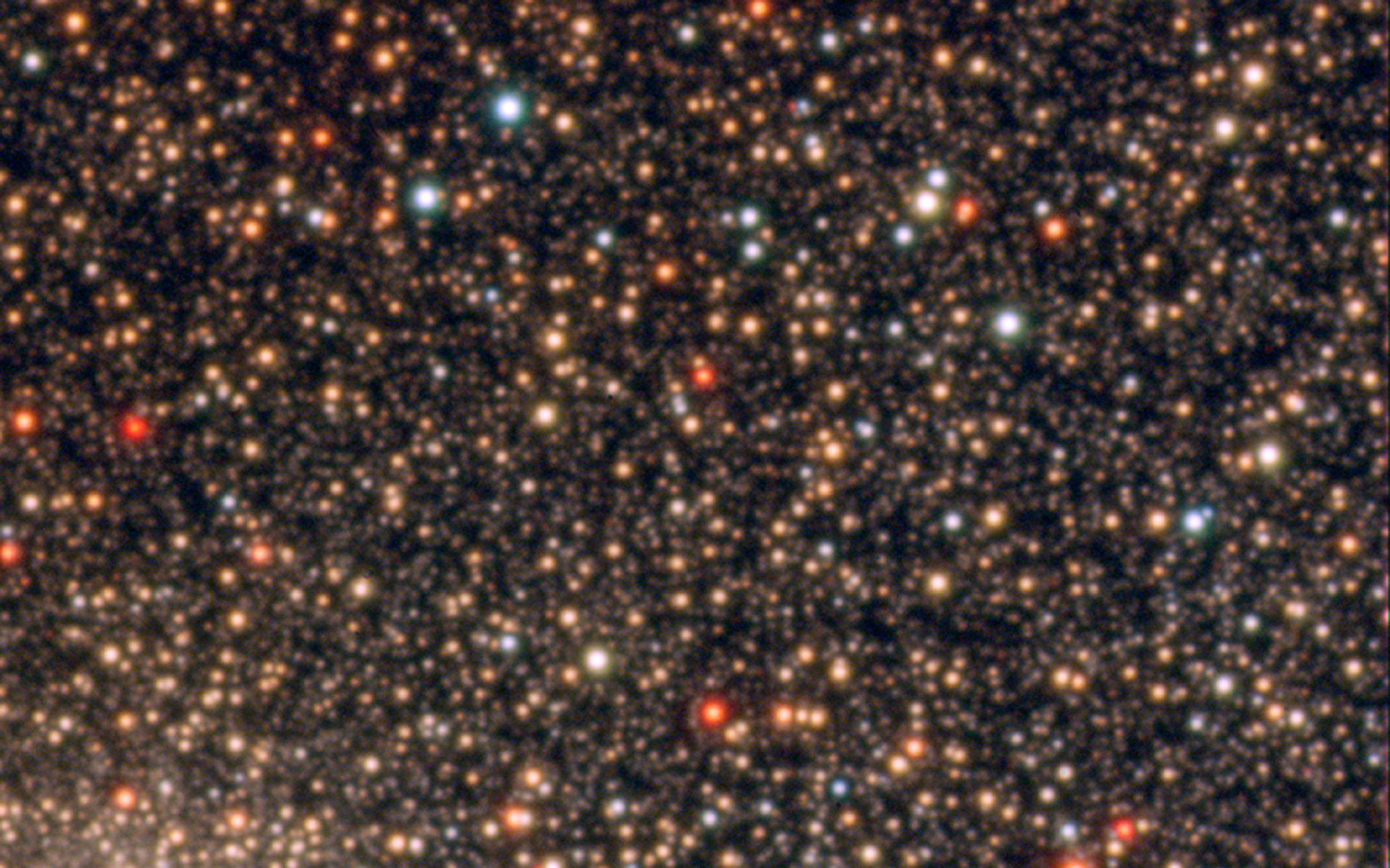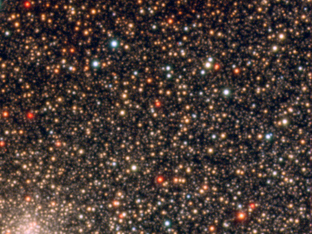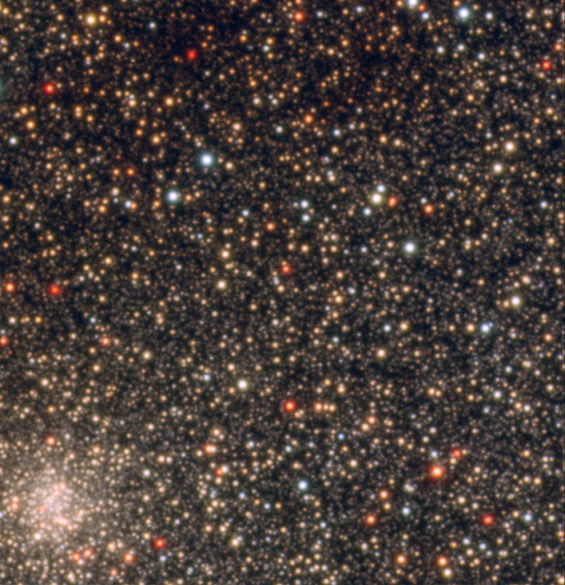 Part of one of the four regions of the sky in the direction of the Galactic Bulge in which the astronomers measured the iron and oxygen abundances in stars. This particular field is in the vicinity of the so-called 'Baade's Window', a region with relatively low amounts of interstellar "dust" that could block the sight, allowing astronomers to peer into the central parts of the Milky Way galactic centre and beyond. The globular cluster NGC 6528 is visible in the lower left corner. The image is a colour composite, based on images obtained in the B-, V-, and I-filters with the FORS instrument on the ESO VLT. The images were extracted from the ESO Science Archive and processed by Henri Boffin (ESO). North is to the right and East on top