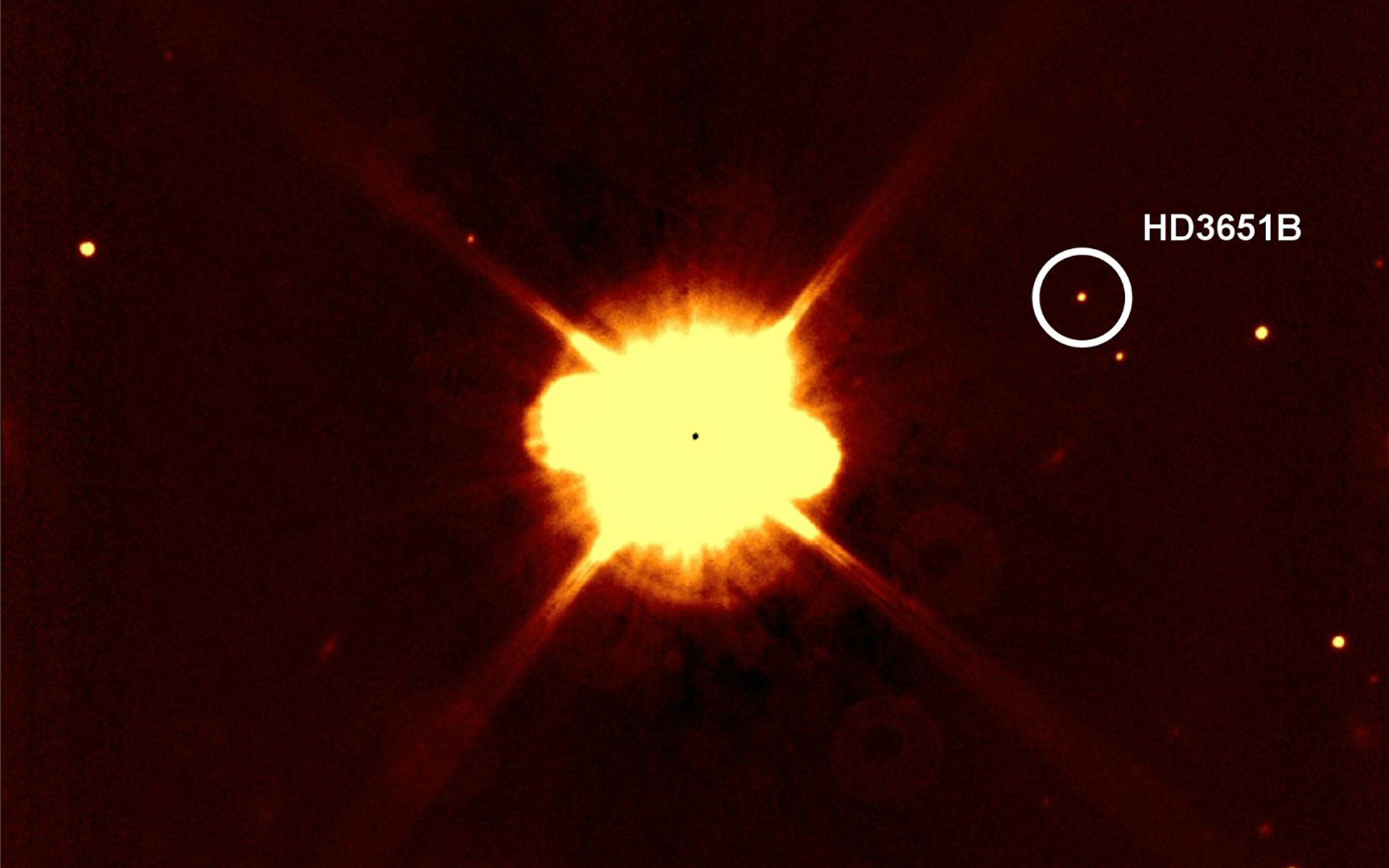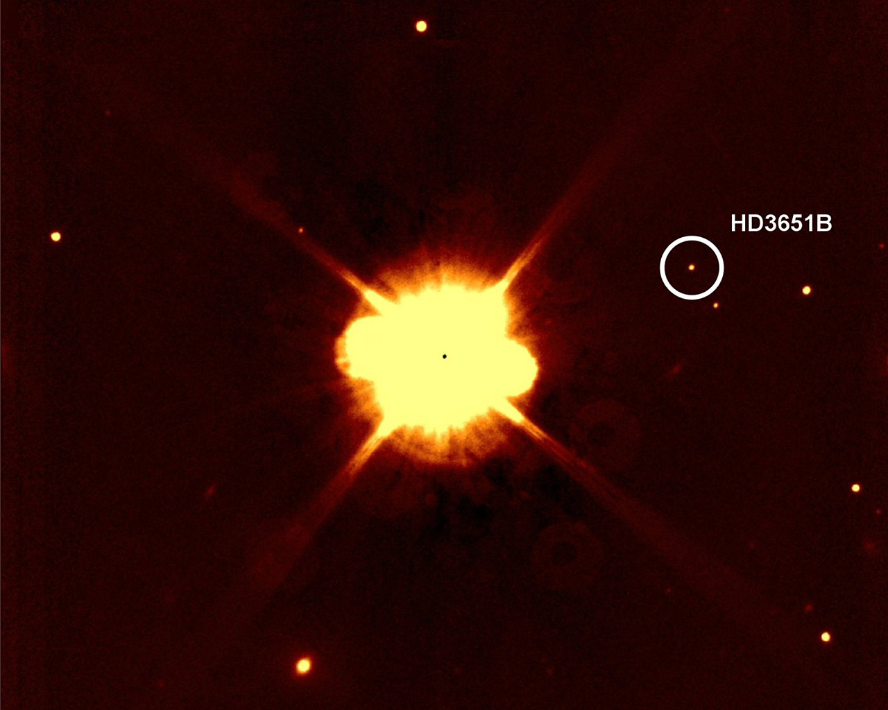 The SofI small field image of the planet host star HD 3651, taken in June 2006 in the H-band. The co-moving companion HD 3651B is indicated with a white circle.