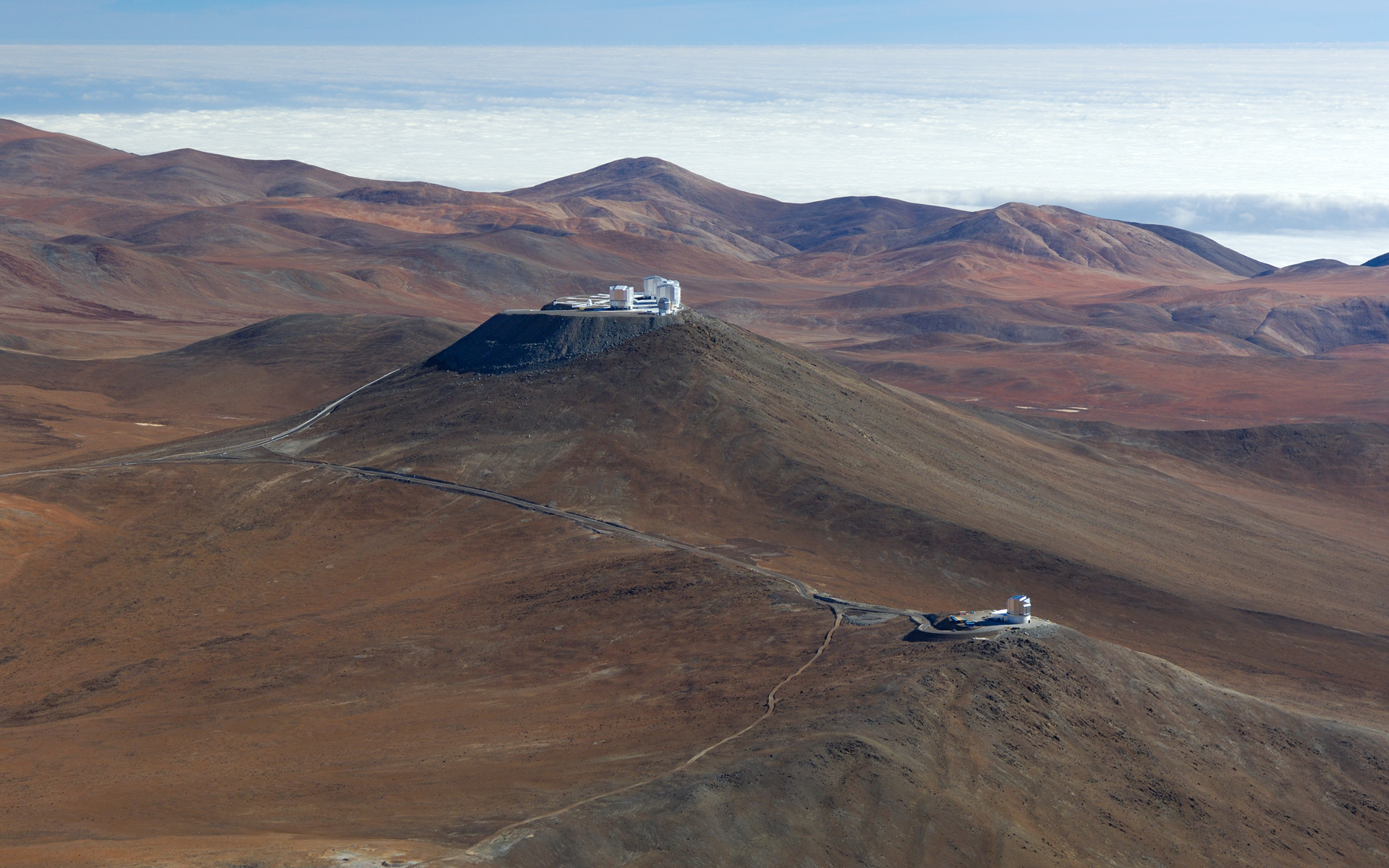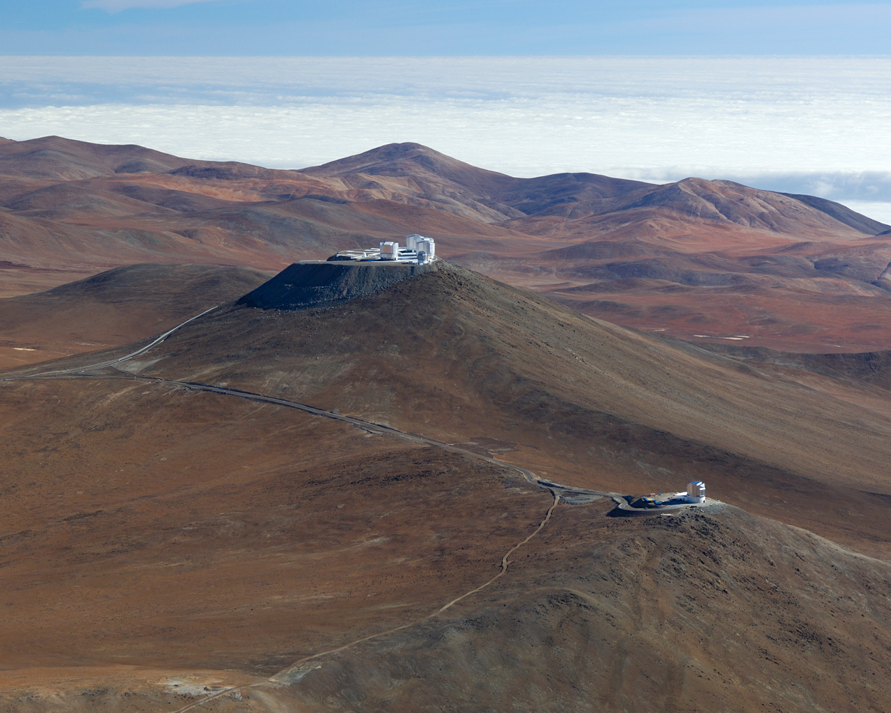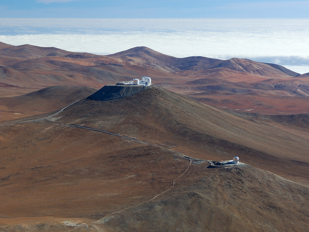 Aerial view of Paranal with VISTA in the foreground and the Very Large Telescope in the background.