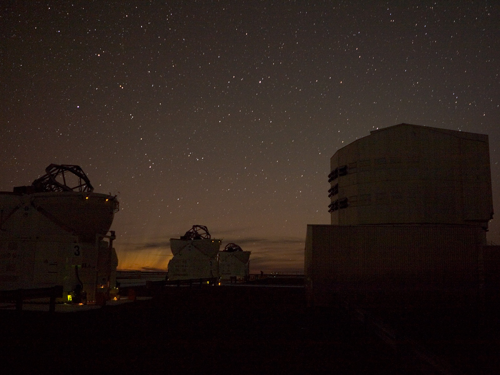 The 'old tails' from Comet McNaught observed in the evening of 17 January 2007 from Paranal, when the comet had just set. The outcome resembles an aurora. In the foreground : one of the VLT Unit Telescope and three Auxiliary Telescopes.