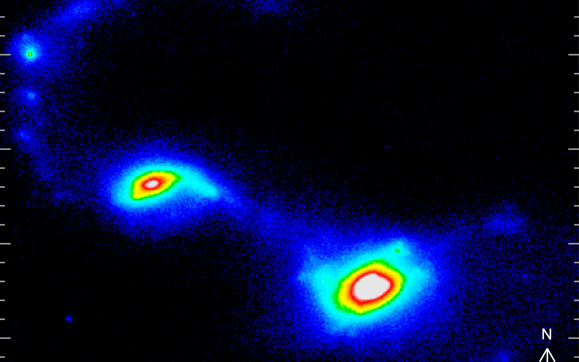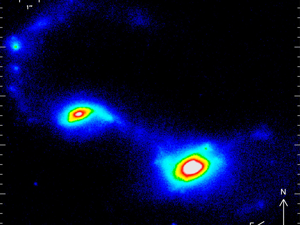 IRAS 06035-7102 was formed as two spiral galaxies swung past each other on their first close encounter, throwing off huge streamers of gas and stars. At the same time, multiple bursts of vigorous star formation were ignited. The detail in the image allows these compact star clusters to be easily seen, both around the progenitor nuclei and also in the tidal tails. This is a K-band image obtained with NACO and the LGS. The colour-code corresponds to intensity.