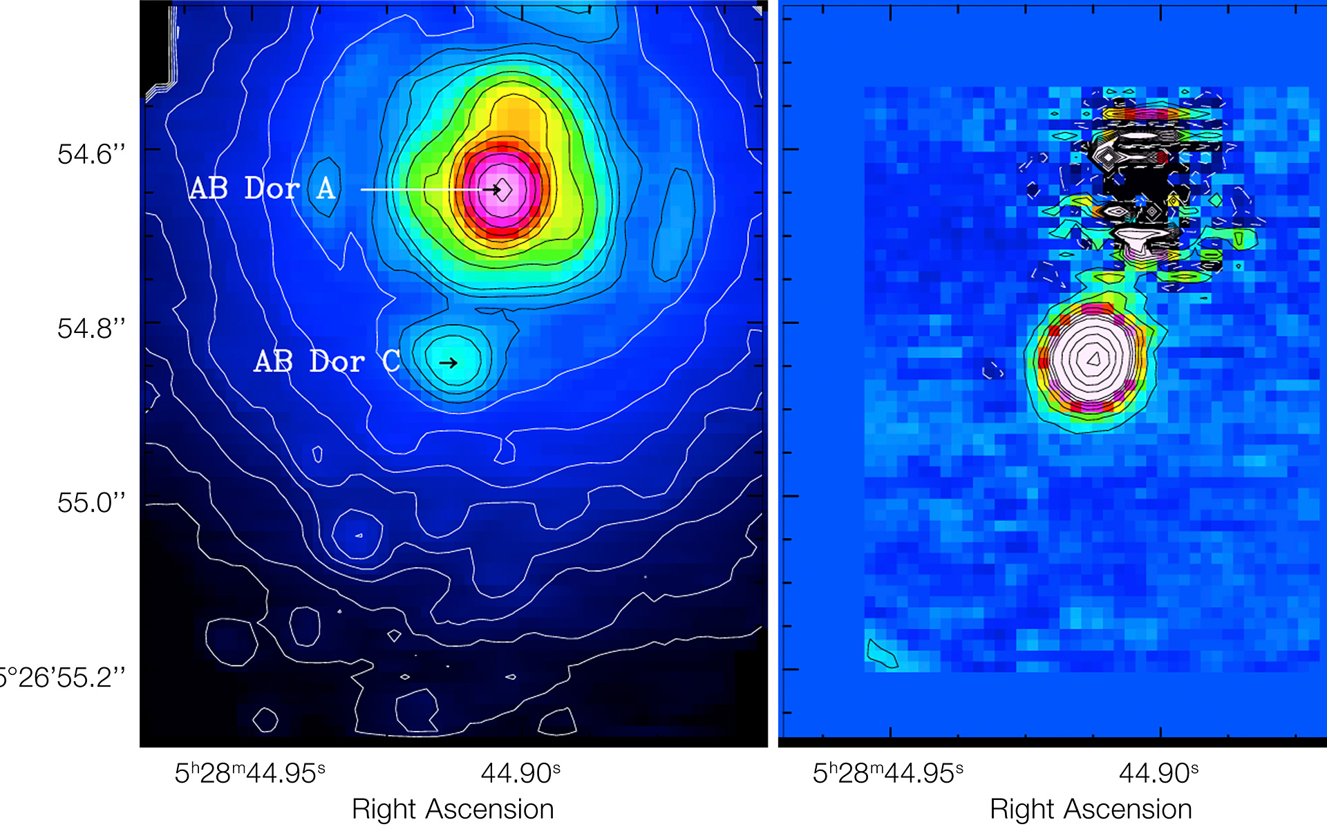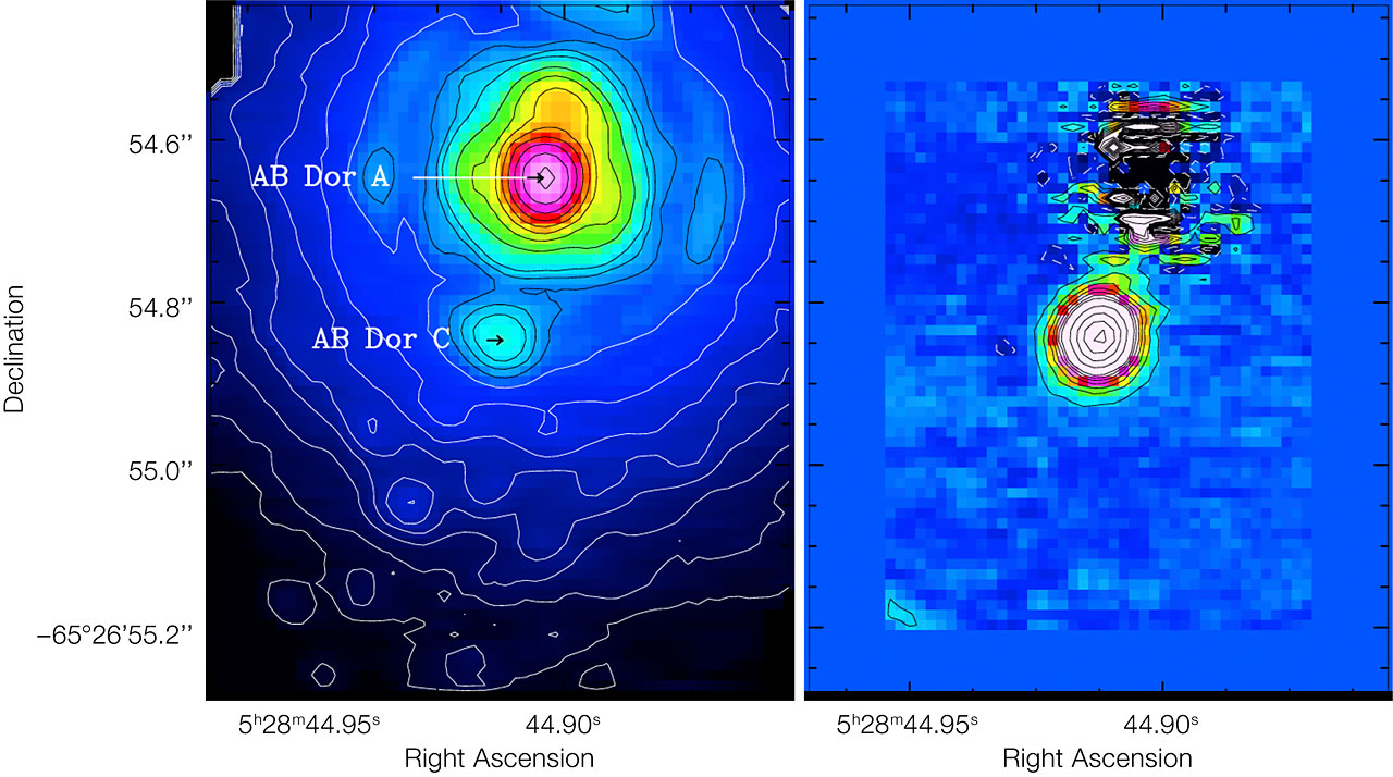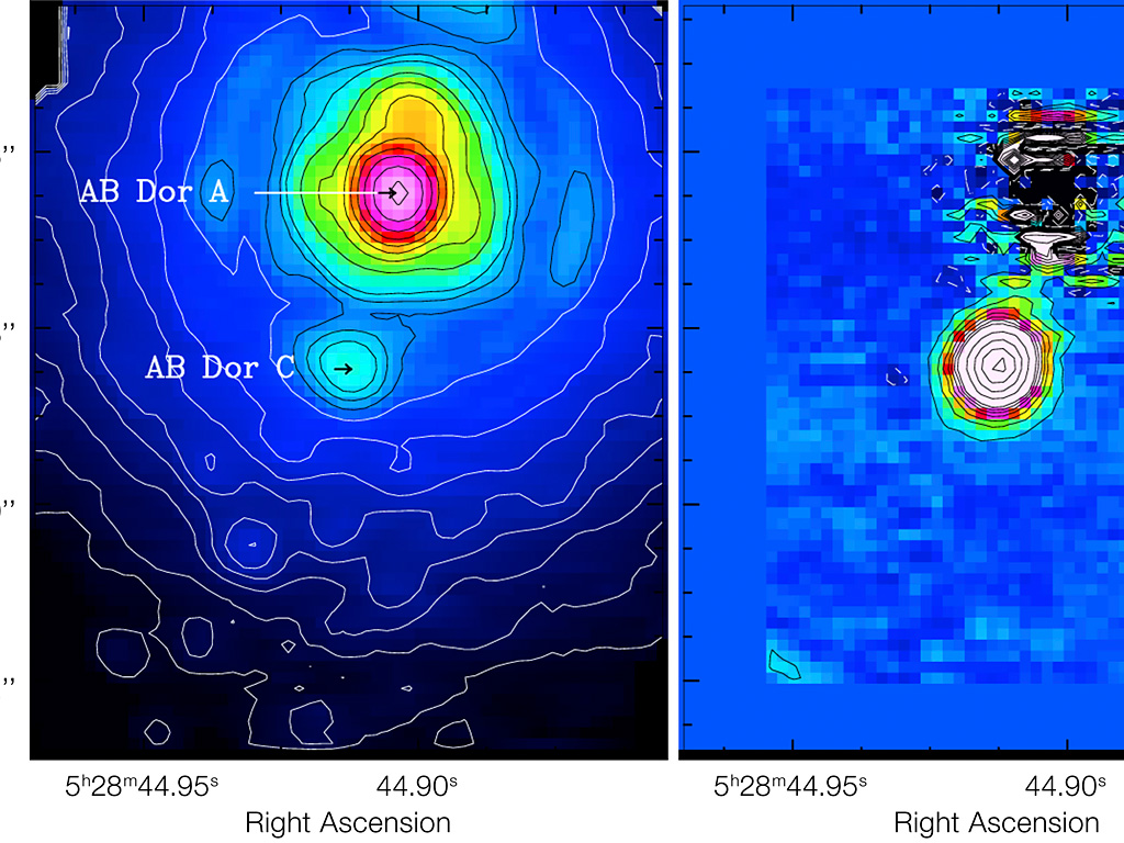 The left side shows a raw image, while the right side shows the result after the newly developed technique was applied. Thanks to this technique it is possible to study the faint AB Doradus C (about 100 times fainter than its host), once the contamination from the brighter AB Doradus A and the artefacts due to atmospheric turbulence are subtracted. AB Doradus is the closest faint companion ever detected by imaging.