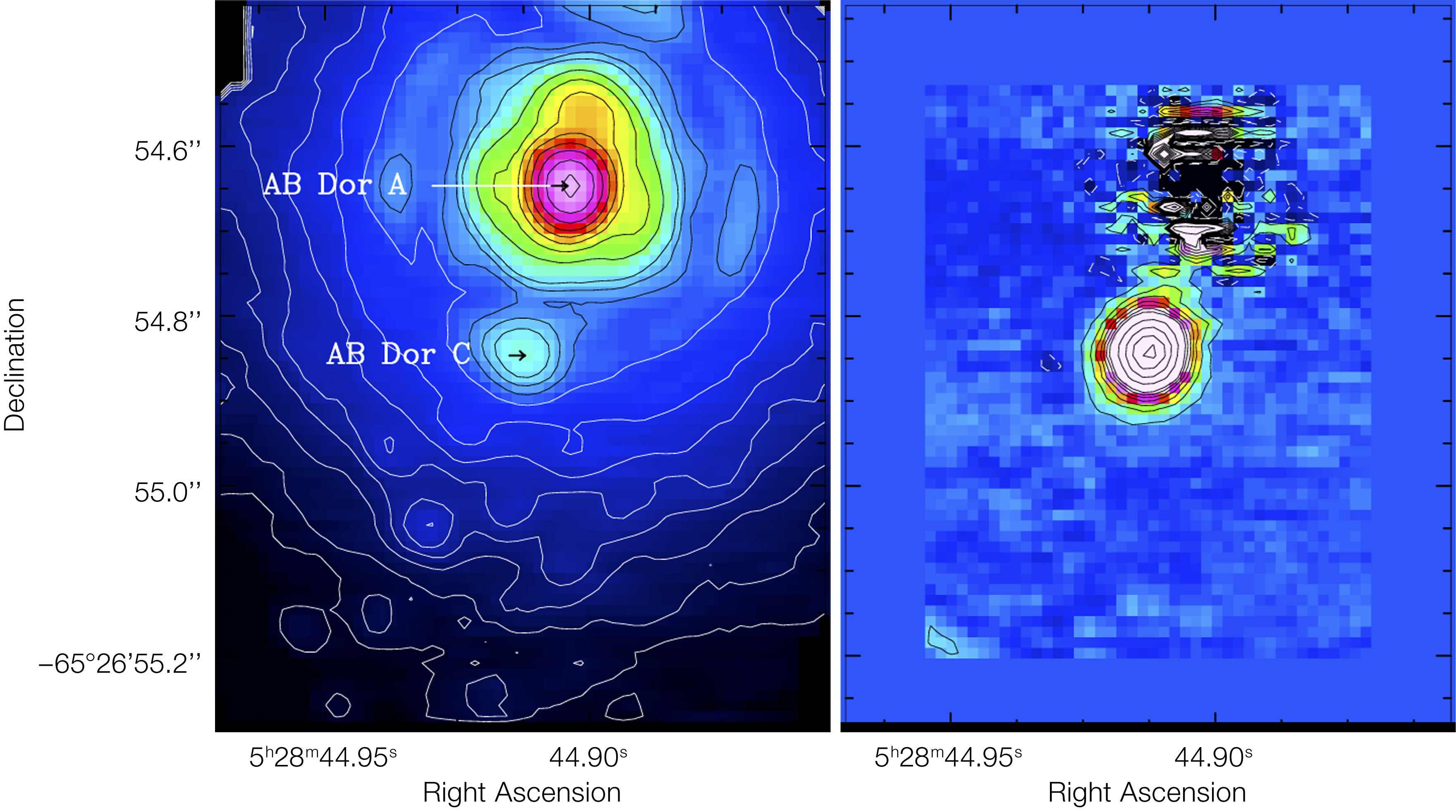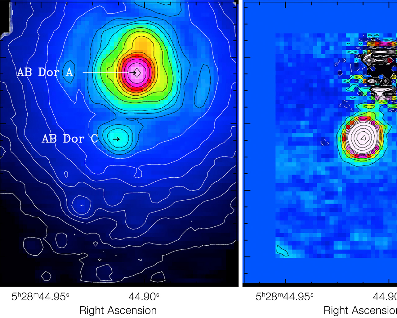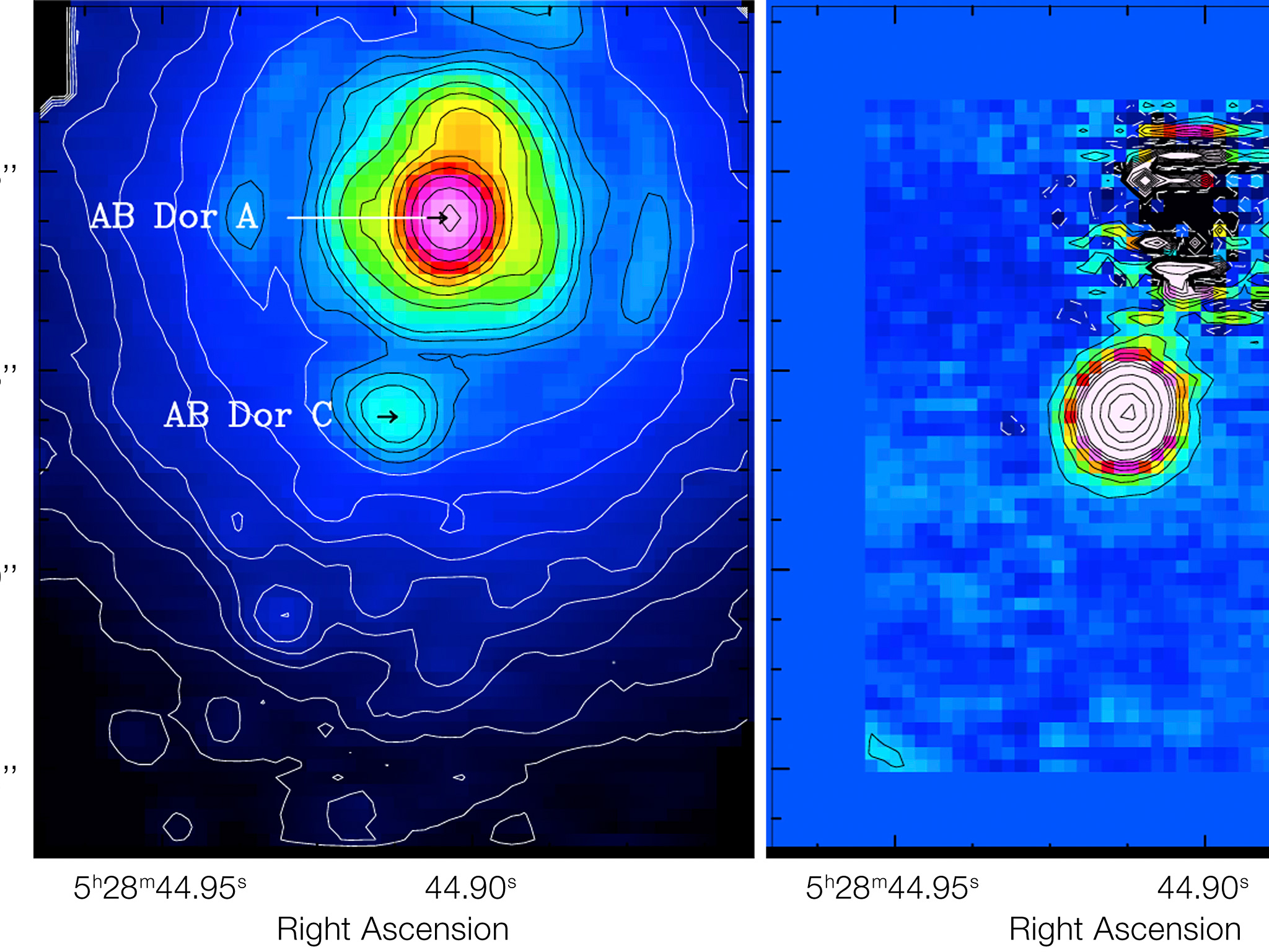 The left side shows a raw image, while the right side shows the result after the newly developed technique was applied. Thanks to this technique it is possible to study the faint AB Doradus C (about 100 times fainter than its host), once the contamination from the brighter AB Doradus A and the artefacts due to atmospheric turbulence are subtracted. AB Doradus is the closest faint companion ever detected by imaging.