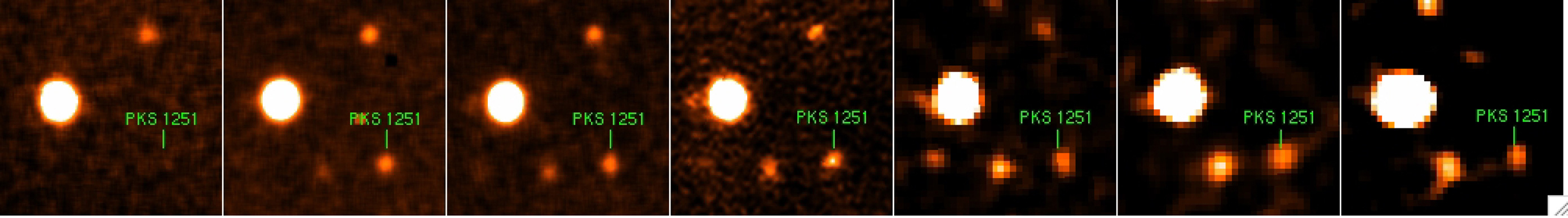 GROND images of the quasar PKS 1251-407. GROND observes simultaneously through 7 different filters in the visible and near-infrared, providing 7 images of the same object. In this case, the quasar appears much fainter in the blue images (the so-called Lyman drop-out), an indication of the quasar's distance.
