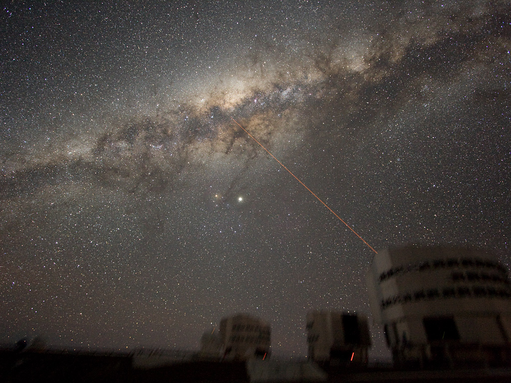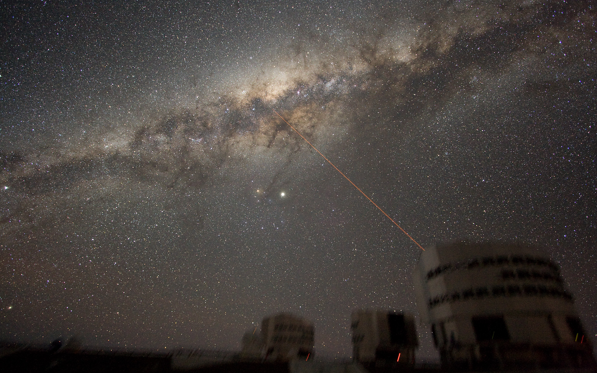 Image of the night sky above Paranal on 21 July 2007, taken by ESO astronomer Yuri Beletsky. A wide band of stars and dust clouds, spanning more than 100 degrees on the sky, is seen. This is the Milky Way, the Galaxy we belong to. At the centre of the image, two bright objects are visible. The brightest is the planet Jupiter, while the other is the star Antares. Three of the four 8.2-m telescopes forming ESO's VLT are seen, with a laser beaming out from Yepun, Unit Telescope number 4. The laser points directly at the Galactic Centre. Also visible are three of the 1.8-m Auxiliary Telescopes used for interferometry. They show small light beams which are diodes located on the domes. The exposure time is 5 minutes and because the tracking was made on the stars, the telescopes are slightly blurred.