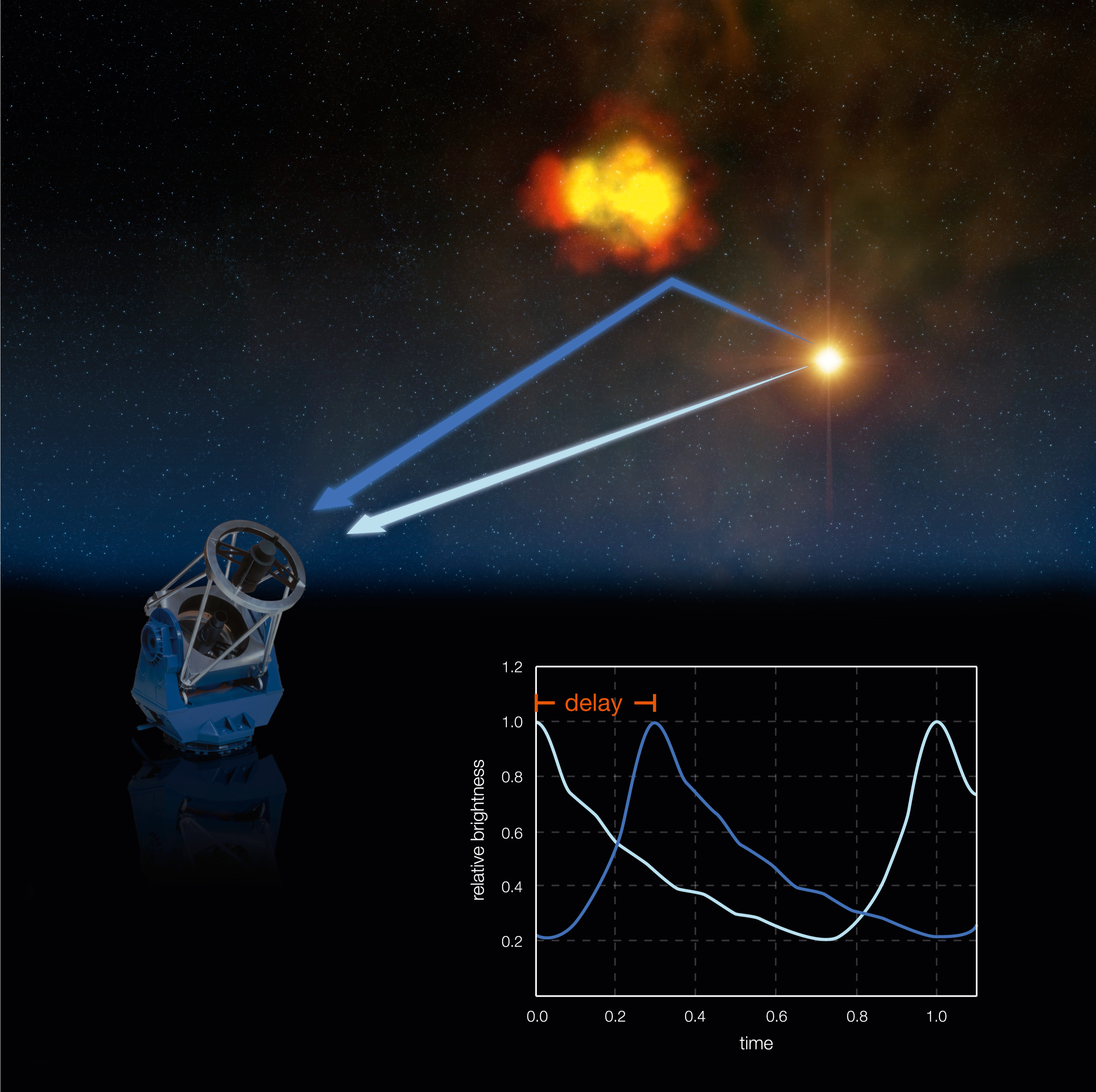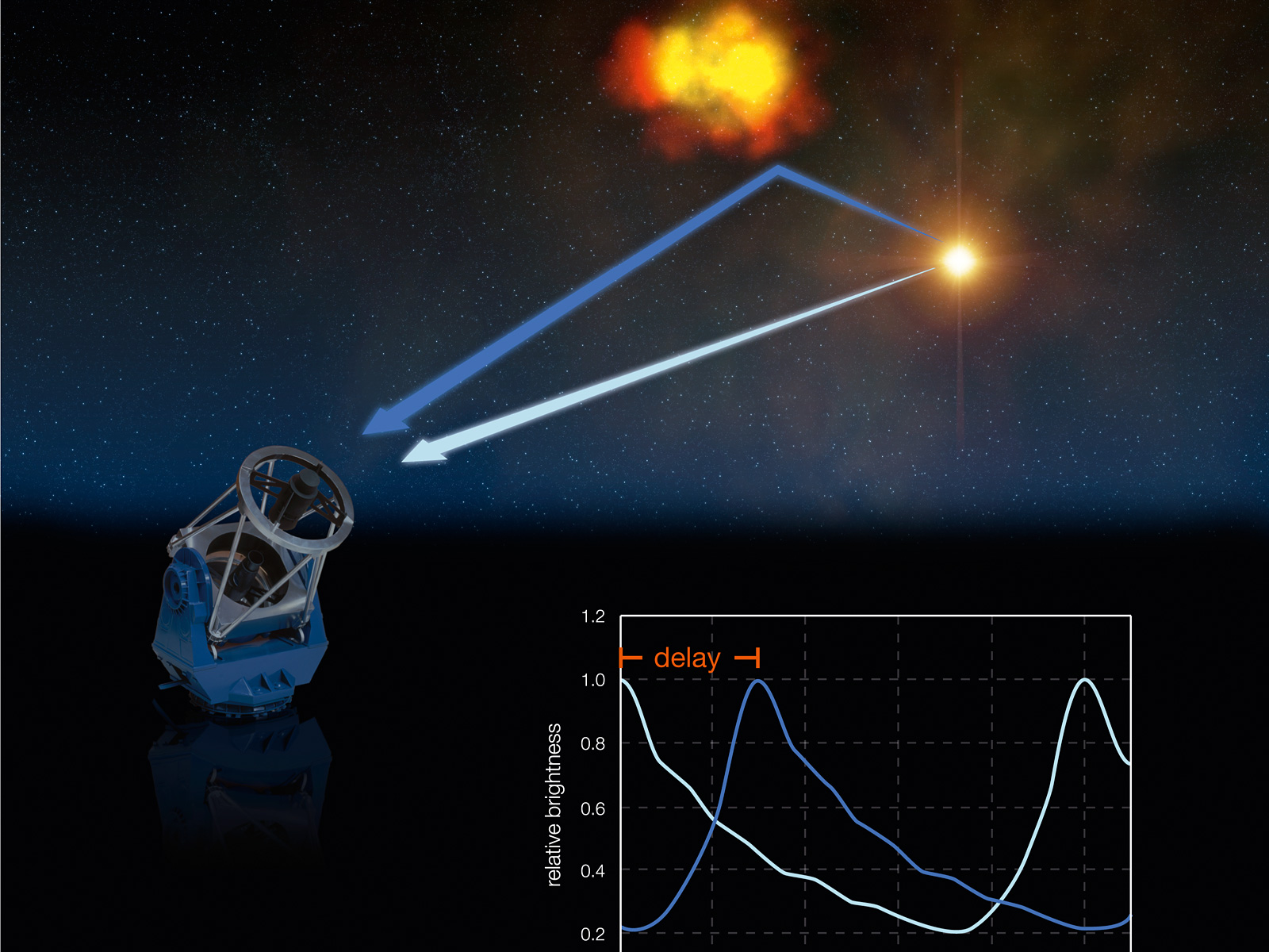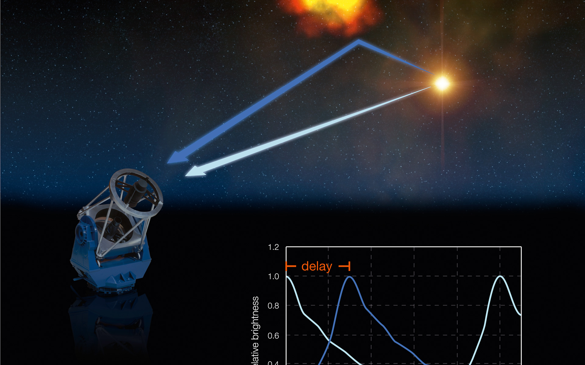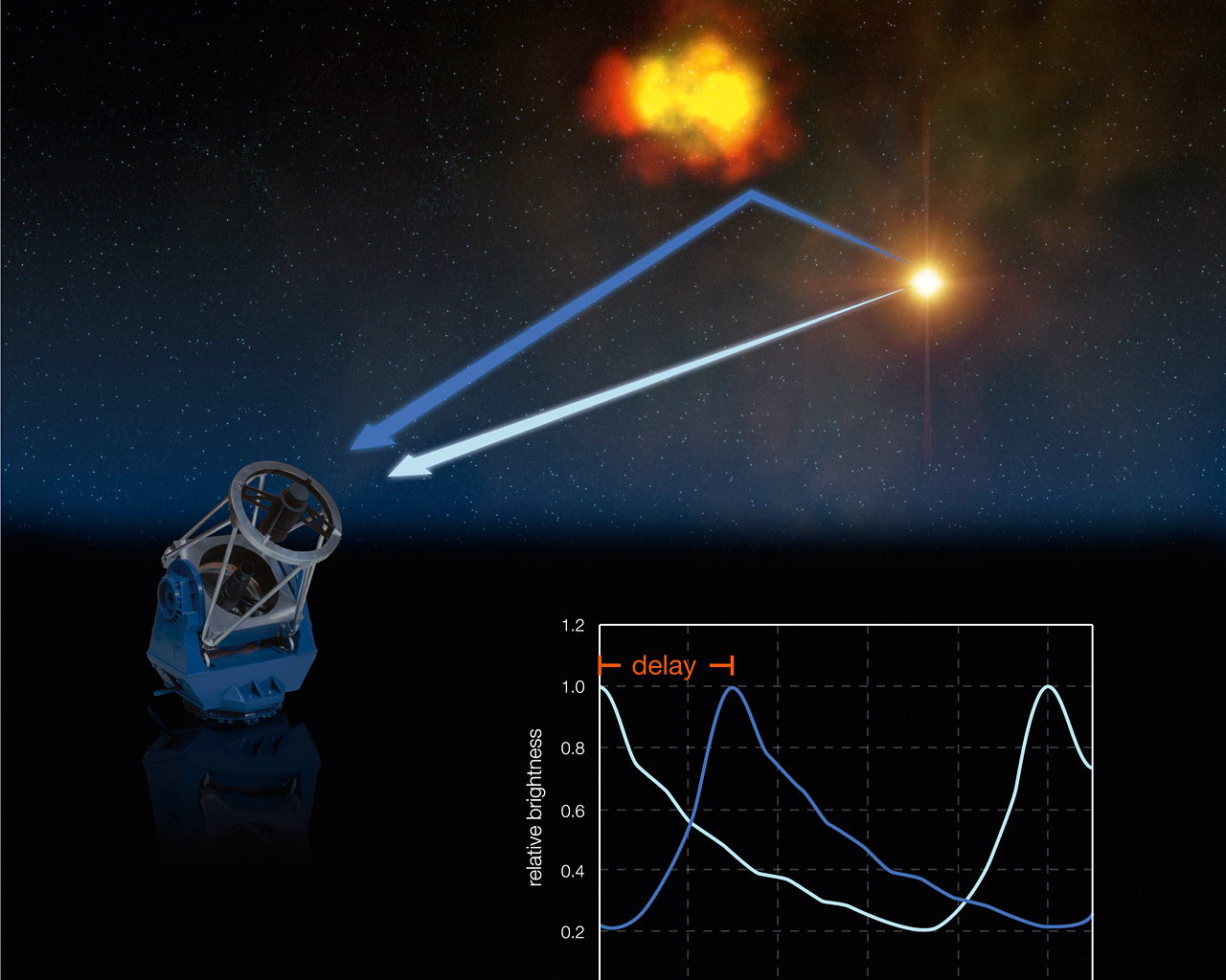 By monitoring the evolution of the brightness of the blobs in the nebula, the astronomers can derive their distance from the star: it is simply the measured delay in time, multiplied by the velocity of light (300,000 km/s). Knowing this distance and the apparent separation on the sky between the star and the blob, one can compute the distance of RS Pup.