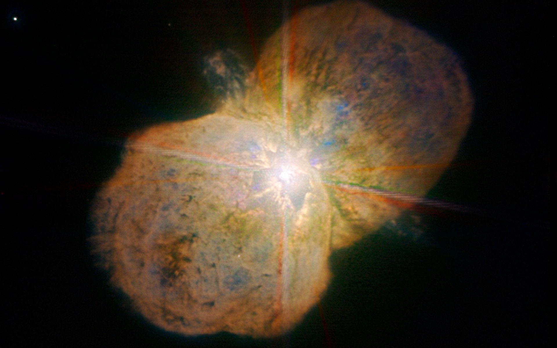 This new image of the luminous blue variable Eta Carinae was taken with the NACO near-infrared adaptive optics instrument on ESO's Very Large Telescope, yielding an incredible amount of detail. The images clearly shows a bipolar structure as well as the jets coming out from the central star. The image was obtained by the Paranal Science team and processed by Yuri Beletsky (ESO) and Hännes Heyer (ESO). It is based on data obtained through broad (J, H, and K; 90 second exposure time per filters) and narrow-bands (1.64, 2.12, and 2.17 microns; probing iron, molecular and atomic hydrogen, respectively; 4 min per filter).