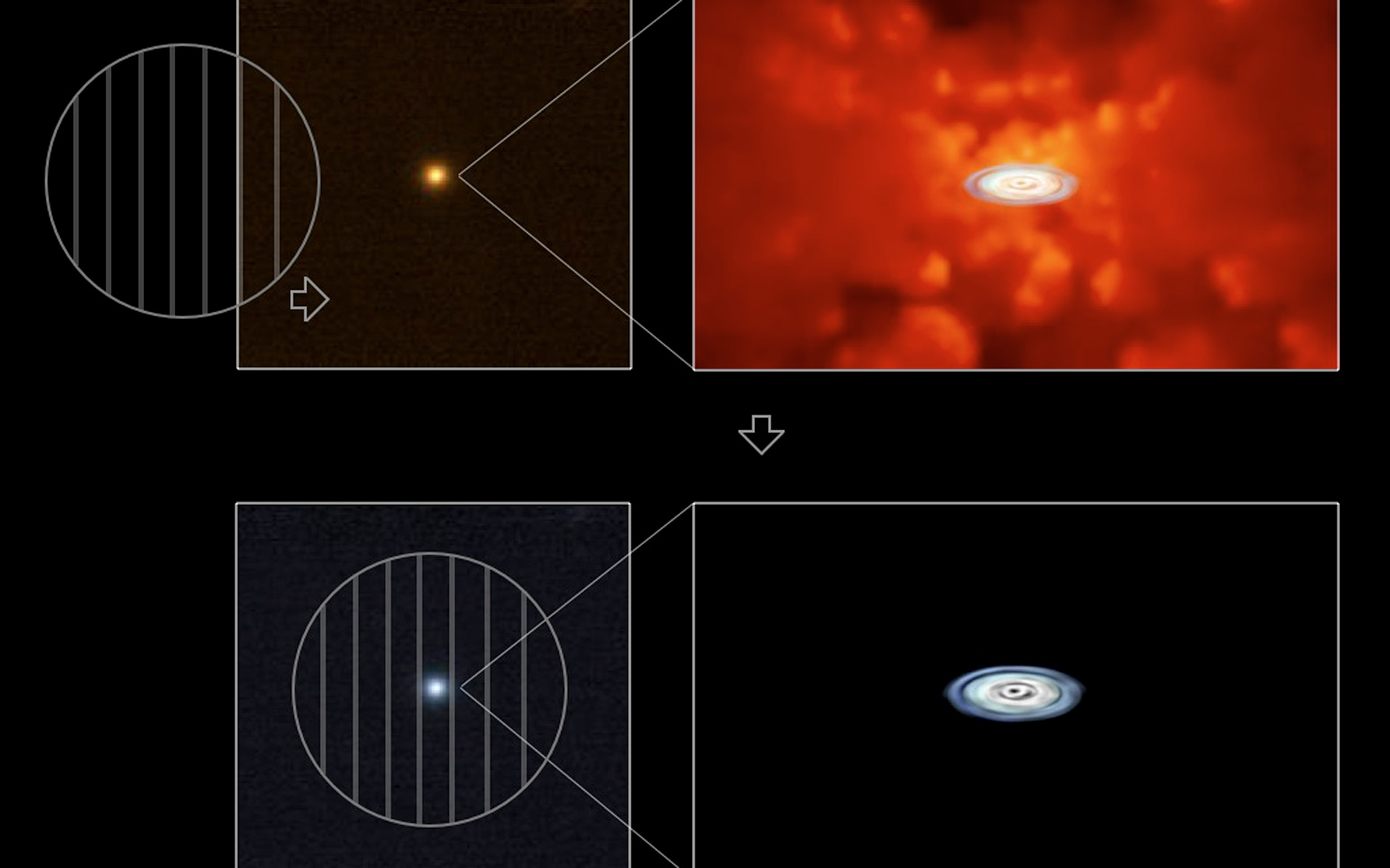 Artist's impression showing the principle followed by the team to uncover the true colour of the quasars' disc. The red star-like object in the upper left panel is one of the quasars observed. The light is thought to originate from an accretion disc around a black hole with a strong contamination from messy dust clouds, as shown by the drawing on the upper-right panel. When the astronomers put a polarising filter in, these clouds are suppressed from view, giving us the true colour of the accretion disc, as shown in the two lower panels. Some of the quasars have a very small amount of scattered light coming from the vicinity of the black hole itself, rather than the clouds of gas and dust around it. This light has become polarised after hitting matter within the disc. By using a filter that only allows this polarised light to come through and blocks out the unpolarised light from the gas clouds, they were able to visually eliminate them and reveal the disc. Figure by M. Kishimoto, with cloud image by M. Schartmann.
