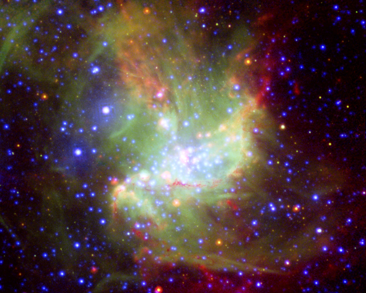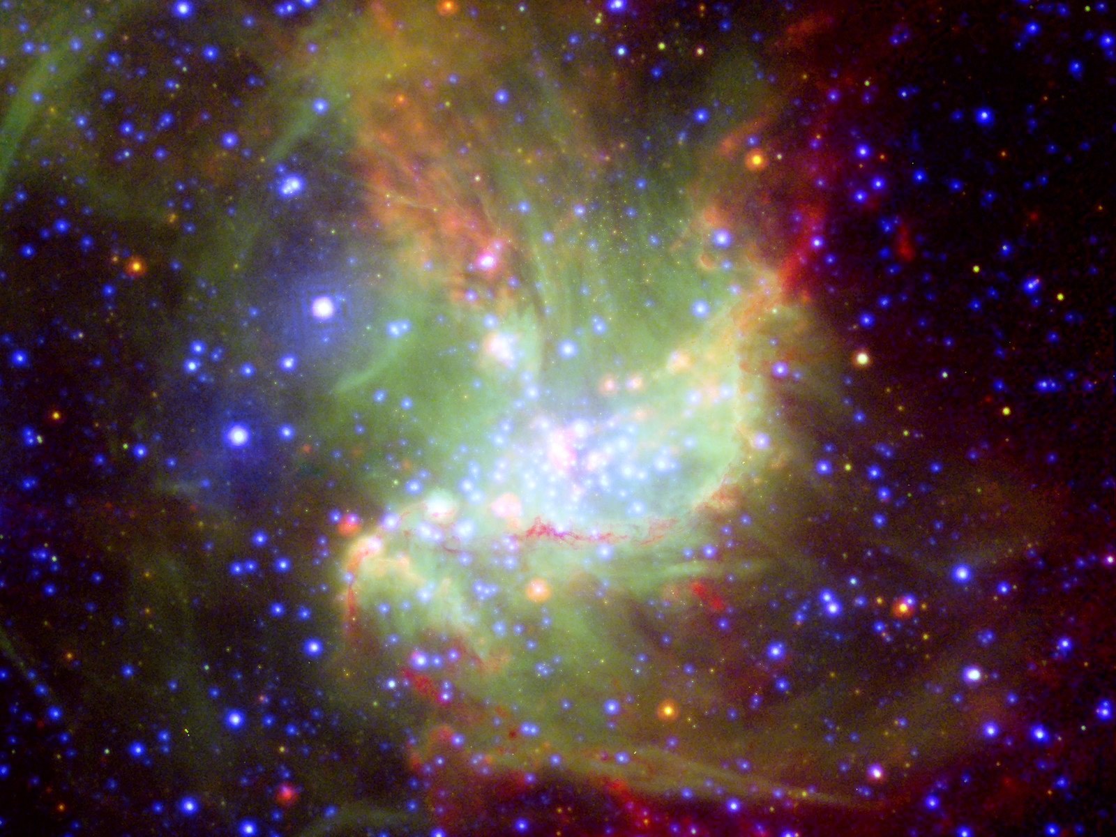 This new portrait of the bright star-forming region NGC 346, in which different wavelengths of light swirl together like watercolours, reveals new information about how stars form. NGC 346 is located 210,000 light-years away in the Small Magellanic Cloud, a neighbouring dwarf galaxy of the Milky Way. The image is based on data from ESA XMM-Newton (X-rays; blue), ESO's New Technology Telescope (visible light; green), and NASA's Spitzer (infrared; red). The infrared light shows cold dust, while the visible light denotes glowing gas, and the X-rays represent very hot gas. Ordinary stars appear as blue spots with white centres, while young stars enshrouded in dust appear as red spots with white centres.