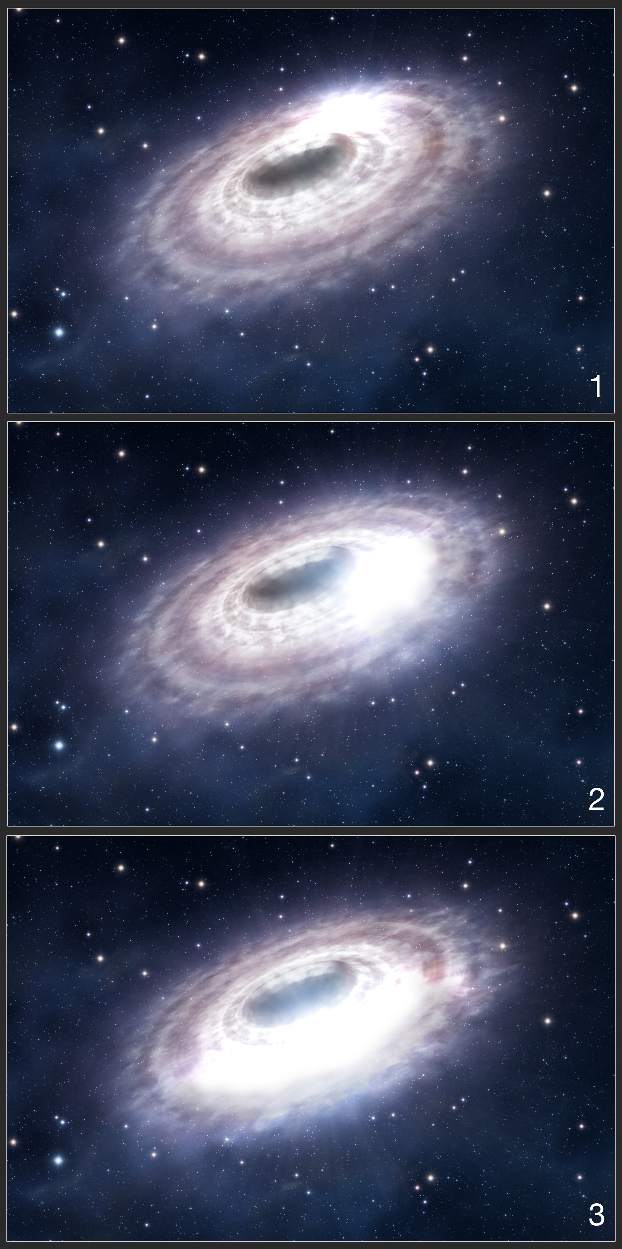 This series of three images shows an artist’s impression of a bright “blob” of gas in the disk of material surrounding the black hole in the centre of our Galaxy, Sagittarius A*. This blob of material is responsible for the flares detected by the researchers. As the blob orbits the black hole, it is stretched out, and this expansion over time causes the delay between flares being detected at near-infrared wavelengths (with the VLT) and at submillimetre wavelengths (with APEX).