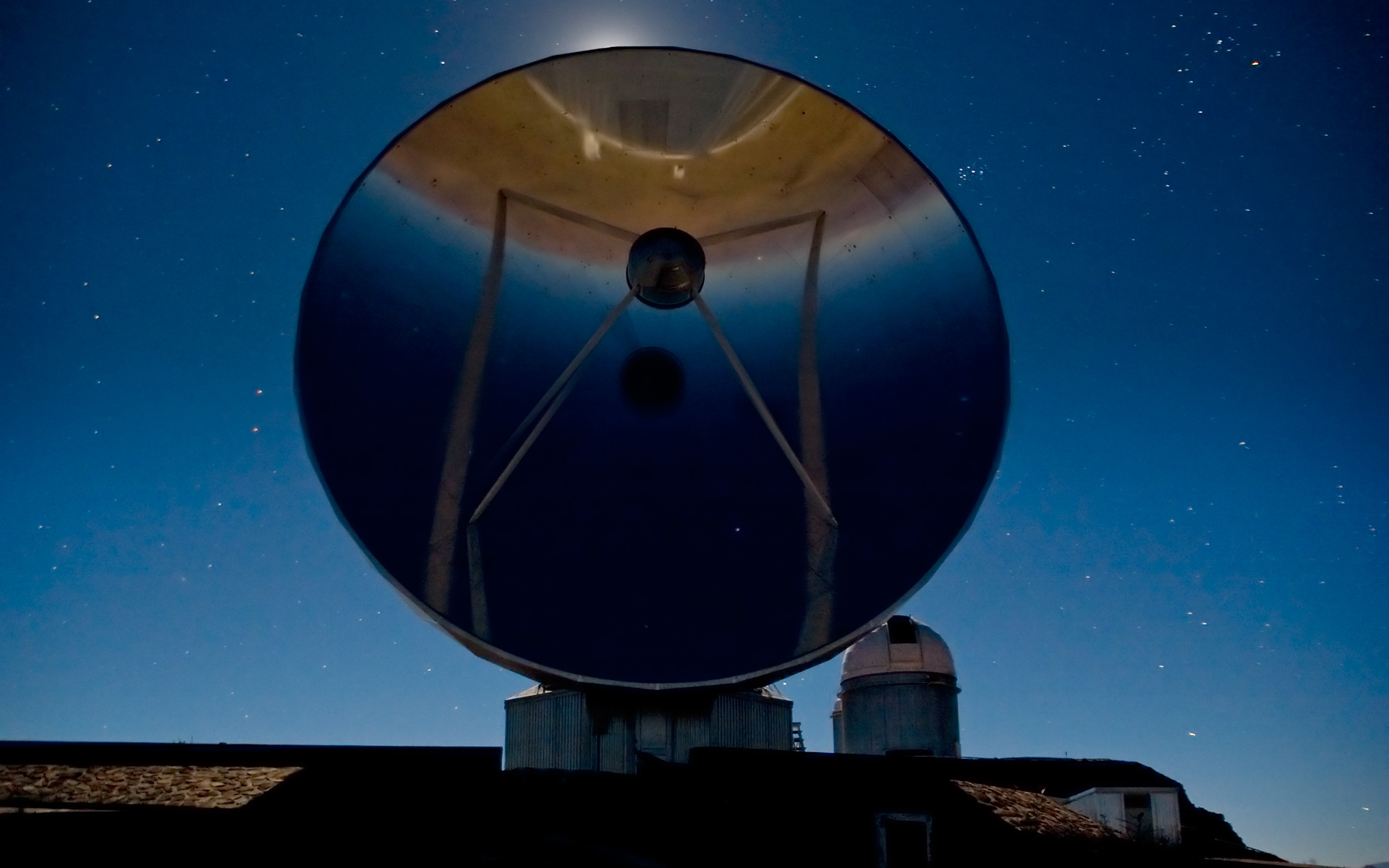 In the centre of the image is the 15-metre dish of the Swedish-ESO Submillimetre Telescope (SEST), backlit by the Moon. On the right, further away, is the dome of the ESO 3.6-metre telescope, at the highest point of the mountain. The reddish star on the top right of the image is Aldebaran, in the constellation of Taurus. The Pleiades star cluster is seen just to the right (2 o'clock position) of SEST. There is an upside-down reflection of the sky and the horizon behind the photographer in the highly polished antenna dish.