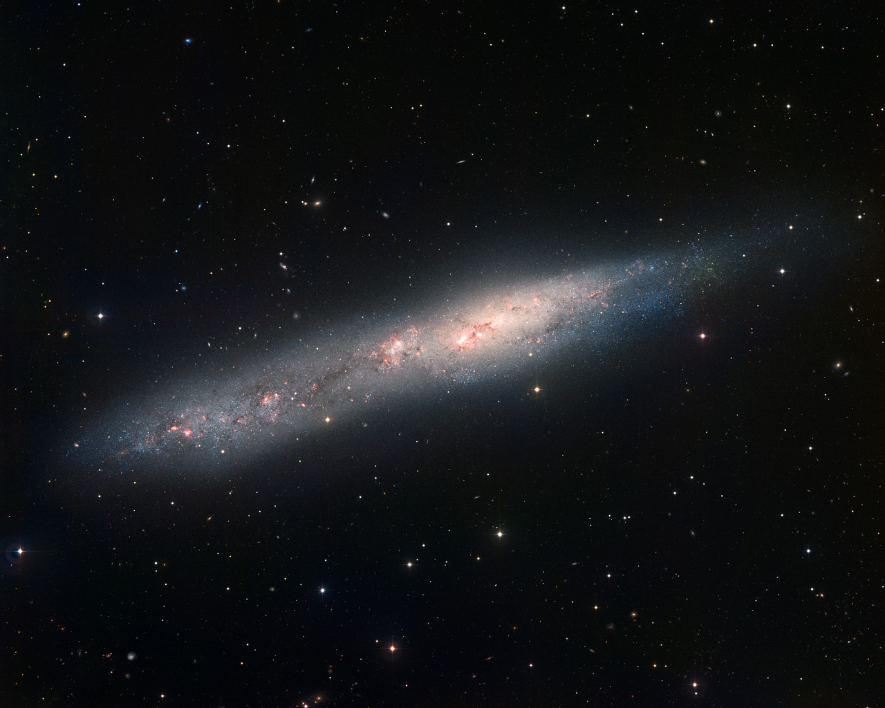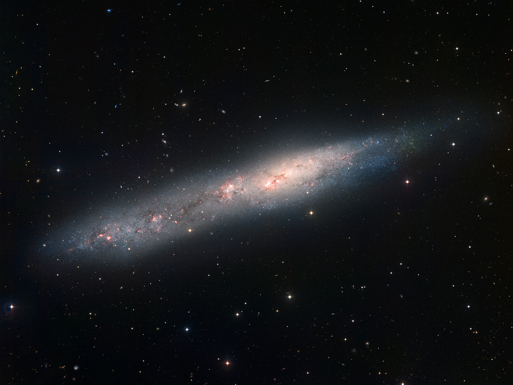 Image of the irregular galaxy NGC 55 obtained with the Wide Field Imager on the 2.2-metre MPG/ESO telescope at ESO La Silla Observatory. The galaxy is about 7.5 million light-years away and 70,000 light-years across. The image is based on data obtained through B, V, and H-alpha filters. North is up, East to the left. The field of view is 30 arcminutes wide.