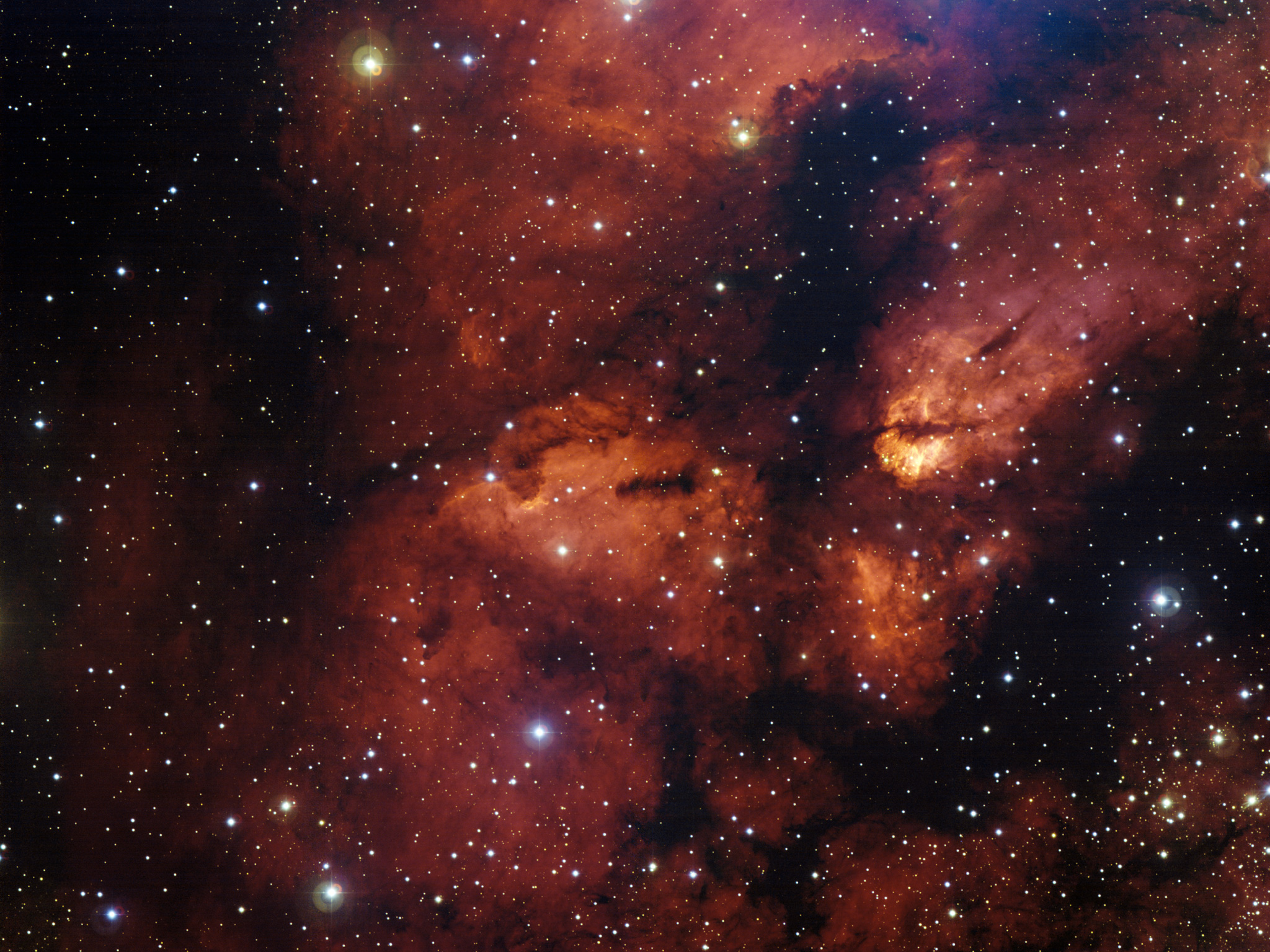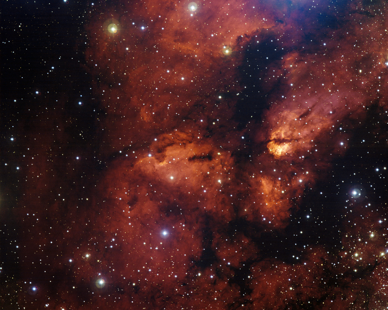The wider region surrounding the star cluster RCW 38, located about 5,500 light years away in the direction of the constellation Vela (the Sails). RCW 38 is an "embedded" cluster, in that the nascent cloud of dust and gas still envelops its stars. There, young, titanic stars bombard fledgling suns and planets with powerful winds and large amount of light, helped in their devastating task by short- lived, massive stars that explode as supernovae. In some cases, this energetic onslaught cooks away the matter that may eventually form new planetary systems. Scientists think that our own Solar System emerged from such a dramatic environment.
