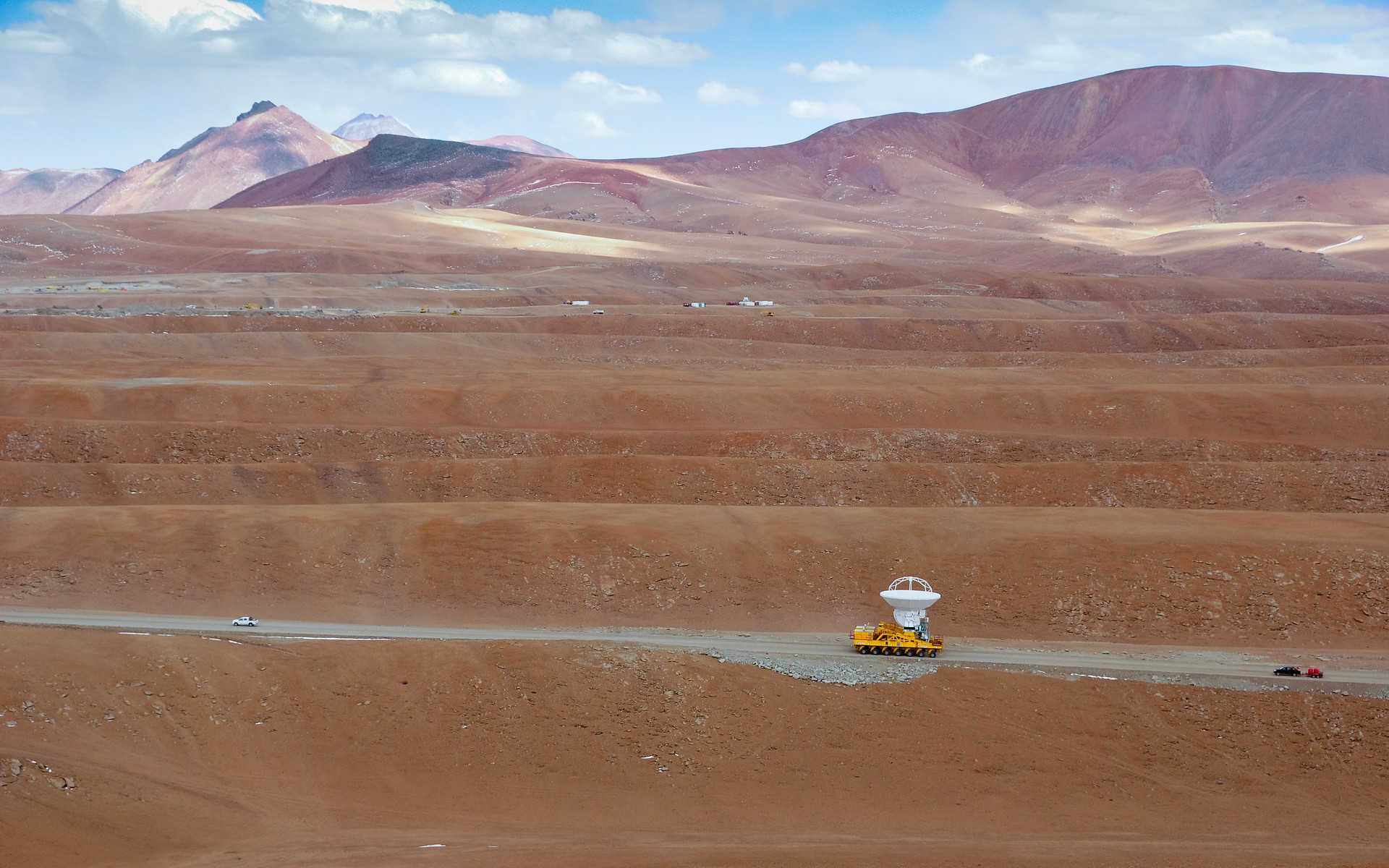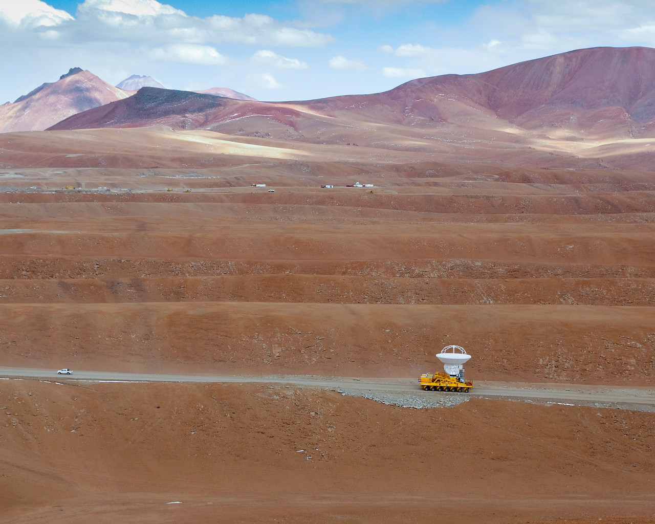 An ALMA antenna en route from the Operations Support Facility to the plateau of Chajnantor for the first time. The ALMA transporter vehicle carefully carries the state-of-the-art antenna, with a diameter of 12 metres and a weight of about 100 tons, on the 28 km journey to the Array Operations Site, which is at an altitude of 5000 m. The antenna is designed to withstand the harsh conditions at the high site, where the extremely dry and rarefied air is ideal for ALMA’s observations of the universe at millimetre- and submillimetre-wavelengths.