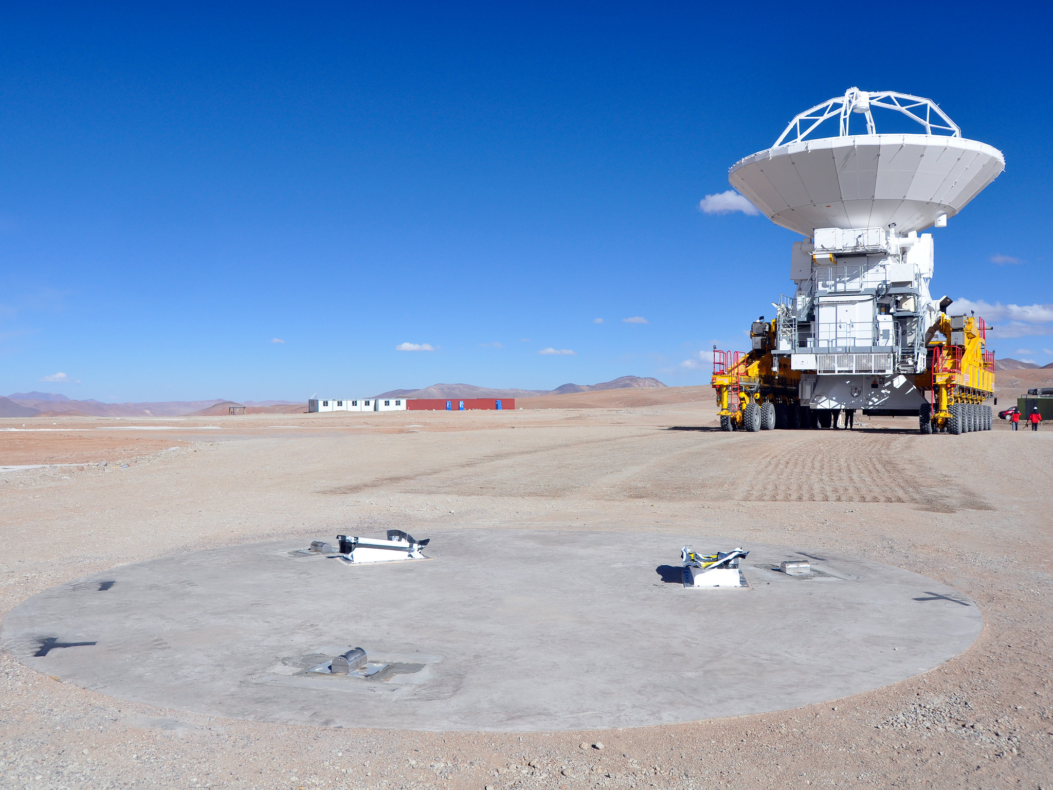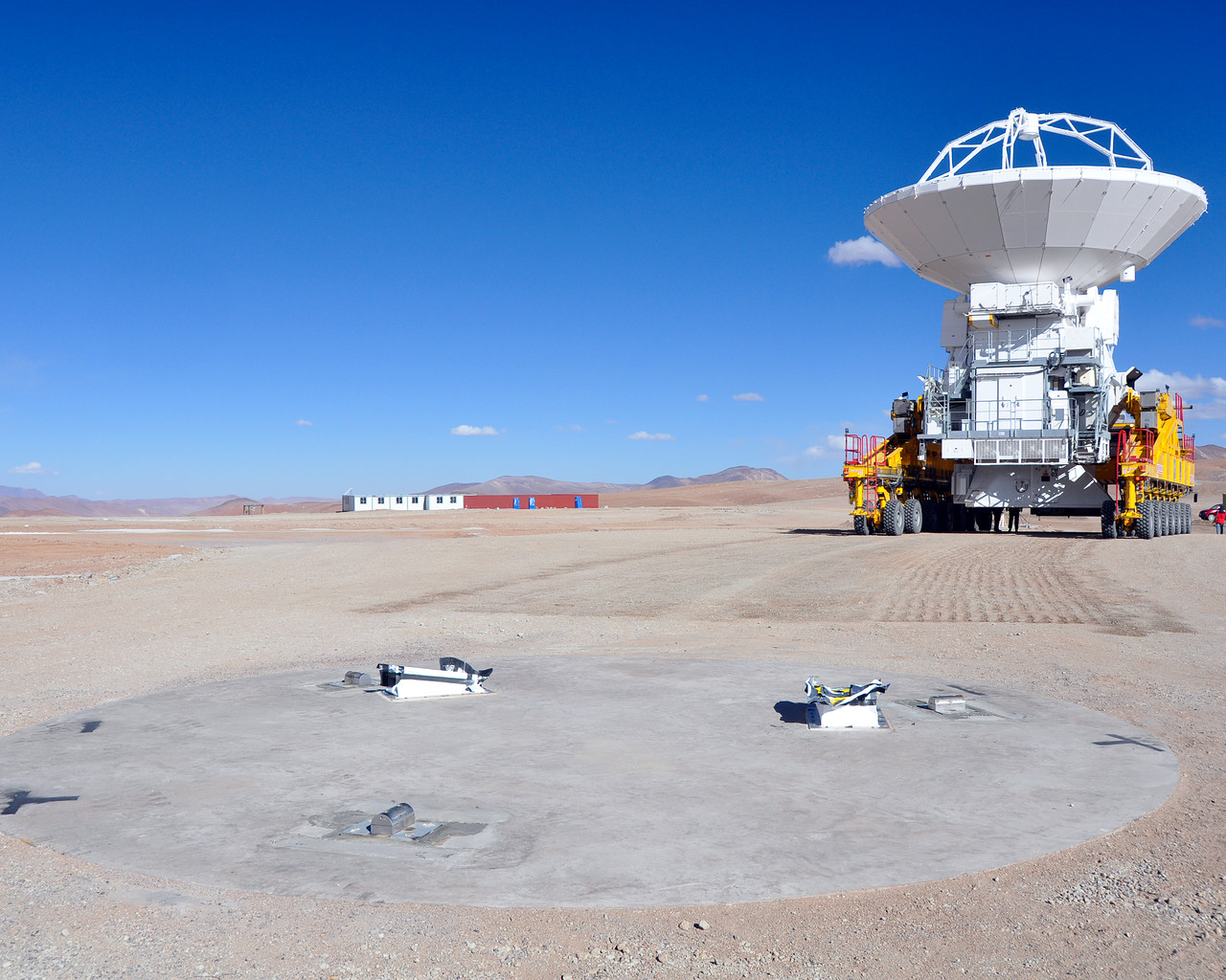 An ALMA antenna arrives on the plateau of Chajnantor from the Operations Support Facility for the first time. The ALMA transporter vehicle carefully and precisely sets the state-of-the-art antenna, with a diameter of 12 metres and a weight of about 100 tons, onto a concrete foundation at the Array Operations Site, which is at an altitude of 5000 m. The antenna is designed to withstand the harsh conditions at the high site, where the extremely dry and rarefied air is ideal for ALMA’s observations of the universe at millimetre- and submillimetre-wavelengths.