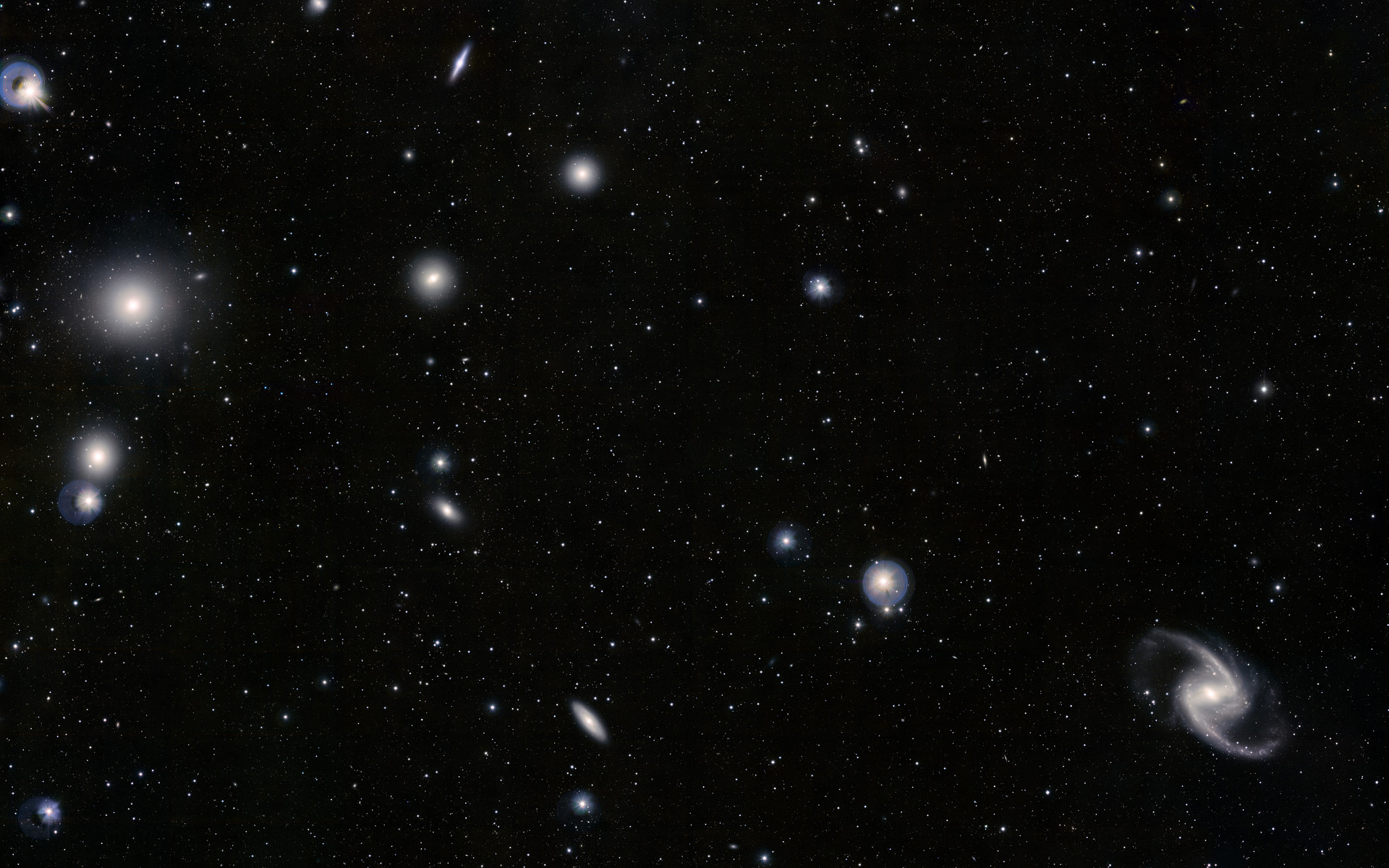 The Fornax Galaxy Cluster is one of the closest of such groupings beyond our Local Group of galaxies. This VISTA image was constructed from images taken through Z, J and Ks filters in the near-infrared part of the spectrum and has captured many of the cluster members in a single image. At the lower-right is the elegant barred-spiral galaxy NGC 1365 and to the left the big elliptical NGC 1399, surrounded by a swarm of faint globular clusters. The image is about 1 degree by 1.5 degrees in extent and the total exposure time was 25 minutes.