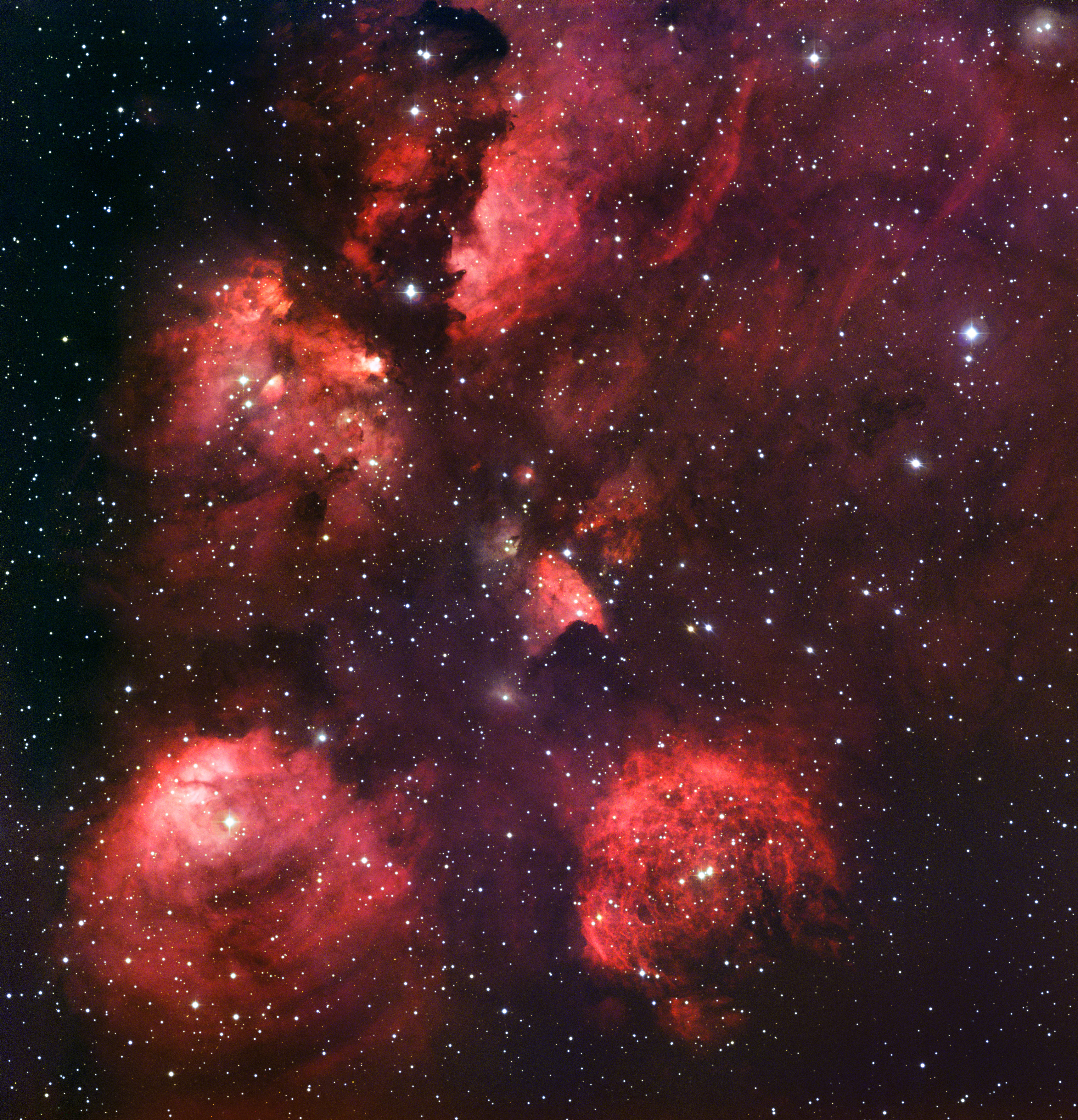The Cat’s Paw Nebula (NGC 6334) is a vast region of star formation. This new portrait of NGC 6334 was created from images taken with the Wide Field Imager instrument at the 2.2-metre MPG/ESO telescope at the La Silla Observatory in Chile, combining images taken through blue, green and red filters, as well as a special filter designed to let through the light of glowing hydrogen. NGC 6334 lies about 5500 light-years from Earth in the constellation of Scorpius. The whole gas cloud is about 50 light-years across.