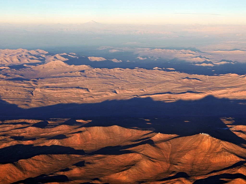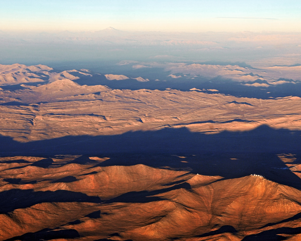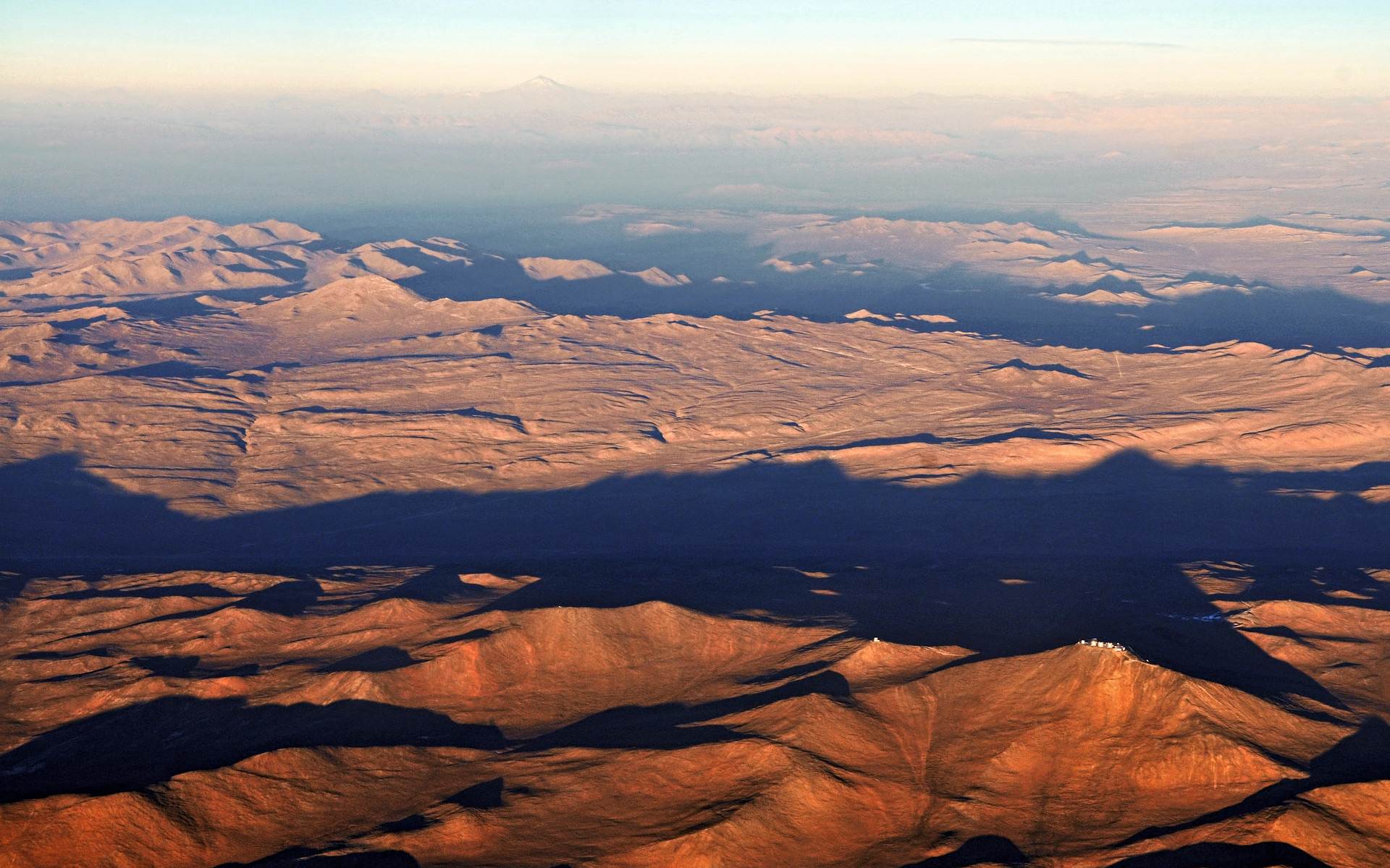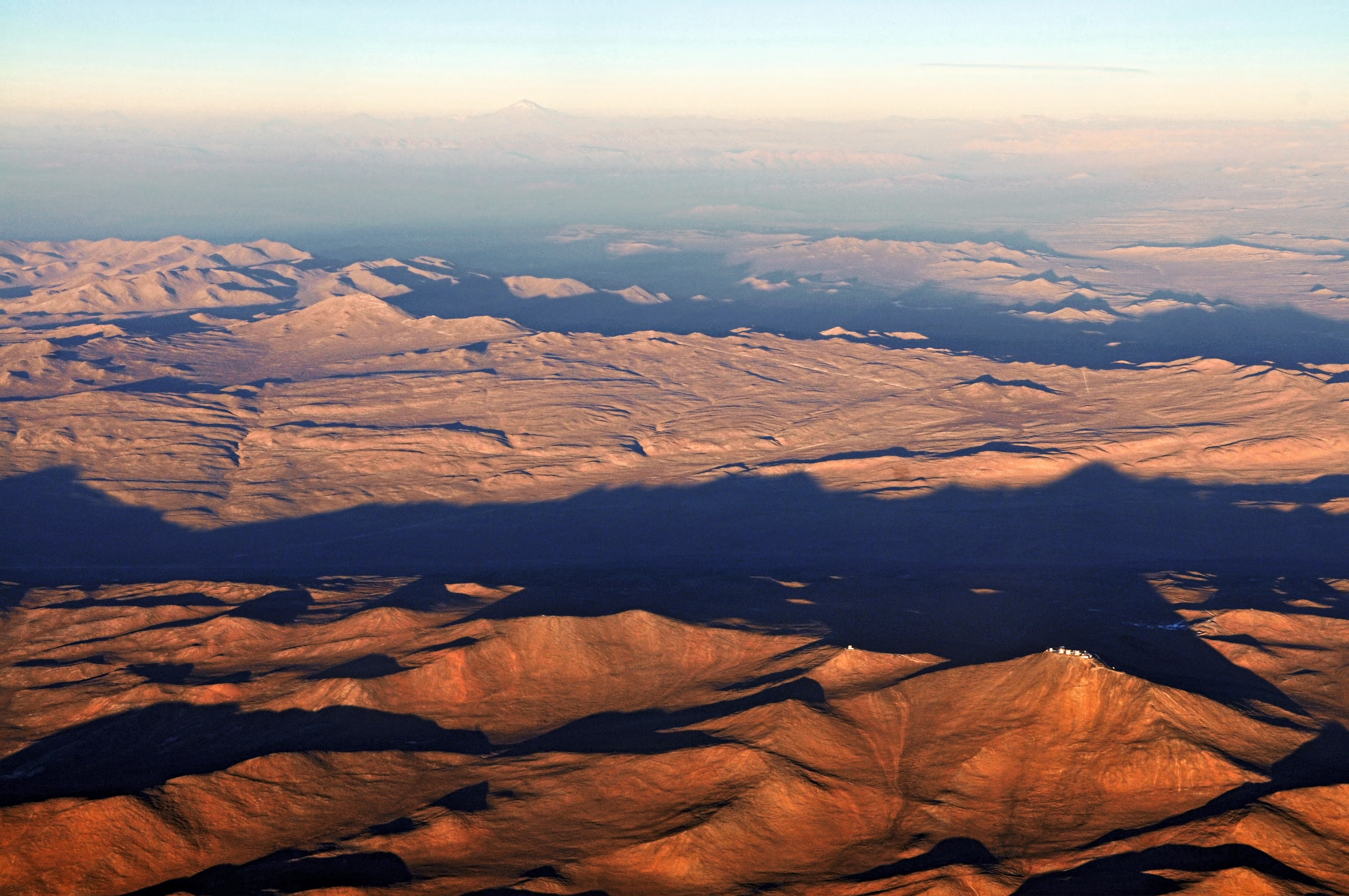 This aerial view shows beautifully the Chilean Atacama Desert around the ESO Paranal Observatory, home to the Very Large Telescope (seen at the bottom right). Close to the VLT, one can see the dome of the VISTA survey telescope, and to the right, the Paranal Residence and basecamp. The high peak in the distance is the 6739-metre high volcano belonging to the Andes, Llullaillaco. Also in the image, to the middle left, one can see an isolated peak with a curvy road leading to its summit. This is Cerro Armazones, the selected home for the future European Extremely Large Telescope (E-ELT).