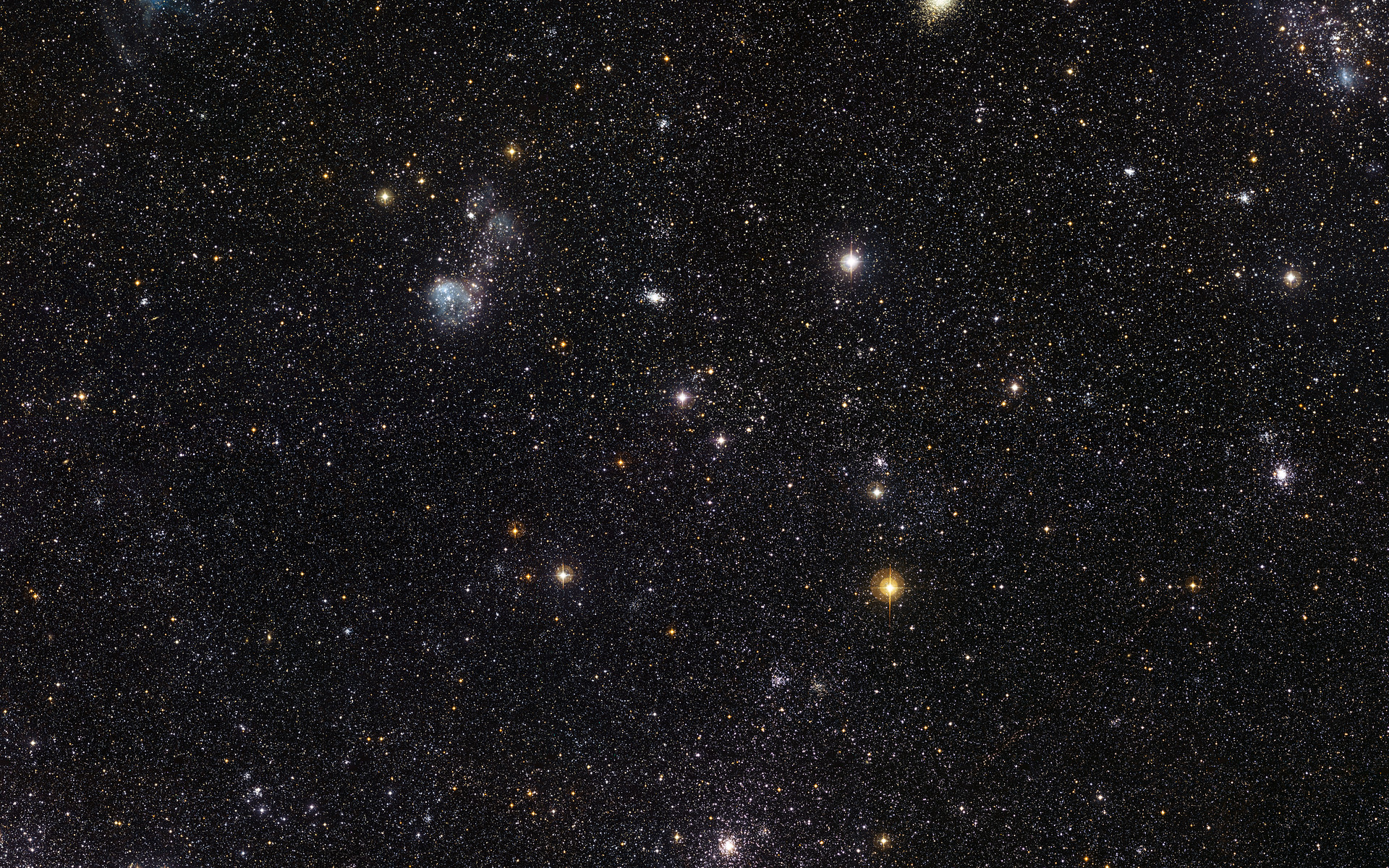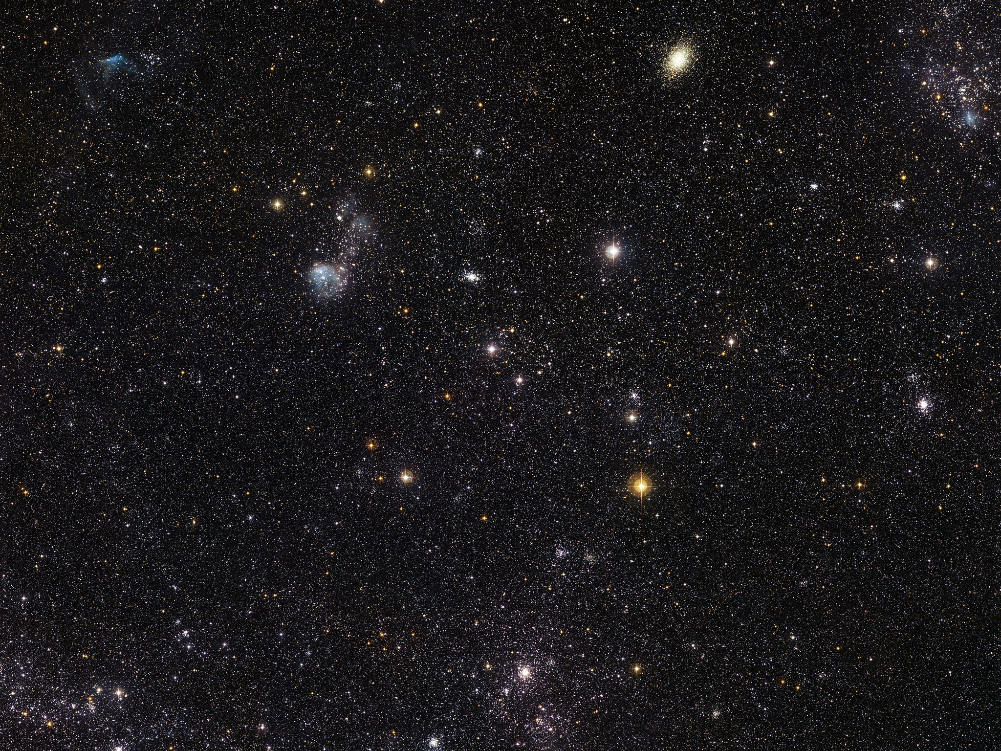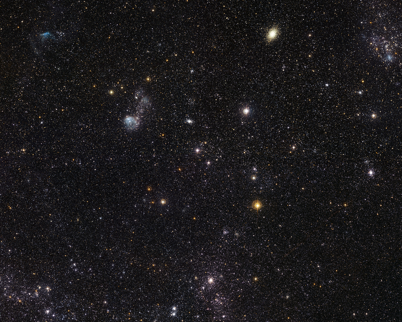 This spectacular new image from the Wide Field Imager on the MPG/ESO 2.2-metre telescope at ESO’s La Silla Observatory in Chile reveals a celestial menagerie of different objects and phenomena in part of the Large Magellanic Cloud, a small companion galaxy to our own Milky Way. Many clusters are visible including an unusually young globular cluster and the remains of a brilliant supernovae explosion. The field of view is about one degree across.