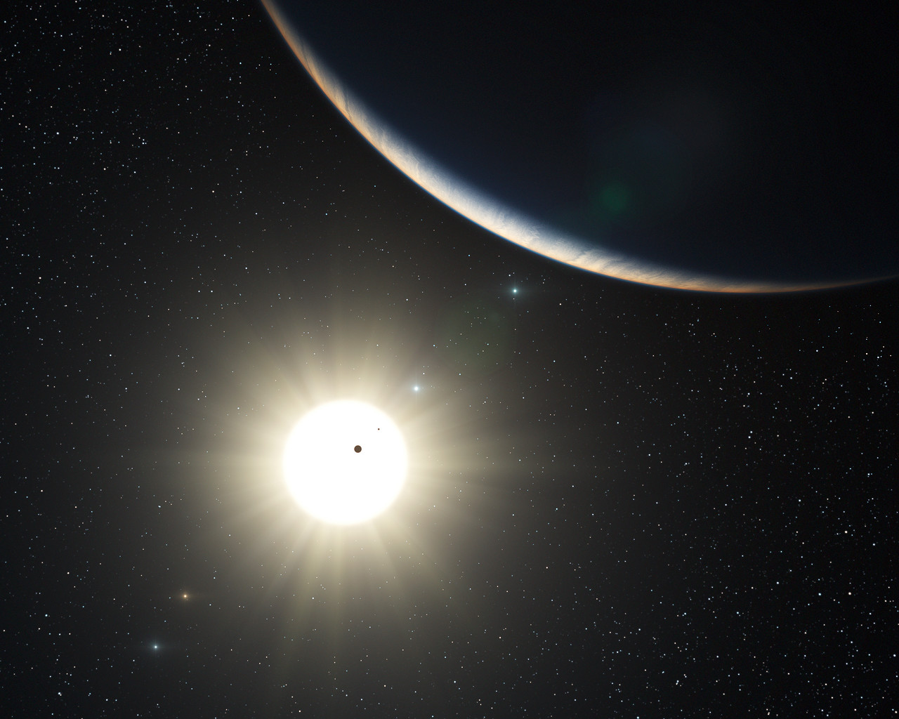 This artist’s impression shows the remarkable planetary system around the Sun-like star HD 10180. Observations with the HARPS spectrograph, attached to ESO’s 3.6-metre telescope at La Silla, Chile, have revealed the definite presence of five planets and evidence for two more in orbit around this star. This system is similar to the Solar System in terms of number of planets and the presence of a regular pattern in the sizes of the orbits. If confirmed the closest planet detected would be the lightest yet known outside the Solar System, with a mass that could be only about 1.4 times that of the Earth.